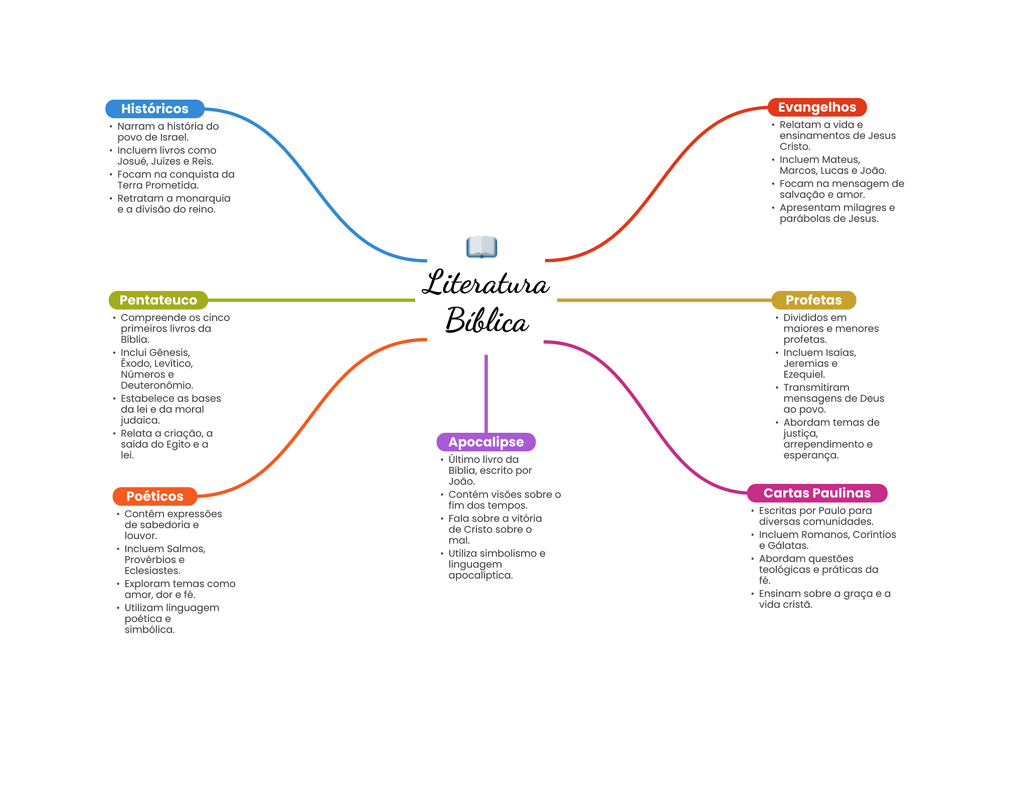 Históricos Evangelhos Narram a história do Relatam a vida e povo de Israel. ensinamentos de Jesus Incluem livros como Cristo. Josué, Juízes e Reis. Incluem Mateus, Focam na conquista da Marcos, Lucas e João. Terra Prometida. Focam na mensagem de Retratam a monarquia salvação e amor. e a divisão do reino. Apresentam milagres e parábolas de Jesus. Literatura Pentateuco Profetas Compreende OS cinco Bíblica Divididos em primeiros livros da maiores e menores Bíblia. profetas. Inclui Gênesis, Incluem Isaías, Levítico, Jeremias e Números e Ezequiel. Deuteronômio. Transmitiram Estabelece as bases mensagens de Deus da lei e da moral ao povo. judaica. Abordam temas de Relata a criação, a justiça, saída do Egito e a Apocalipse arrependimento e lei. Último livro da esperança. Bíblia, escrito por João. Poéticos Contém visões sobre O Cartas Paulinas fim dos tempos. Contêm expressões Escritas por Paulo para Fala sobre a vitória de sabedoria e diversas comunidades. de Cristo sobre louvor. Incluem Romanos, Coríntios mal. Incluem Salmos, e Gálatas. Utiliza simbolismo e Provérbios e linguagem Abordam questões Eclesiastes. apocaliptica. teológicas e práticas da Exploram temas como fé. amor, dor e fé. Ensinam sobre a graça e a Utilizam linguagem vida cristã. poética e simbólica.