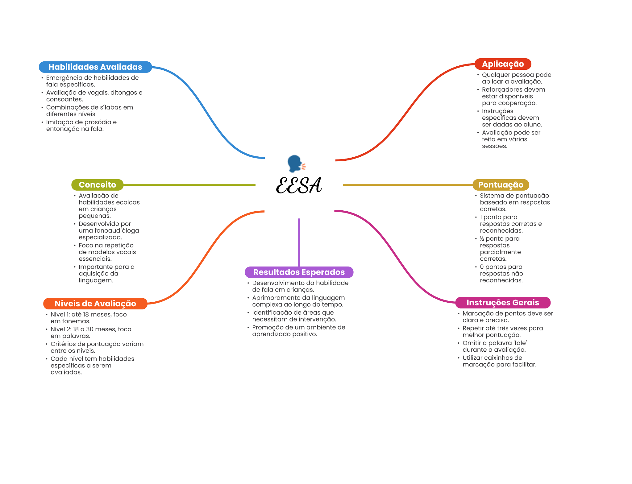 Habilidades Avaliadas Aplicação Emergência de habilidades de Qualquer pessoa pode fala específicas. aplicar a avaliação. Avaliação de vogais, ditongos e Reforçadores devem consoantes. estar disponíveis para cooperação. Combinações de sílabas em diferentes níveis. Instruções específicas devem Imitação de prosódia e ser dadas ao aluno. entonação na fala. Avaliação pode ser feita em várias sessões. Conceito EESA Pontuação Avaliação de Sistema de pontuação habilidades ecoicas baseado em respostas em crianças corretas. pequenas. 1 ponto para Desenvolvido por respostas corretas e uma fonoaudióloga reconhecidas. especializada. ½ ponto para Foco na repetição respostas de modelos vocais parcialmente essenciais. corretas. Importante para a 0 pontos para aquisição da Resultados Esperados respostas não linguagem. Desenvolvimento da habilidade reconhecidas. de fala em crianças. Aprimoramento da linguagem Níveis de Avaliação complexa ao longo do tempo. Instruções Gerais Nível 1: até 18 meses, foco Identificação de áreas que Marcação de pontos deve ser em fonemas. necessitam de intervenção. clara e precisa. Nível 2: 18 a 30 meses, foco Promoção de um ambiente de Repetir até três vezes para em palavras. aprendizado positivo. melhor pontuação. Critérios de pontuação variam Omitir a palavra 'fale' entre níveis. durante a avaliação. Cada nível tem habilidades Utilizar caixinhas de específicas a serem marcação para facilitar. avaliadas.