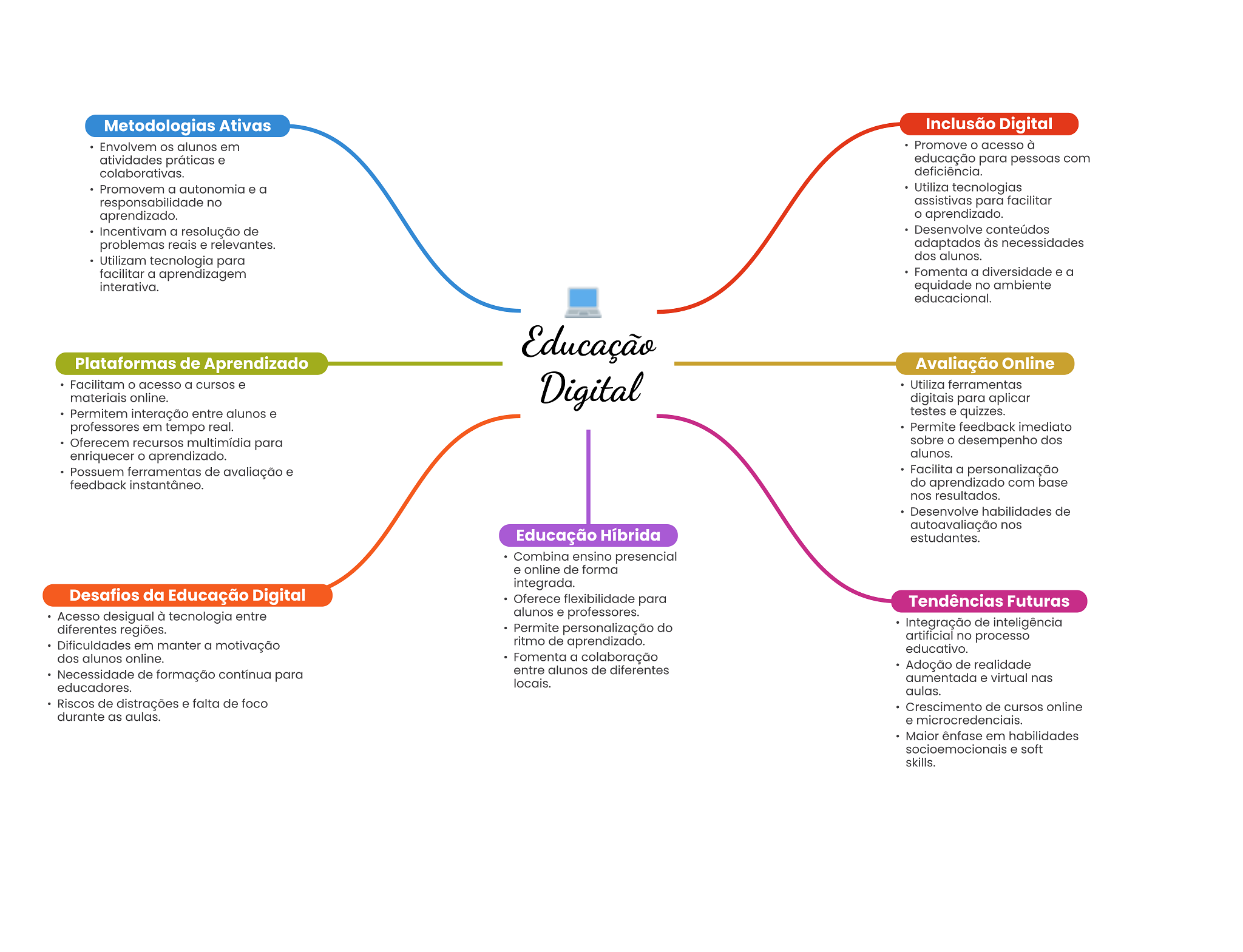 Metodologias Ativas Inclusão Digital Envolvem alunos em Promove acesso à atividades práticas e educação para pessoas com colaborativas. deficiência. Promovem a autonomia e a Utiliza tecnologias responsabilidade no assistivas para facilitar aprendizado. aprendizado. Incentivam a resolução de Desenvolve conteúdos problemas reais e relevantes. adaptados às necessidades Utilizam tecnologia para dos alunos. facilitar a aprendizagem interativa. equidade no ambiente educacional. Educação Plataformas de Aprendizado Avaliação Online Facilitam acesso a cursos e Digital Utiliza ferramentas materiais online. digitais para aplicar Permitem interação entre alunos e testes e quizzes. professores em tempo real. Permite feedback imediato Oferecem recursos multimídia para sobre O desempenho dos enriquecer aprendizado. alunos. Possuem ferramentas de avaliação e Facilita a personalização feedback instantâneo. do aprendizado com base nos resultados. Desenvolve habilidades de autoavaliação nos Educação Híbrida estudantes. Combina ensino presencial e online de forma integrada. Desafios da Educação Digital Oferece flexibilidade para Tendências Futuras Acesso desigual à tecnologia entre alunos e professores. diferentes regiões. Permite personalização do Integração de inteligência Dificuldades em manter a motivação ritmo de aprendizado. artificial no processo educativo. dos alunos online. Fomenta a colaboração entre alunos de diferentes Adoção de realidade Necessidade de formação contínua para educadores. locais. aumentada e virtual nas aulas. Riscos de distrações e falta de foco Crescimento de cursos online durante as aulas. e microcredenciais. Maior ênfase em habilidades socioemocionais e soft skills.