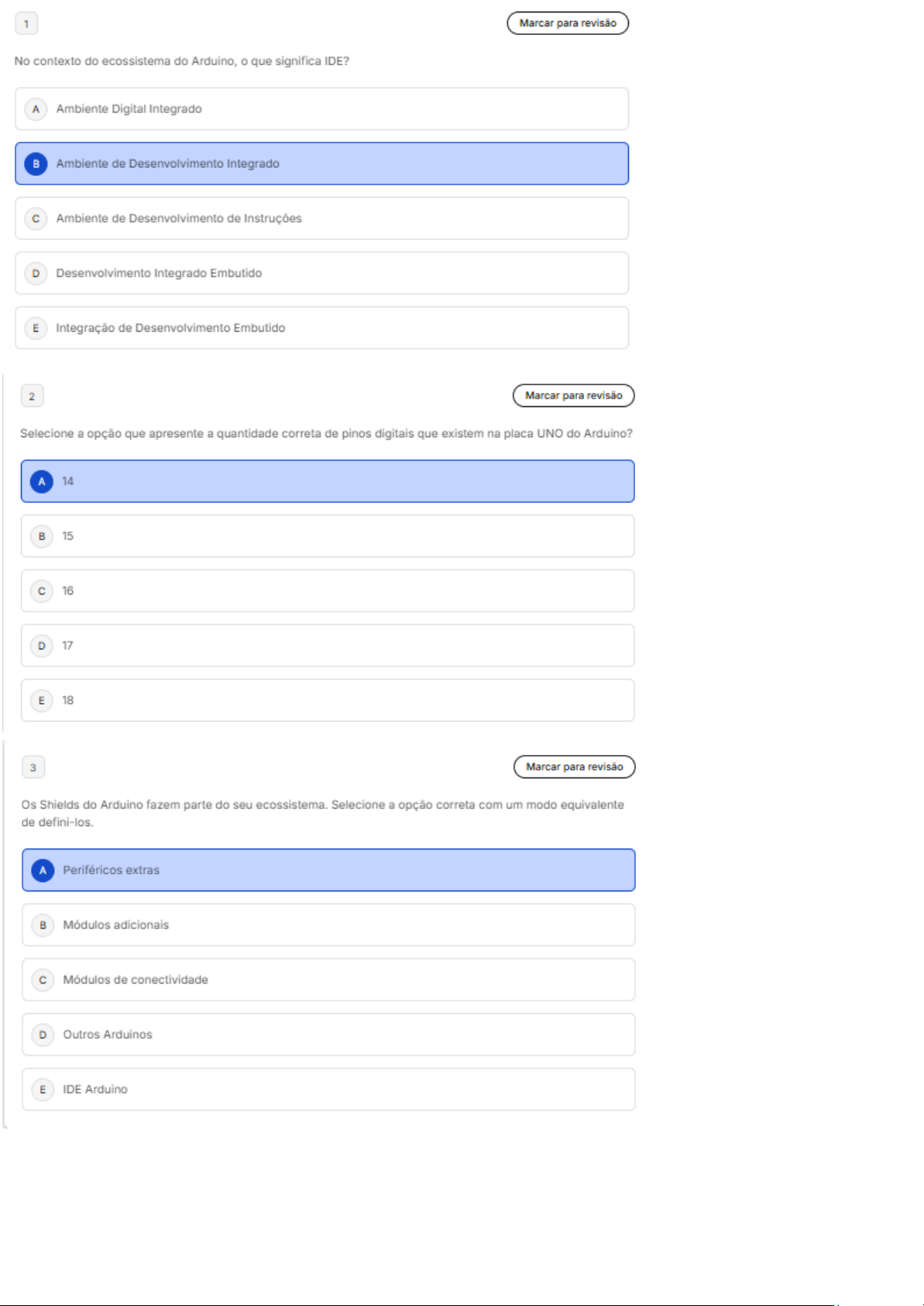 1 Marcar para revisão No contexto do ecossistema do Arduino, o que significa IDE? A Ambiente Digital Integrado Ambiente de Desenvolvimento Integrado Ambiente de Desenvolvimento de Instruções D Desenvolvimento Integrado Embutido E Integração de Desenvolvimento Embutido 2 Marcar para revisão Selecione a opção que apresente a quantidade correta de pinos digitais que existem na placa UNO do Arduino? A 14 15 C 16 D 17 E 18 3 Marcar para revisão Os Shields do Arduino fazem parte do seu ecossistema. Selecione a opção correta com um modo equivalente de defini-los. A Periféricos extras Módulos adicionais C Módulos de conectividade D Outros Arduinos E IDE Arduino4 Marcar para revisão Em relação ao Arduino, selecione a opção errada sobre 0 seu ecossistema. A As placas Arduino são capazes de ler sinais de entrada analógica ou digital de diferentes sensores. Arduino IDE usa uma versão simplificada de C++, tornando mais fácil aprender a programar. o Arduino fornece um fator de forma padrão que divide as funções do microcontrolador em um C pacote mais acessível. Arduino é uma plataforma de código proprietário usada apenas para aplicações de Internet das D Coisas. E É possível interagir com Arduino com um programa em Python. 5 Marcar para revisão Qual sistema em cibersegurança é responsável por monitorar e registrar comportamento em uma rede? A Sistema de detecção de intrusão Sistema de desativação de serviços não seguros C Sistema de firewall D Sistema de criptografia E Sistema gerador de senhas 6 Marcar para revisão Uma tentativa de prejudicar, danificar ou causar ameaça a um sistema em rede é denominada como A Roubo de sistema. Ataque cibernético. C Crime cibernético. D Crime digital. E Ataque sistemático.7 Marcar para revisão Qual das opções define principal benefício da simulação na Indústria 4.0? A aumento na segurança da rede. A diminuição na vulnerabilidade da operação. A otimização dos processos de produção. D A facilitação dos mecanismos de pós-venda. E A diminuição dos dados para processamento em tempo real. 8 Marcar para revisão Em relação às características de computação em nuvem, marque a alternativa correta. A Difícil acesso por causa da segurança instalada. Caracteriza-se por disponibilizar máquinas físicas dedicadas. C faturamento é feito de acordo com o número de máquinas físicas dedicadas ao cliente. D Caracteriza-se pela capacidade de self-service. E cliente precisa prever com antecedência a necessidade de escalar seus recursos.10 Marcar para revisão Sobre a plataforma IBM Cloud, veja as proposições a seguir: I) Os seguintes grupos de serviços estão disponíveis através do Console: Compute, Blockchain, Databases, Containers e Developer Tools. II) Grandes empresas podem barganhar termos melhores junto à plataforma. III) Oferece o grupo de serviços chamado de Tecnologias Quânticas A opção que contém todas as assertivas corretas é: A B II. D I, e III. E III.Gabarito da prova Nota Confira o gabarito da prova de Aplic. De Cloud, lot e Indústria 4.0 Em Python 0,8/1,0 Realizada em 22/01/2026 o conteúdo do gabarito é apresentado de maneira resumida para preservar a integridade do nosso banco de questões. Questão Enunciado Sua resposta Resposta correta Tema Consultar 4 DESENVOLVIMENTO 1 Correta No contexto do Ambiente de Ambiente de DE APLICAÇÕES ecossistema do Desenvolvimento Desenvolvimento USANDO PLATAFORMAS o ID: Arduino, o que signi... Integrado Integrado DE MIDDLEWARE PARA IOT EM PYTHON 4 DESENVOLVIMENTO 2 Correta Selecione a opção que DE APLICAÇÕES apresente a quantidade 14 14 USANDO PLATAFORMAS o ID: 65b11f54eccdbbbddeae9fa3 corre... DE MIDDLEWARE PARA IOT EM PYTHON 4 DESENVOLVIMENTO 3 Incorreta Os Shields do Arduino DE APLICAÇÕES fazem parte do seu Periféricos extras Módulos adicionais USANDO PLATAFORMAS o ID: 65b12cd1eccdbbbddeb14e56 DE MIDDLEWARE PARA IOT EM PYTHON 4 DESENVOLVIMENTO 4 Correta Em relação ao Arduino, Arduino é uma Arduino é uma DE APLICAÇÕES selecione a opção plataforma de código plataforma de código USANDO PLATAFORMAS ID: 65b1399aeccdbbbddeb3bf63 errada proprietário proprietário DE MIDDLEWARE PARA IOT EM PYTHON 5 Correta Qual sistema em 5 PRINCÍPIOS E Sistema de detecção de Sistema de detecção de cibersegurança é TECNOLOGIAS DA o intrusão intrusão ID: 65b112beeccdbbbddeabee31 responsável por INDÚSTRIA 4.0 6 Correta Uma tentativa de 5 PRINCÍPIOS E prejudicar, danificar ou Ataque cibernético. Ataque cibernético. TECNOLOGIAS DA o ID: causar a... INDÚSTRIA 4.0 7 Correta Qual das opções define 5 PRINCÍPIOS E A otimização dos A otimização dos principal benefício da TECNOLOGIAS DA ID: 65b11816eccdbbbddead4158 processos de produção. processos de produção. si... INDÚSTRIA 8 Correta Em relação às Caracteriza-se pela Caracteriza-se pela 6 INTEGRAÇÃO COM características de capacidade de self- capacidade de self- SISTEMAS DE CLOUD o ID: computação em nuv... service. service. PARA IOT 9 Correta Em relação à indústria Convergência de loT, Convergência de loT, 6 INTEGRAÇÃO COM 4.0, marque a Analytics e Machine Analytics e Machine SISTEMAS DE CLOUD o ID: alternativa C... Learning... PARA IOT 10 Incorreta Sobre a plataforma IBM 6 INTEGRAÇÃO COM Cloud, veja as II. I, III. SISTEMAS DE CLOUD ID: 6873caa4c083fee20c904685 PARA IOT