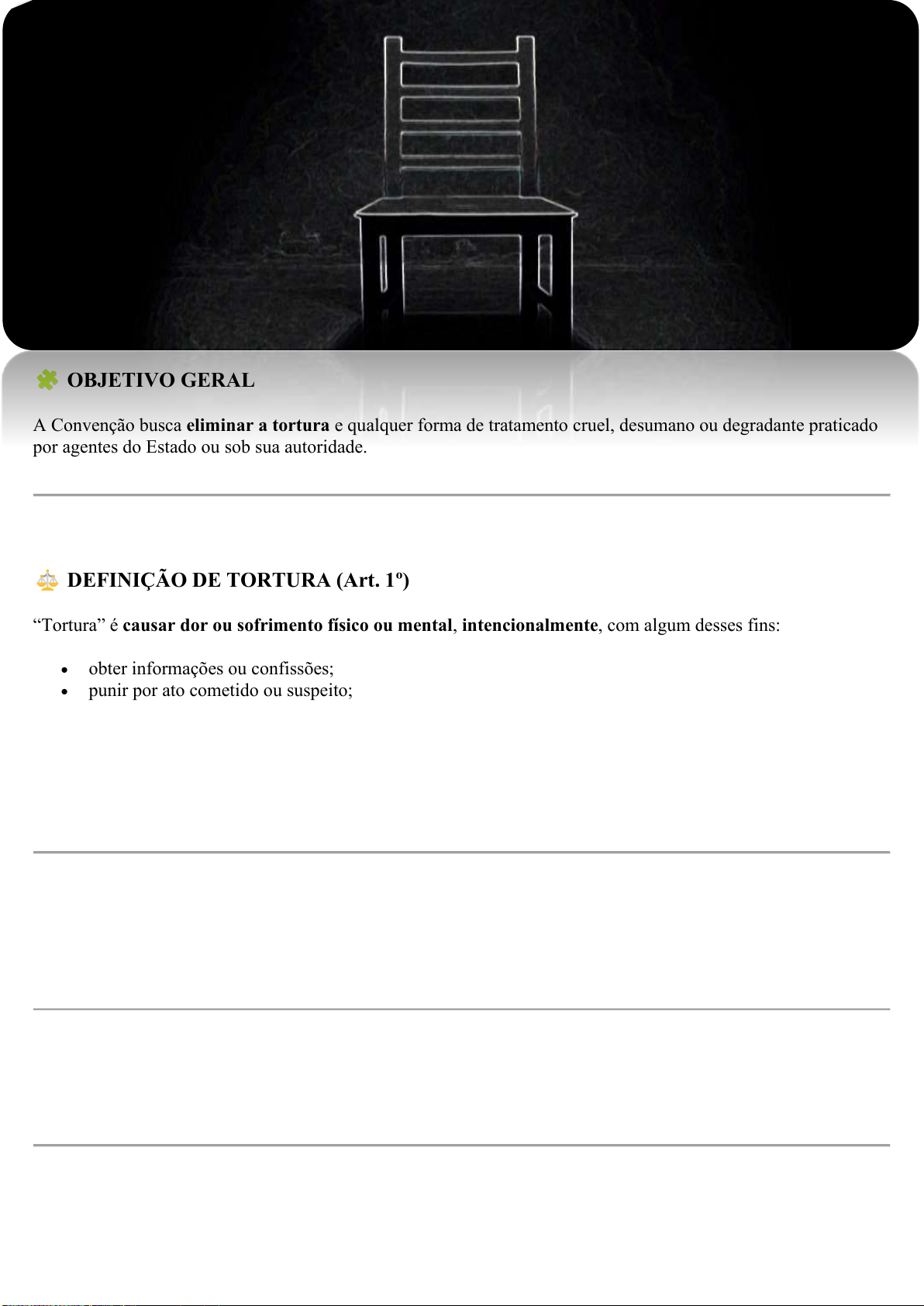 OBJETIVO GERAL A Convenção busca eliminar a tortura e qualquer forma de tratamento cruel, desumano ou degradante praticado por agentes do Estado ou sob sua autoridade. DEFINIÇÃO DE TORTURA (Art. 1º) “Tortura” é causar dor ou sofrimento físico ou mental, intencionalmente, com algum desses fins: • obter informações ou confissões; • punir por ato cometido ou suspeito; • intimidar ou coagir alguém; • discriminar. Só é tortura quando há envolvimento direto ou indireto de agente público. Não inclui dores decorrentes de sanções legais legítimas (ex: pena de prisão). PROIBIÇÃO ABSOLUTA (Art. 2º) • Nenhuma situação (guerra, emergência, ordens superiores) justifica a tortura. • Nenhum agente pode alegar “ordem do chefe” como desculpa. PROTEÇÃO INTERNACIONAL (Art. 3º) Um Estado não pode extraditar, entregar ou expulsar pessoa para país onde ela possa ser torturada. RESPONSABILIZAÇÃO (Arts. 4º–9º) • Tortura é crime grave no direito interno. • Estados devem punir autores, cúmplices e quem tentar praticar. • O país pode julgar casos que envolvam: o crime cometido em seu território, o nacional seu como autor ou vítima, o autor encontrado em seu território (mesmo estrangeiro). • A tortura é motivo para extradição e cooperação internacional em investigações. PREVENÇÃO (Arts. 10–11) • A proibição da tortura deve ser ensinada a: o policiais, militares, agentes penitenciários, médicos e funcionários públicos. • O Estado deve supervisionar rotinas de prisão e interrogatório para prevenir abusos. INVESTIGAÇÃO E QUEIXA (Arts. 12–13) • Suspeita de tortura → investigação imediata e rigorosa. • Vítimas têm direito de denunciar e devem ser protegidas de represálias. REPARAÇÃO (Art. 14) A vítima tem direito à indenização e reabilitação completa. Se morrer, o direito passa aos herdeiros. PROVAS (Art. 15) Declarações obtidas sob tortura não podem ser usadas como prova, exceto para punir o torturador. OUTRAS PENAS CRUÉIS (Art. 16) Os Estados também devem proibir tratamentos degradantes ou desumanos, mesmo que não se encaixem tecnicamente em “tortura”. COMITÊ CONTRA A TORTURA (Arts. 17–24) • Formado por 10 especialistas independentes. • Fiscaliza o cumprimento da Convenção. • Analisa relatórios periódicos dos países. • Pode investigar práticas sistemáticas de tortura e receber denúncias entre Estados ou de indivíduos, se o país permitir. DISPOSIÇÕES FINAIS (Arts. 25–33) • Aberta a todos os Estados-membros da ONU. • Entra em vigor 30 dias após 20 ratificações. • Permite reservas e denúncia (saída) mediante notificação à ONU. • Textos oficiais em várias línguas (inclusive português). EM CONCURSOS Cai muito em: • Direitos Humanos; • Legislação Internacional; • Ética e conduta de agentes públicos; • Questões de extradição e provas ilícitas. PRIMEIRA PARTE – Definições, Obrigações e Punições Artigo 1º – Definição de Tortura Tortura é qualquer ato que cause dor ou sofrimento físico ou mental, intencionalmente, para: • obter informação ou confissão; • punir por ato cometido ou suspeito; • intimidar ou coagir; • discriminar alguém. Tem que haver envolvimento estatal: agente público, pessoa agindo por ordem ou com consentimento do Estado. Não é tortura: sofrimento decorrente de sanção legal legítima (ex: pena de prisão). Cai muito em prova: “Toda dor causada por agente público é tortura?” → Não, só se for intencional e com finalidade específica. Artigo 2º – Proibição Absoluta • Os Estados devem adotar leis e medidas para impedir a tortura. • Nenhuma situação (guerra, emergência, ameaça, ordem superior) justifica a tortura. • “Cumpri ordens” não é defesa válida. Pegadinha: “Em caso de guerra, a tortura pode ser admitida para salvar vidas?” → Nunca. Artigo 3º – Proibição de Extradição com Risco de Tortura • Nenhum país pode expulsar, extraditar ou entregar alguém a outro Estado onde possa ser torturado. • As autoridades devem avaliar se há violações sistemáticas de direitos humanos no país de destino. Exemplo: O Brasil não pode extraditar alguém para um país onde presos políticos sofrem tortura. Artigo 4º – Tipificação Penal • A tortura deve ser crime no direito interno de cada país. • Inclui tentativa, cumplicidade e participação. • As penas devem ser proporcionais à gravidade. Concurso gosta de confundir: “Somente o autor direto é punido?” → Também o cúmplice e quem tentar praticar. Artigo 5º – Competência Penal Os Estados devem poder julgar casos quando: 1. O crime ocorreu em seu território; 2. O autor é seu nacional; 3. A vítima é seu nacional (se o Estado achar adequado); 4. O autor está no país e não foi extraditado. Resumo: princípio da universalidade limitada — o torturador pode ser julgado em qualquer país que o encontrar. Artigo 6º – Prisão e Inquérito • Se houver suspeita, o Estado deve prender o acusado e iniciar inquérito preliminar. • O detido tem direito de contatar seu consulado. • O Estado deve notificar outros países envolvidos (do autor, da vítima etc.). Exemplo de prova: “O Estado deve prender preventivamente qualquer suspeito de tortura que estiver em seu território?” → Sim, quando as circunstâncias justificarem. Artigo 7º – Julgamento ou Extradição • Se o Estado não extraditar, deve julgar o caso. • O acusado tem direito a processo justo. Resumo: Aut dedere aut judicare (“ou extradita ou julga”). Artigo 8º – Extradição • Tortura é crime extraditável. • Mesmo sem tratado, a Convenção serve de base jurídica para extraditar. • Pode ser tratada como crime cometido tanto no local quanto no país que julga. Pegadinha comum: “Sem tratado não há extradição por tortura.” → A Convenção autoriza. Artigo 9º – Cooperação Internacional Os 
