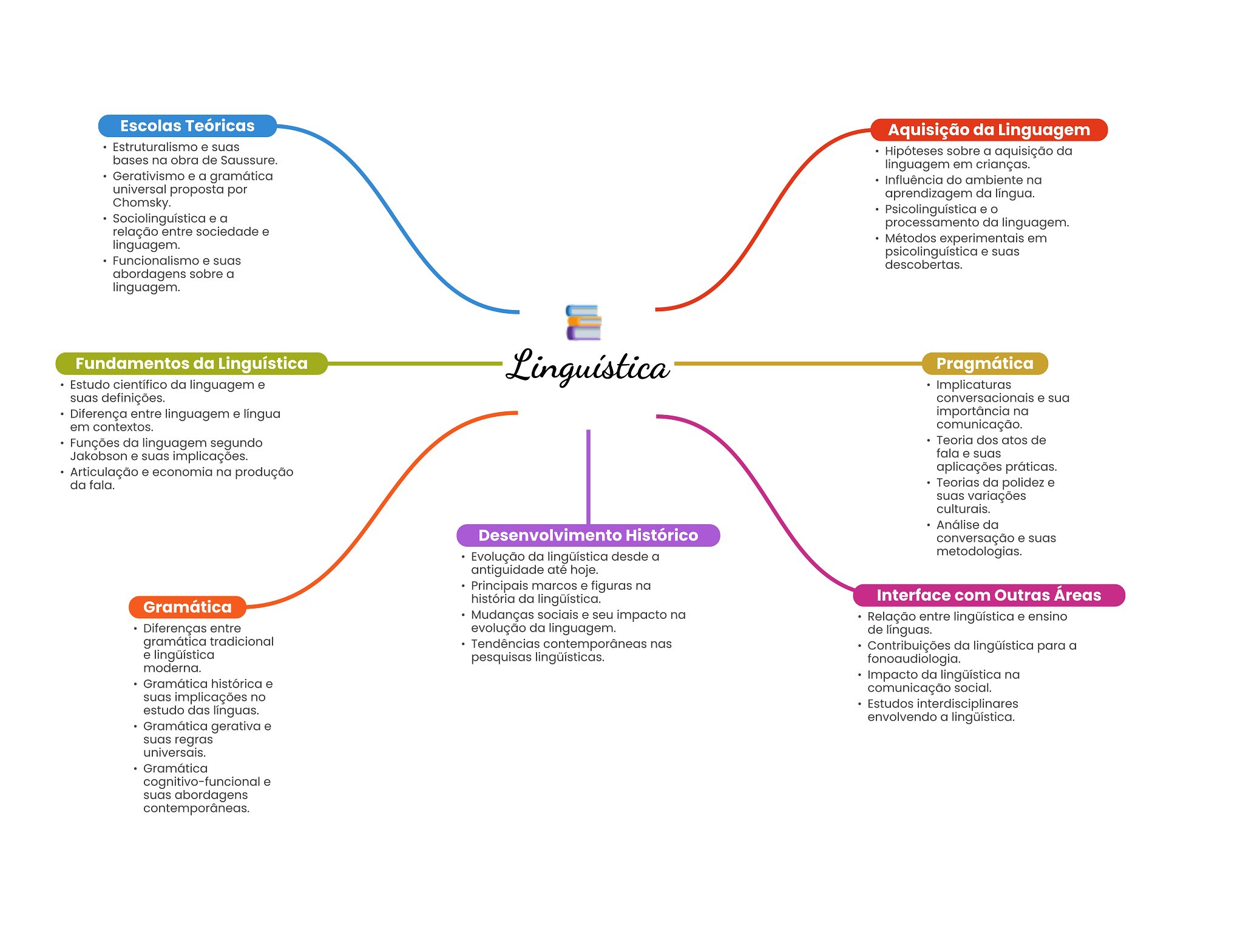 Escolas Teóricas Aquisição da Linguagem Estruturalismo e suas Hipóteses sobre a aquisição da bases na obra de Saussure. linguagem em crianças. Gerativismo e a gramática Influência do ambiente na universal proposta por aprendizagem da língua. Chomsky. Psicolinguística e Sociolinguística e a processamento da linguagem. relação entre sociedade e linguagem. Métodos experimentais em psicolinguística e suas Funcionalismo e suas descobertas. abordagens sobre a linguagem. Fundamentos da Linguística Linguística Pragmática Estudo científico da linguagem e Implicaturas suas definições. conversacionais e sua Diferença entre linguagem e língua importância na em contextos. comunicação. Funções da linguagem segundo Teoria dos atos de Jakobson e suas implicações. fala e suas Articulação e economia na produção aplicações práticas. da fala. Teorias da polidez e suas variações culturais. Análise da Desenvolvimento Histórico conversação e suas Evolução da lingüística desde a metodologias. antiguidade até hoje. Principais marcos e figuras na história da lingüística. Interface com Outras Áreas Gramática Mudanças sociais e seu impacto na Relação entre lingüística e ensino Diferenças entre evolução da linguagem. de línguas. gramática tradicional Tendências nas Contribuições da lingüística para a e lingüística pesquisas lingüísticas. fonoaudiologia. moderna. Impacto da lingüística na Gramática histórica e comunicação social. suas implicações no estudo das línguas. Estudos interdisciplinares envolvendo a lingüística. Gramática gerativa e suas regras universais. Gramática cognitivo-funcional e suas abordagens contemporâneas.