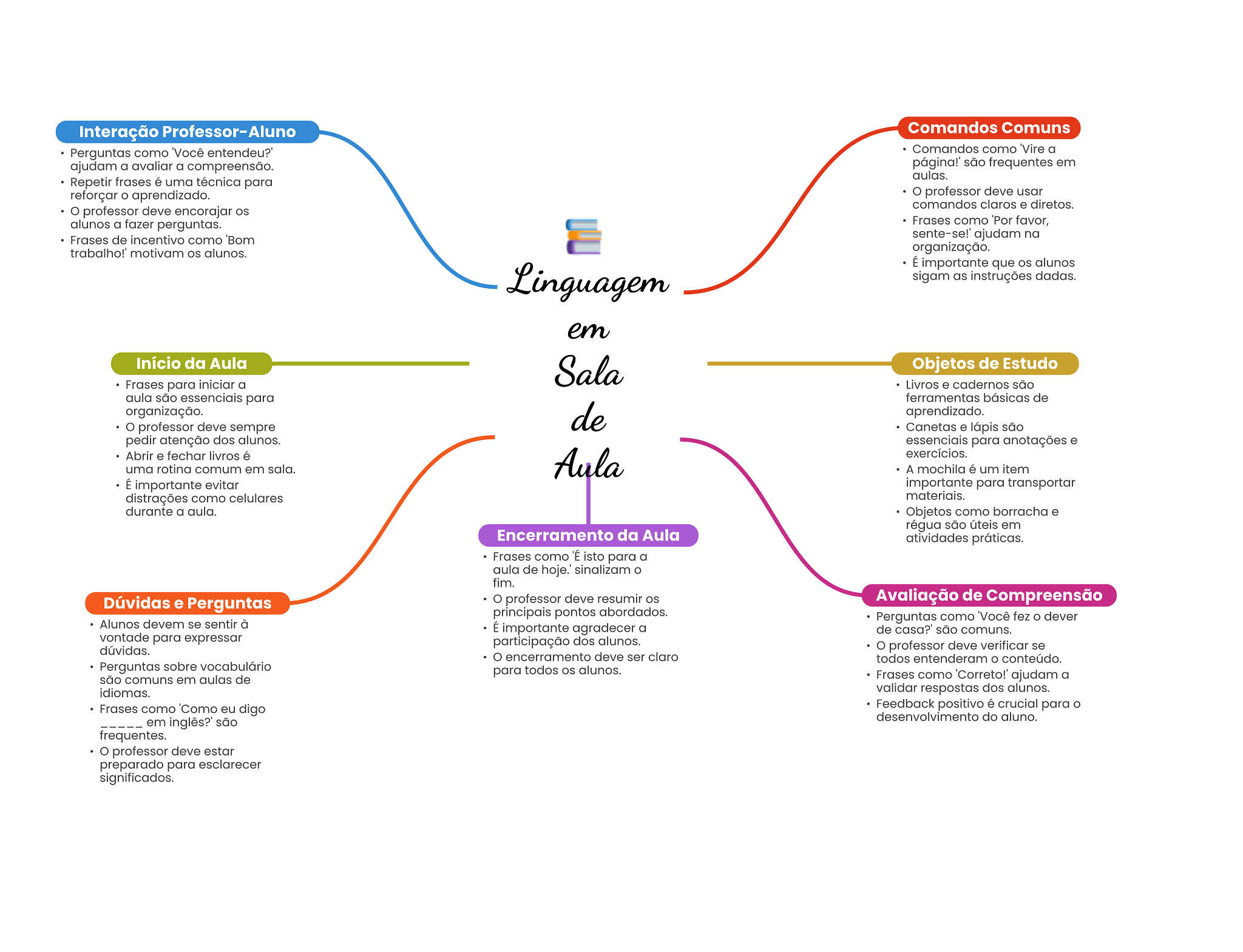 Interação Professor-Aluno Comandos Comuns Perguntas como Comandos como 'Vire a ajudam a avaliar a compreensão. são frequentes em aulas. Repetir frases é uma técnica para reforçar aprendizado. professor deve usar comandos claros e diretos. professor deve encorajar alunos a fazer perguntas. Frases como 'Por favor, Frases de incentivo como 'Bom sente-se!' ajudam na trabalho!' motivam alunos. organização. É importante que alunos Linguagem sigam as instruções dadas. em Início da Aula Sala Objetos de Estudo Frases para iniciar a Livros e cadernos são aula são essenciais para ferramentas básicas de organização. de aprendizado. professor deve sempre Canetas e lápis são pedir atenção dos alunos. essenciais para anotações e Abrir e fechar livros é Aula exercícios. uma rotina comum em sala. A mochila é um item É importante evitar importante para transportar distrações como celulares materiais. durante a aula. Objetos como borracha e régua são úteis em Encerramento da Aula atividades práticas. Frases como isto para a aula de sinalizam fim. Dúvidas e Perguntas professor deve resumir OS Avaliação de Compreensão principais pontos abordados. Perguntas como fez dever Alunos devem se sentir à É importante agradecer a de casa?' são comuns. vontade para expressar participação dos alunos. dúvidas. O professor deve verificar se encerramento deve ser claro todos entenderam conteúdo. Perguntas sobre vocabulário para todos OS alunos. são comuns em aulas de Frases como 'Correto!' ajudam a idiomas. validar respostas dos alunos. Frases como 'Como eu digo Feedback positivo é crucial para em inglês?' são desenvolvimento do aluno. frequentes. professor deve estar preparado para esclarecer significados.