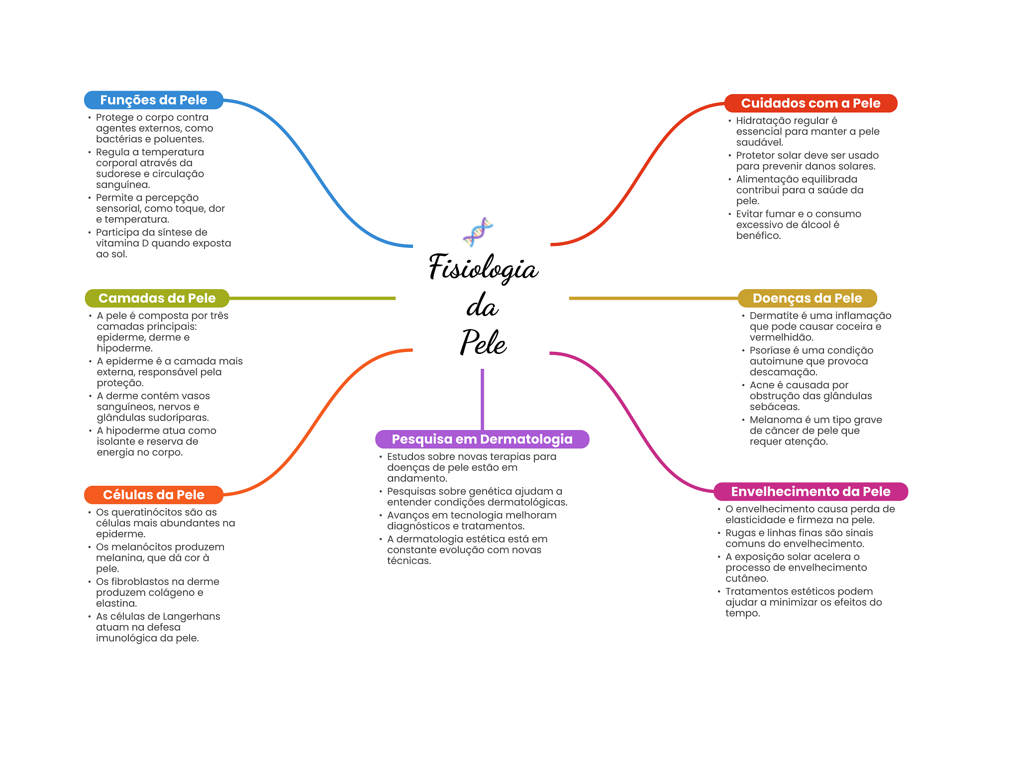 Funções da Pele Cuidados com a Pele Protege corpo contra Hidratação regular é agentes externos, como essencial para manter a pele bactérias e poluentes. saudável. Regula a temperatura Protetor solar deve ser usado corporal através da para prevenir danos solares. sudorese e circulação sanguínea. Alimentação equilibrada contribui para a saúde da Permite a percepção pele. sensorial, como toque, dor Evitar fumar e consumo e temperatura. excessivo de álcool é Participa da síntese de benéfico. vitamina D quando exposta ao sol. Fisiologia Camadas da Pele da Doenças da Pele A pele é composta por três Dermatite é uma inflamação camadas principais: que pode causar coceira e epiderme, derme e hipoderme. Pele vermelhidão. Psoríase é uma condição A epiderme é a camada mais autoimune que provoca externa, responsável pela descamação. proteção. Acne é causada por A derme contém vasos obstrução das glândulas sanguíneos, nervos e sebáceas. glândulas Melanoma é um tipo grave A hipoderme atua como de câncer de pele que isolante e reserva de Pesquisa em Dermatologia requer atenção. energia no corpo. Estudos sobre novas terapias para doenças de pele estão em andamento. Células da Pele Pesquisas sobre genética ajudam a Envelhecimento da Pele entender condições dermatológicas. Os queratinócitos são as envelhecimento causa perda de Avanços em tecnologia melhoram células mais abundantes na elasticidade e firmeza na pele. diagnósticos e tratamentos. epiderme. Rugas e linhas finas são sinais A dermatologia estética está em Os melanócitos produzem comuns do envelhecimento constante evolução com novas melanina, que dá cor à técnicas. A exposição solar acelera O pele. processo de envelhecimento Os fibroblastos na derme cutâneo. produzem colágeno e Tratamentos estéticos podem elastina. ajudar a minimizar OS efeitos do As células de Langerhans tempo. atuam na defesa imunológica da pele.