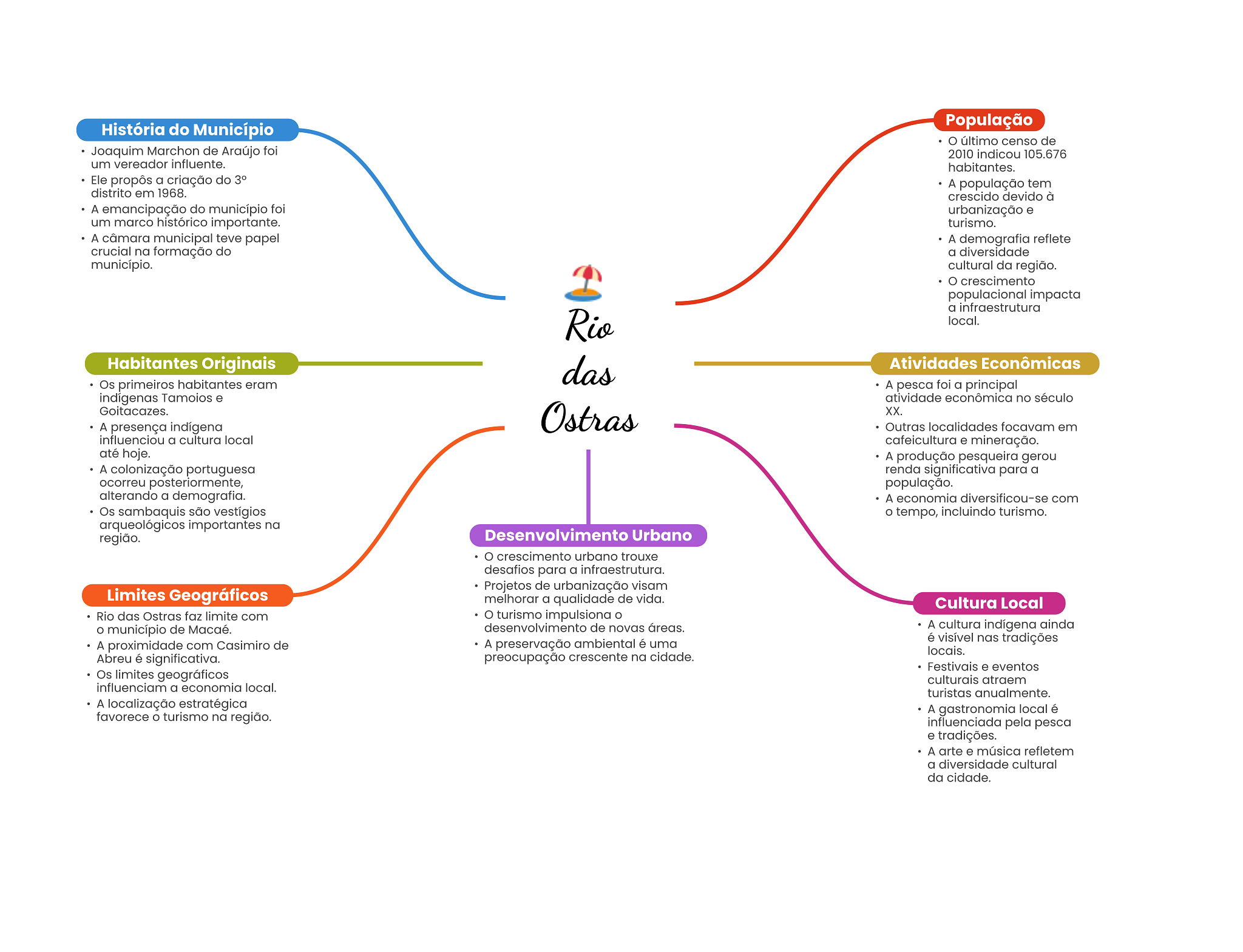 História do Município População último censo de Joaquim Marchon de Araújo foi 2010 indicou 105.676 um vereador influente. habitantes. Ele propôs a criação do 3° A população tem distrito em 1968. crescido devido à A emancipação do município foi urbanização e um marco histórico importante. turismo. A câmara municipal teve papel A demografia reflete crucial na formação do a diversidade município. cultural da região. crescimento populacional impacta a infraestrutura Rio local. Habitantes Originais das Atividades Econômicas Os primeiros habitantes eram A pesca foi a principal indígenas Tamoios e atividade econômica no século Goitacazes. A presença indígena Ostras XX. Outras localidades focavam em influenciou a cultura local cafeicultura e mineração. até hoje. A produção pesqueira gerou A colonização portuguesa renda significativa para a ocorreu posteriormente, população. alterando a demografia. A economia diversificou-se com Os sambaquis são vestígios tempo, incluindo turismo. arqueológicos importantes na região. Desenvolvimento Urbano crescimento urbano trouxe desafios para a infraestrutura. Projetos de urbanização visam Limites Geográficos melhorar a qualidade de vida. Cultura Local Rio das Ostras faz limite com turismo impulsiona município de Macaé. desenvolvimento de novas áreas. A cultura indígena ainda A preservação ambiental é uma é visível nas tradições A proximidade com Casimiro de locais. Abreu é significativa. preocupação crescente na cidade. Festivais e eventos Os limites geográficos culturais atraem influenciam a economia local. turistas anualmente. A localização estratégica A gastronomia local é favorece turismo na região. influenciada pela pesca e tradições. A arte e música refletem a diversidade cultural da cidade.