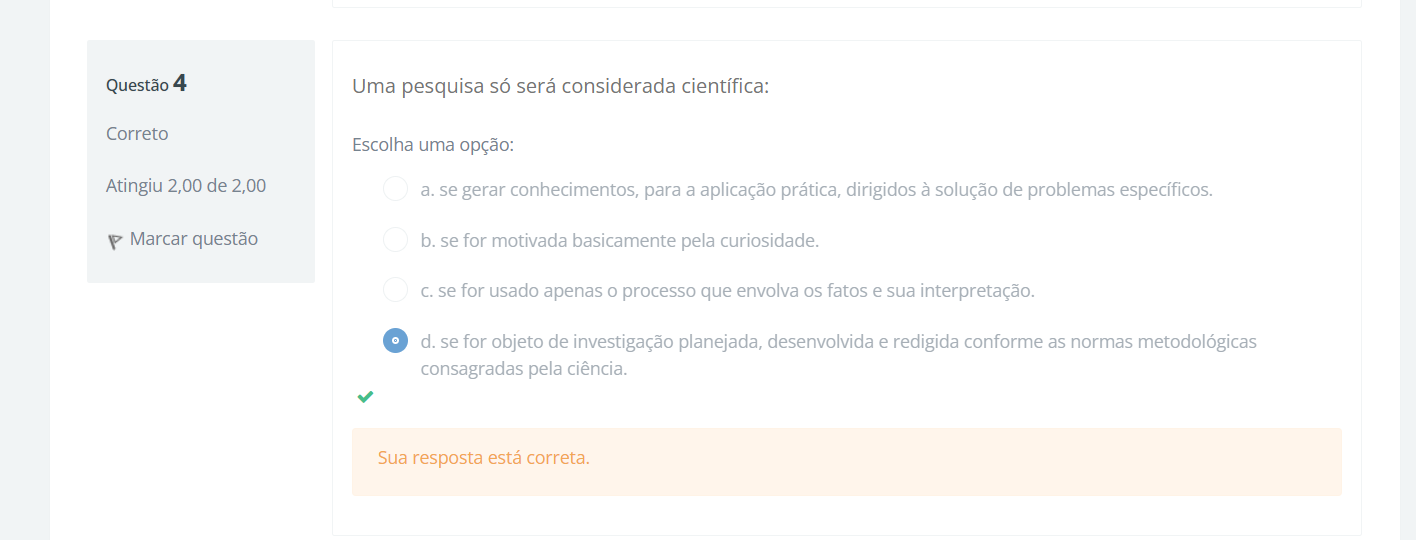 Questão 4 Uma pesquisa só será considerada científica: Correto Escolha uma opção: Atingiu 2,00 de 2,00 a. se gerar conhecimentos, para a aplicação prática, dirigidos à solução de problemas específicos. Marcar questão b. se for motivada basicamente pela curiosidade. C. se for usado apenas processo que envolva os fatos e sua interpretação. d. se for objeto de investigação planejada, desenvolvida e redigida conforme as normas metodológicas consagradas pela ciência. Sua resposta está correta.