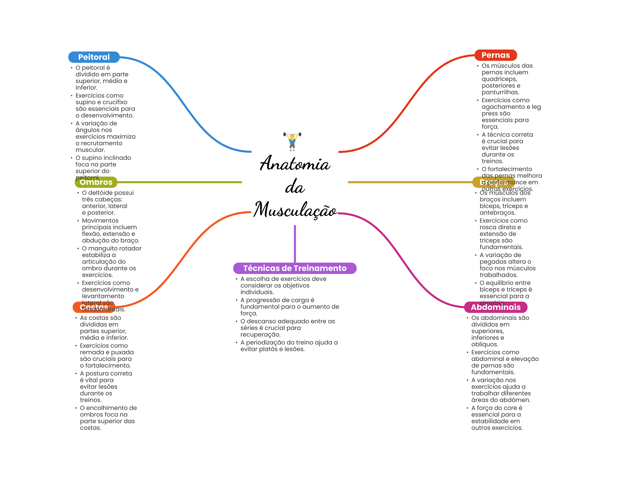 Peitoral Pernas peitoral é Os músculos das dividido em parte pernas incluem superior, média e quadríceps, inferior. posteriores e Exercícios como panturrilhas. supino e crucifixo Exercícios como são essenciais para agachamento e leg press são A variação de essenciais para força. ângulos nos exercícios maximiza A técnica correta recrutamento é crucial para muscular. evitar lesões durante supino inclinado foca na parte Anatomia treinos. superior do O fortalecimento peitoral. das pernas melhora Ombros da performance em outros exercícios. deltóide possui Os musculos dos três cabeças: braços incluem anterior, lateral e posterior. Musculação bíceps, tríceps e antebraços. Movimentos Exercícios como principais incluem rosca direta e flexão, extensão e extensão de abdução do braço. tríceps são manguito rotador fundamentais. estabiliza a A variação de articulação do pegadas altera ombro durante Técnicas de Treinamento foco nos músculos exercícios. trabalhados. A escolha de exercícios deve Exercícios como considerar objetivos equilíbrio entre desenvolvimento e individuais. bíceps e tríceps é levantamento essencial para a A progressão de carga é Costas fundamental para aumento de Abdominais força. As costas são Os abdominais são divididas em descanso adequado entre as divididos em partes superior, séries é crucial para superiores, média e inferior. recuperação. inferiores e Exercícios como A periodização do treino ajuda a oblíquos. remada e puxada evitar platôs e lesões. Exercícios como são cruciais para abdominal e elevação fortalecimento. de pernas são A postura correta fundamentais. é vital para A variação nos evitar lesões exercícios ajuda a durante trabalhar diferentes treinos. áreas do abdômen. O encolhimento de A força do core é ombros foca na essencial para a parte superior das estabilidade em costas. outros exercícios.