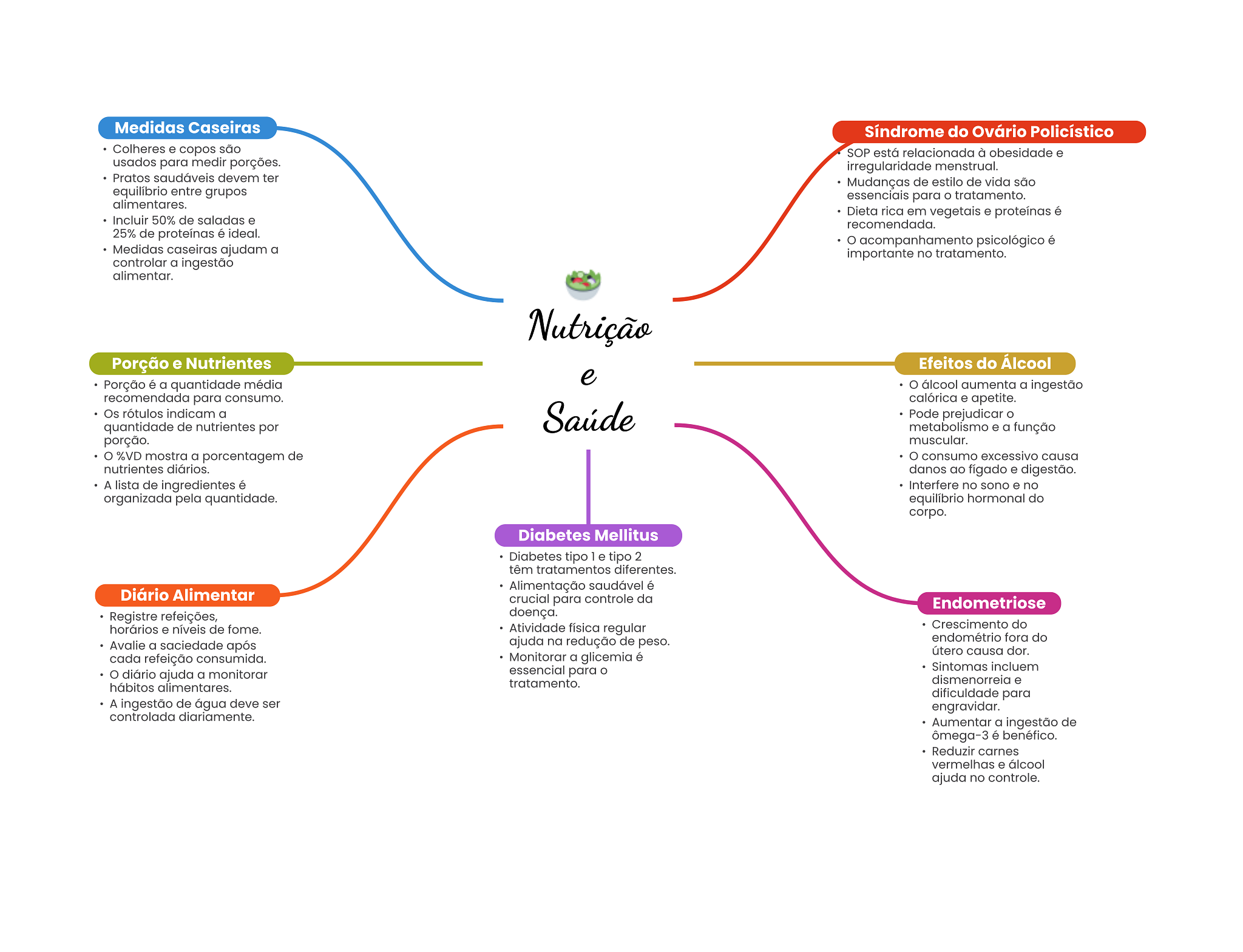 Medidas Caseiras Síndrome do Ovário Policístico Colheres e copos são SOP está relacionada à obesidade e usados para medir porções. irregularidade menstrual. Pratos saudáveis devem ter Mudanças de estilo de vida são equilíbrio entre grupos essenciais para tratamento. alimentares. Dieta rica em vegetais e proteínas é Incluir 50% de saladas e recomendada. 25% de proteínas é ideal. acompanhamento psicológico é Medidas caseiras ajudam a importante no tratamento. controlar a ingestão alimentar. Nutrição Porção e Nutrientes Efeitos do Álcool e Porção é a quantidade média O álcool aumenta a ingestão recomendada para consumo. calórica e apetite. Os rótulos indicam a Saúde Pode prejudicar quantidade de nutrientes por metabolismo e a função porção. muscular. O %VD mostra a porcentagem de O consumo excessivo causa nutrientes diários. danos ao fígado e digestão. A lista de ingredientes é Interfere no sono e no organizada pela quantidade. equilíbrio hormonal do corpo. Diabetes Mellitus Diabetes tipo 1 e tipo 2 têm tratamentos diferentes. Alimentação saudável é Diário Alimentar crucial para controle da Endometriose Registre refeições, doença. horários e níveis de fome. Atividade física regular Crescimento do Avalie a saciedade após ajuda na redução de peso. endométrio fora do útero causa dor. cada refeição consumida. Monitorar a glicemia é essencial para Sintomas incluem diário ajuda a monitorar tratamento. dismenorreia e hábitos alimentares. dificuldade para A ingestão de água deve ser engravidar. controlada diariamente. Aumentar a ingestão de ômega-3 é benéfico. Reduzir carnes vermelhas e álcool ajuda no controle.