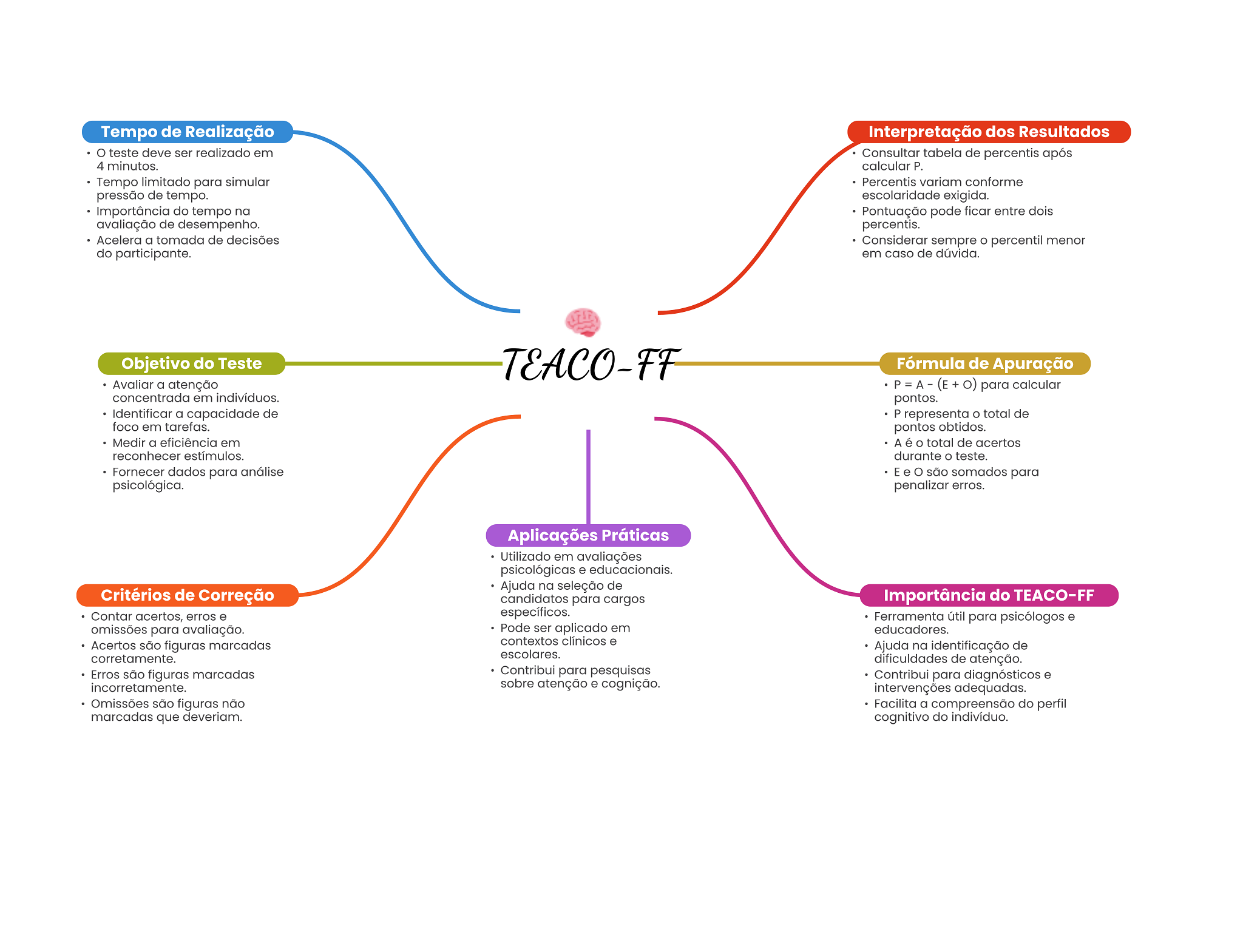 Tempo de Realização Interpretação dos Resultados teste deve ser realizado em Consultar tabela de percentis após 4 minutos. calcular P. Tempo limitado para simular Percentis variam conforme pressão de tempo. escolaridade exigida. Importância do tempo na Pontuação pode ficar entre dois avaliação de desempenho. percentis. Acelera a tomada de decisões Considerar sempre percentil menor do participante. em caso de dúvida. Objetivo do Teste TEACO-FF Fórmula de Apuração Avaliar a atenção + o) para calcular concentrada em indivíduos. pontos. Identificar a capacidade de P representa total de foco em tarefas. pontos obtidos. Medir a eficiência em A é total de acertos reconhecer estímulos. durante O teste. Fornecer dados para análise E e O são somados para psicológica. penalizar erros. Aplicações Práticas Utilizado em avaliações psicológicas e educacionais. Ajuda na seleção de Critérios de Correção candidatos para cargos Importância do TEACO-FF Contar acertos, erros e específicos. Ferramenta útil para psicólogos e omissões para avaliação. Pode ser aplicado em educadores. Acertos são figuras marcadas contextos clínicos e Ajuda na identificação de corretamente. escolares. dificuldades de atenção. Erros são figuras marcadas Contribui para pesquisas Contribui para diagnósticos e incorretamente. sobre atenção e cognição. intervenções adequadas. Omissões são figuras não Facilita a compreensão do perfil marcadas que deveriam. cognitivo do indivíduo.