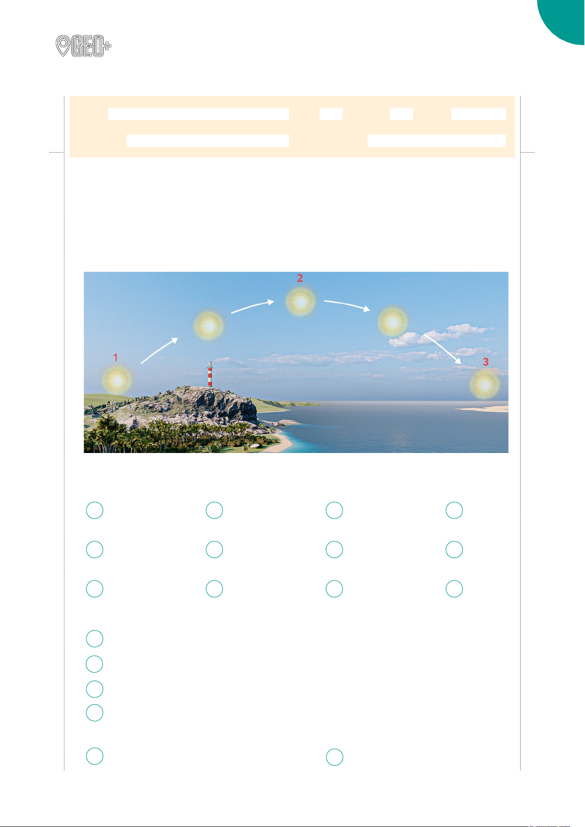 Ficha de avaliação 3A Nome: N.º: Turma: Data: Professor: Observações: Lê com atenção o enunciado da ficha de avaliação e responde com clareza e rigor às questões apresentadas. GRUPO I Existem diferentes formas de orientação na superfície terrestre. Observa a fig. 1. e seleciona a opção que completa corretamente cada uma das afirmações. Fig. 1 Movimento diurno aparente do Sol. Ao nascer do dia (1), o Sol indica o ponto cardeal4 Avaliação sumativa Classificação Cotação da questão Avaliação sumativa – Ficha de avaliação 3A Classificação Cotação da questão 1. norte. sul. este. oeste. Ao meio dia solar (2), o Sol está no seu ponto mais alto e aponta o4 1. norte. sul. este. oeste. Quando se põe (3), o Sol indica o ponto cardeal 4 1. norte. sul. este. oeste. De noite, no Hemisfério Norte, é possível recorrer sempre à orientação pela Estrela Polar, pois esta indica o norte. Esta afirmação é4 1. verdadeira, pois a Estrela Polar indica sempre o norte. falsa, pois a Estrela Polar indica o sul. falsa, pois a Estrela Polar não se vê do Hemisfério Sul. falsa, pois nos dias com nebulosidade não se vê a Estrela Polar. A bússola é uma forma de orientação pois tem uma agulha que indica4 1. o norte magnético. o norte geográfico. o norte marítimo. o sul magnético. A divisão administrativa e estatística de Portugal é complexa, mas muito importante. Observa as figs. 2 e 3. Fig. 2 Fig. 3 Classifica as afirmações como verdadeiras (V) ou falsas (F).6 1. Administrativamente, Portugal encontra-se dividido em distritos, municípios e cidades. A fig. 2 mostra a divisão estatística de Portugal, em distritos. A fig. 3 mostra a divisão administrativa de Portugal em NUTS II. Os números 1, 2 e 3 correspondem aos distritos de Vila Real, Aveiro e Beja. As NUTS III dividem Portugal em 7 regiões: Norte, Centro, Lisboa, Alentejo, Sul, Região Autónoma da Madeira e Região Autónoma dos Açores. As Comunidades Intermunicipais (CIM) são associações de municípios com o objetivo de planear e gerir o território de forma correta e comum. Corrige as afirmações consideradas falsas, sem recorrer à negação. 4 A localização absoluta permite saber a localização exata dos lugares. Estabelece a correspondência entre o conceito e a respetiva definição.10 Letra Conceito Letra Definição A Meridiano Círculo máximo perpendicular ao Eixo da Terra. B Paralelo Semicírculo perpendicular ao Equador que vai de um polo a outro. C Equador Conjunto de círculos imaginários representados no globo terrestre. D Rede cartográfica Círculo que passa pelo centro da Terra, dividindo-a em duas partes iguais. E Círculo máximo Círculo menor paralelo ao Equador. Completa o texto sobre as coordenadas geográficas com os termos que consideras mais convenientes.10 As - e - permitem fazer uma . A é a distância entre o Equador e o de lugar. Mede-se para e para do e tem um valor mínimo de e um máximo de nos . A é a distância em graus entre o e o de lugar. Mede-se para e para do Meridiano de Greenwich e tem um valor mínimo de e um máximo de no meridiano oposto. GRUPO II 1. Atenta no doc. 1. Doc. 1 O navio-escola Sagres tinha previsto uma viagem de circum-navegação com a duração de 371 dias – partida de Lisboa a 5 de janeiro de 2020 e chegada a 10 de janeiro de 2021. A rota seria a que consta no mapa seguinte. No entanto, a missão foi interrompida devido à pandemia de Covid-19, tendo o navio chegado a Lisboa a 10 de maio. . Fonte: https://sagres.marinha.pt/pt, 31 de agosto de 2020. Identifica, de entre os locais onde estava previsto o navio-escola Sagres parar, o que apresenta:5 a) maior latitude. b) menor latitude. c) maior longitude. d) menor longitude. Indica cinco lugares localizados simultaneamente no Hemisfério Sul e Ocidental.5 Localiza, no mapa do doc. 1, os lugares da tabela seguinte.5 Lugar Latitude Longitude A 50º N 10º E B 20º S 50º O C 20º N 90º O D 66º 33' N 180º Lê as coordenadas geográficas dos lugares 1, 2, 3 e 4 que se encontram no mapa do doc. 1.10 Lugar Latitude Longitude 1 2 3 4 Observa a fig. 4. Todas as afirmações são verdadeiras. Assinala as afirmações cujo conteúdo pode ser confirmado pela análise da fig. 4.5 a) A União Europeia é composta por 27 países. b) A União Europeia foi fundada em 1957. c) Portugal aderiu à União Europeia em 1986. d) O Tratado de Maastricht deu origem à moeda única: o euro. e) Em 2020, pela primeira vez na história da União Europeia, saiu um país: o Reino Unido.Fig. 1 União Europeia. Identifica os países numerados de 1 a 5 na fig. 4.5 Estabelece a correspondência entre os países e as respetivas capitais.5 Letra País Letra Capital A Áustria Copenhaga B Estónia Tirana C Albânia Viena D Chéquia Tallinn E Dinamarca Praga Explica de que forma a cidadania europeia dá acesso a direitos e deveres, dando exemplos de cada um.10 image4.png image5.png image6.png image7.png image1.png image2.png image3.png