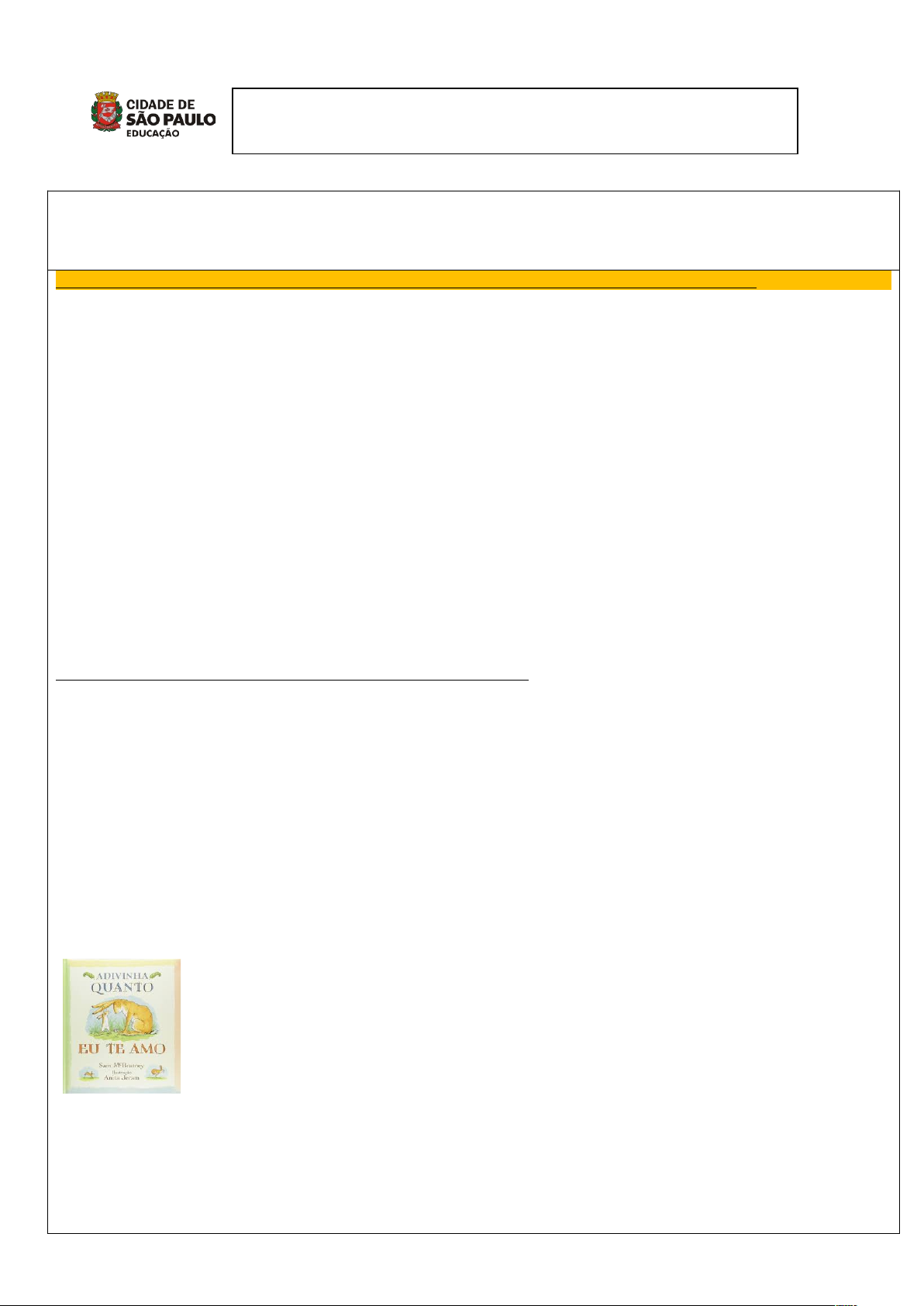 SECRETARIA MUNICIPAL DE EDUCAÇÃO DIRETORIA REGIONAL DE EDUCAÇÃO - SÃO MATEUS CEU EMEI ALTO ALEGRE PROPOSTAS DE ATIVIDADES: SEMANA DE 15 A 19 DE MARÇO DE 2021. 15/03 – VIVÊNCIA DO DIA: OBSERVAÇÃO SOBRE QUAL É O OBJETO DE TRANSIÇÃO INTENCIONALIDADES: “Um comportamento muito particular das crianças especialmente as muito novas, é o apego ao chamado objeto de transição”. Trata-se de um item que pode ser um brinquedo, um cobertor, uma fralda de pano ou um ursinho de pelúcia – que a criança elege, se apega e carrega para todo lado. isso acontece porque as crianças fazem uma espécie de transposição entre o que sente e o objeto escolhido, atribuindo suas emoções ao item preferido.” (retirado do site da sociedade brasileira de inteligência emocional (sbie) Pensando na importância desse objeto de transição ao qual a criança demonstra tanto apego queremos convidar às famílias a prestar bem atenção na criança. COMO FAZER: Vamos precisar que as famílias observem as crianças e descubra qual objeto a criança demonstra apego, como dito acima, pode ser um brinquedo, um cobertor, fralda de pano, ursinho de pelúcia, etc. Queremos também saber a história deste objeto como e quando ele começou a fazer parte da vida da criança, quem deu ou qualquer outra informação que possam ter. DEVOLUTIVAS ESPERADA DAS FAMÍLIAS: Se possível mandar foto da criança com o objeto de transição. SUGESTÃO PARA REALIZAÇÃO NO MODO PRESENCIAL: No lugar de relato das famílias, pode-se fazer uma roda de conversa em que as crianças contem sobre o objeto que mais gosta e quem deu para elas. SUGESTÃO DE LEITURA: “ADIVINHA O QUANTO EU TE AMO” AUTOR SAM MCBRATNEY. INTENCIONALIDADES: Essa leitura completa a atividade anterior, pois retrata sentimento e emoções, só que desta vez por pai e filho, nos faz refletir sobre o quanto é importante estabelecer vínculos com as pessoas a nossa volta. COMO FAZER: Em um local tranquilo realize a leitura com as crianças mostrando as imagens a ela, não se esquecendo de interagir durante a leitura para que ela possa entender e opinar sobre a história. ARQUIVO EM PDF DEVOLUITVA ESPERADA PELAS FAMÍLIAS: Após a leitura envie vídeo, áudio ou mensagem do relato de como foi esse momento e quais sentimentos surgiram no decorrer e após a leitura da história. 16/03 – VIVÊNCIA DO DIA: PINTURA COM ÁGUA. INTENCIONALIDADES: Promover a criatividade a coordenação motora e a liberdade de expressar a sua imaginação de maneira divertida. COMO FAZER: - Utilizar um copo com água. - Uma parede lisa com qualquer cor de fundo. - Pincel. - Utilize a água como se fosse a tinta e solte a sua imaginação. Segue link para ver imagem como exemplo: https://www.tempojunto.com/2014/11/23/pintura-com-agua/ DEVOLUTIVAS ESPERADA DAS FAMÍLIAS: Envie-nos fotos, vídeos e mensagens relatando como foi a atividade. SUGESTÃO DE LEITURA: A MAGIA DAS LETRAS - EDMAR DE FREITAS. INTENCIONALIDADES: Desenvolver a oralidade, enriquecer o vocabulário, desenvolver o gosto pela literatura infantil e conhecer uma nova história. COMO FAZER: 1 - Procure um ambiente tranquilo para realizar a leitura. 2 - Realizar a leitura pausadamente. 3 – Observe as imagens e comentem. ARQUIVO EM PDF. DEVOLUTIVAS ESPERADA PELAS FAMÍLIAS: Nos envie fotos, mensagens ou vídeos nos contando como foi realizar a leitura. 17/03 – VIVÊNCIA DO DIA: CONCURSO DE POSES. INTENCIONALIDADES: Desenvolver o equilíbrio, a atenção e concentração. Além de ser bem divertido observar quem mais se aproximará à figura apresentada. COMO FAZER: Disponibilizar figuras com posições diferentes para a criança copiar usando seu corpo para ficar na pose da figura. SEGUE NO LIK ABAIXO ALGUNS EXEMPLOS DE POSES: https://www.tempojunto.com/2014/06/21/tire-as-criancas-do-sofa-com-esse-concurso-de-poses/ DEVOLUTIVAS ESPERADA DAS FAMÍLIAS: Se possível nos enviar vídeos ou fotos da criança realizando a pose. SUGESTÃO DE LEITURA: DE HORA EM HORA - RUTH ROCHA INTENCIONALIDADES: Desenvolver a oralidade, enriquecer ao vocabulário, desenvolver o gosto pela literatura infantil e conhecer uma nova história. COMO FAZER? Escolha um lugar tranquilo da casa e converse sobre o que observaram na história. Segue o link para acessar a história. https://www.youtube.com/watch?v=tMIsx49J2XA DEVOLUTIVAS ESPEREDA PELAS FAMÍLIAS. SE POSSIVEL ENVIE ÁUDIO, VÍDEO OU FOTO DE SUA CRIANÇA OUVINDO A HISTÓRIA OU COMENTANDO A LEITURA. 18/03 – VIVÊNCIA DO DIA: BRINCADEIRAS INFANTIS. INTENCIONALIDADES: Propiciar as crianças brincadeiras culturais, vivenciadas por toda família, resgatando para incentivar a interação da família. Desenvolvendo o aprendizado cultural e a atenção. COMO FAZER: Escolha um local tranquilo da casa e assista ao vídeo. https://www.youtube.com/watch?v=zCyOvKGXuY4 A música acima nos lembra de algumas brincadeiras, mas juntos busquem outras brincadeiras, podem ser brincadeiras de roda também. DEVOLUTIVAS ESPERADA DAS FAMÍLIAS: Se possível enviar a realização de algumas brincadeiras através de fotos ou vídeos. SUGESTÃO DE LEITURA: LETRA DA MÚSICA A BARATA. CANTIGA POPULAR. INTENCIONALIDADES: - A sugestão de leitura visa ampliar o vocabulário e desenvolver a oralidade, além de estimular a concentração e imaginação. COMO FAZER: 1 - Procure um ambiente tranquilo para realizar a leitura. 2 - Realizar a leitura pausadamente. 3 - Leia primeiramente a curiosidade. 4 - Ouvir a música do vídeo anexado abaixo cantando a letra e batendo palmas. 5 - realize a leitura da letra da música. 6 - Conversem sobre o que entenderam da leitura. A BARATA A BARATA DIZ QUE TEM SETE SAIAS DE FILÓ É MENTIRA DA BARATA, ELA TEM É UMA SÓ RA RÁ RÁ, RÓ RÓ RÓ ELA TEM É UMA SÓ! RA RÁ RÁ, RÓ RÓ RÓ ELA TEM É UMA SÓ! A BARATA DIZ QUE TEM UM ANEL DE FORMATURA É MENTIRA DA BARATA, ELA TEM É CASCA DURA RA RÁ RÁ, RÓ RÓ RÓ ELA TEM É CASCA DURA RA RÁ RÁ, RÓ RÓ RÓ ELA TEM É CASCA D