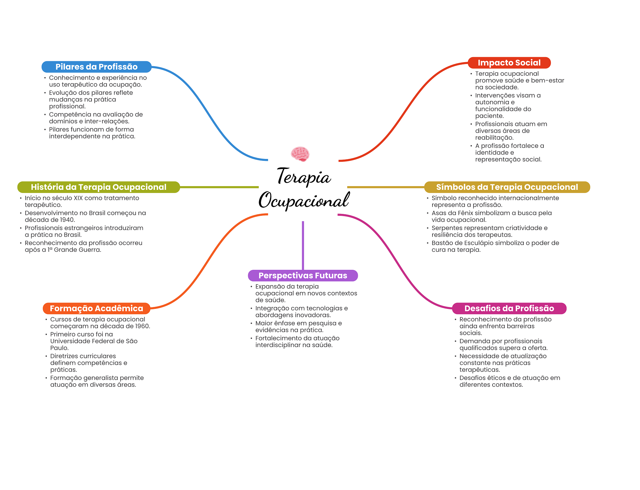 Pilares da Profissão Impacto Social Terapia ocupacional Conhecimento e experiência no promove saúde e bem-estar uso terapêutico da ocupação. na sociedade. Evolução dos pilares reflete Intervenções visam a mudanças na prática autonomia e profissional. funcionalidade do Competência na avaliação de paciente. domínios e inter-relações. Profissionais atuam em Pilares funcionam de forma diversas áreas de interdependente na prática. reabilitação. A profissão fortalece a identidade e representação social. Terapia História da Terapia Ocupacional Símbolos da Terapia Ocupacional Início no século XIX como tratamento Ocupacional Símbolo reconhecido internacionalmente terapêutico. representa a profissão. Desenvolvimento no Brasil começou na Asas da Fênix simbolizam a busca pela década de 1940. vida ocupacional. Profissionais estrangeiros introduziram Serpentes representam criatividade e a prática no Brasil. resiliência dos terapeutas. Reconhecimento da profissão ocorreu Bastão de Esculápio simboliza poder de após a Grande Guerra. cura na terapia. Perspectivas Futuras Expansão da terapia ocupacional em novos contextos de saúde. Formação Acadêmica Integração com tecnologias e Desafios da Profissão abordagens inovadoras. Cursos de terapia ocupacional Reconhecimento da profissão começaram na década de 1960. Maior ênfase em pesquisa e ainda enfrenta barreiras evidências na prática. Primeiro curso foi na sociais. Universidade Federal de São Fortalecimento da atuação Demanda por profissionais Paulo. interdisciplinar na saúde. qualificados supera a oferta. Diretrizes curriculares Necessidade de atualização definem competências e constante nas práticas práticas. terapêuticas. Formação generalista permite Desafios éticos e de atuação em atuação em diversas áreas. diferentes contextos.