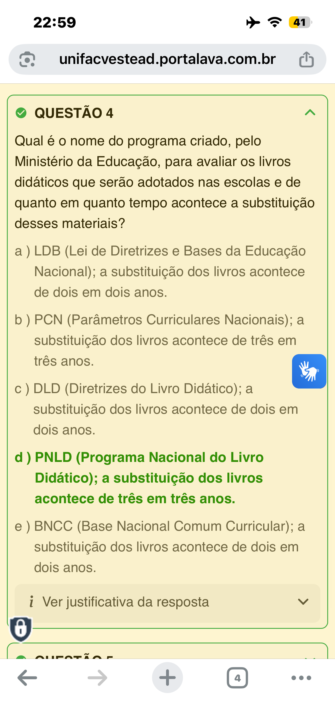 22:59 41 unifacvestead.portalava.com.br QUESTÃO 4 Qual é nome do programa criado, pelo Ministério da Educação, para avaliar os livros didáticos que serão adotados nas escolas e de quanto em quanto tempo acontece a substituição desses materiais? a ) LDB (Lei de Diretrizes e Bases da Educação Nacional); a substituição dos livros acontece de dois em dois anos. b) PCN (Parâmetros Curriculares Nacionais); a substituição dos livros acontece de três em três anos. DLD (Diretrizes do Livro Didático); a substituição dos livros acontece de dois em dois anos. d) PNLD (Programa Nacional do Livro Didático); a substituição dos livros acontece de três em três anos. e ) BNCC (Base Nacional Comum Curricular); a substituição dos livros acontece de dois em dois anos. i Ver justificativa da resposta + 4