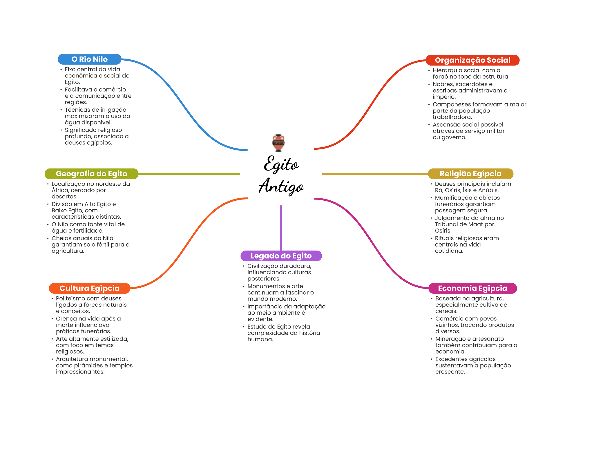Rio Nilo Organização Social Eixo central da vida Hierarquia social com econômica e social do faraó no topo da estrutura. Egito. Nobres, sacerdotes e Facilitava comércio escribas administravam O e a comunicação entre império. regiões. Camponeses formavam a maior Técnicas de irrigação parte da população maximizaram uso da trabalhadora. água disponível. Ascensão social possível Significado religioso através de serviço militar profundo, associado a ou governo. deuses egípcios. Egito Geografia do Egito Religião Egípcia Localização no nordeste da África, cercado por Antigo Deuses principais incluíam Rá, Osíris, Isis e Anúbis. desertos. Mumificação e objetos Divisão em Alto Egito e funerários garantiam Baixo Egito, com passagem segura. características distintas. Julgamento da alma no Nilo como fonte vital de Tribunal de Maat por água e fertilidade. Osíris. Cheias anuais do Nilo Rituais religiosos eram garantiam solo fértil para a centrais na vida agricultura. cotidiana. Legado do Egito Civilização duradoura, influenciando culturas posteriores. Cultura Egípcia Monumentos e arte continuam a fascinar Economia Egípcia Politeísmo com deuses mundo moderno. Baseada na agricultura, ligados a forças naturais Importância da adaptação especialmente cultivo de e conceitos. ao meio ambiente é cereais. Crença na vida após a evidente. Comércio com povos morte influenciava Estudo do Egito revela vizinhos, trocando produtos práticas funerárias. complexidade da história diversos. Arte altamente estilizada, humana. Mineração e artesanato com foco em temas também contribuíam para a religiosos. economia. Arquitetura monumental, Excedentes agrícolas como pirâmides e templos sustentavam a população impressionantes. crescente.