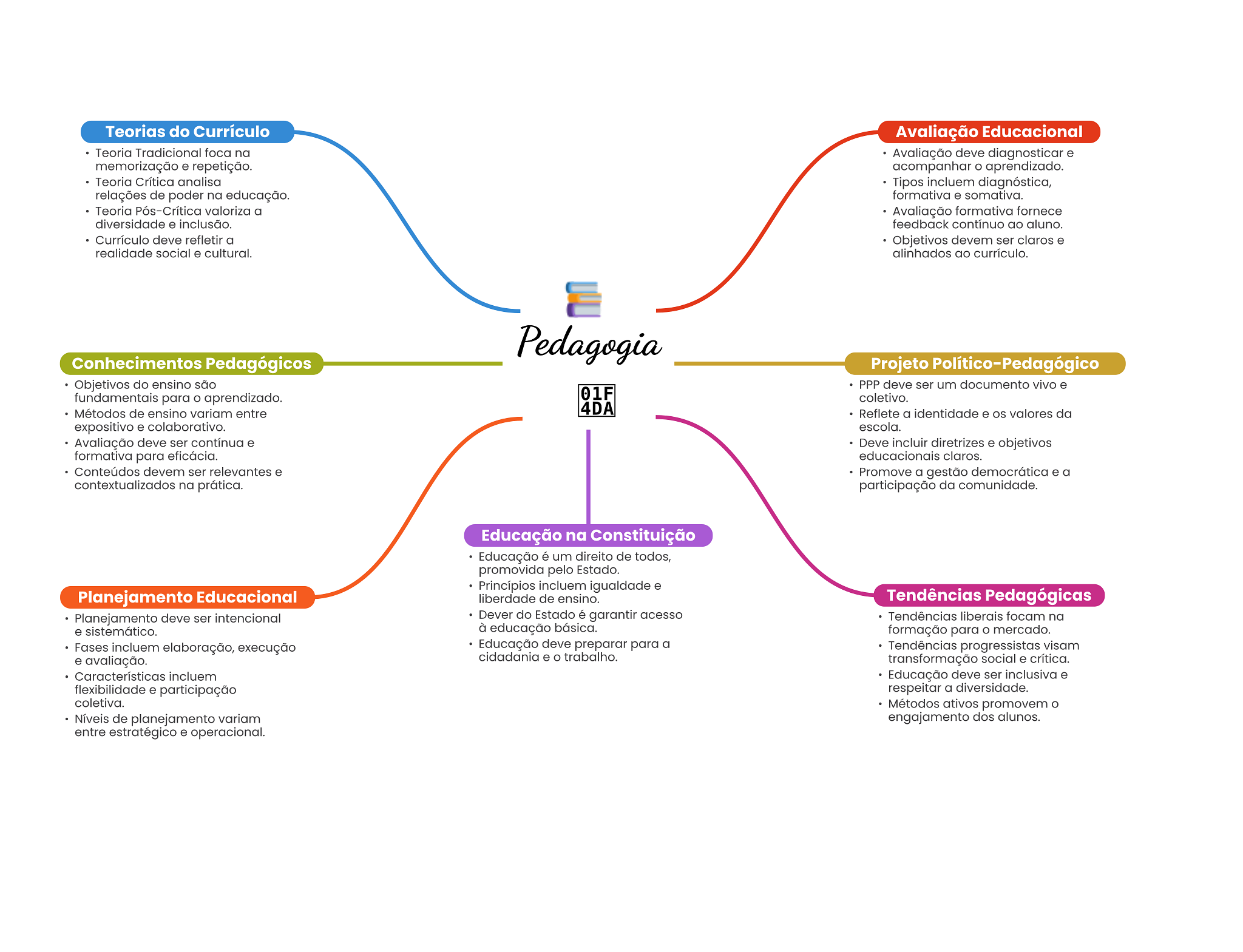 Teorias do Currículo Avaliação Educacional Teoria Tradicional foca na Avaliação deve diagnosticar e memorização e repetição. acompanhar aprendizado. Teoria Crítica analisa Tipos incluem diagnóstica, relações de poder na educação. formativa e somativa. Teoria Pós-Crítica valoriza a Avaliação formativa fornece diversidade e inclusão. feedback contínuo ao aluno. Currículo deve refletir a Objetivos devem ser claros e realidade social e cultural. alinhados ao currículo. Pedagogia Conhecimentos Pedagógicos Projeto Político-Pedagógico Objetivos do ensino são PPP deve ser um documento vivo e fundamentais para aprendizado. 01F coletivo. Métodos de ensino variam entre 4DA Reflete a identidade e valores da expositivo e colaborativo. escola. Avaliação deve ser contínua e Deve incluir diretrizes e objetivos formativa para eficácia. educacionais claros. Conteúdos devem ser relevantes e Promove a gestão democrática e a contextualizados na prática. participação da comunidade. Educação na Constituição Educação é um direito de todos, promovida pelo Estado. Princípios incluem igualdade e Planejamento Educacional liberdade de ensino. Tendências Pedagógicas Planejamento deve ser intencional Dever do Estado é garantir acesso Tendências liberais focam na e sistemático. à educação básica. formação para O mercado. Fases incluem elaboração, execução Educação deve preparar para a Tendências progressistas visam e avaliação. cidadania e O trabalho. transformação social e crítica. Características incluem Educação deve ser inclusiva e flexibilidade e participação respeitar a diversidade. coletiva. Métodos ativos promovem Níveis de planejamento variam engajamento dos alunos. entre estratégico e operacional.
