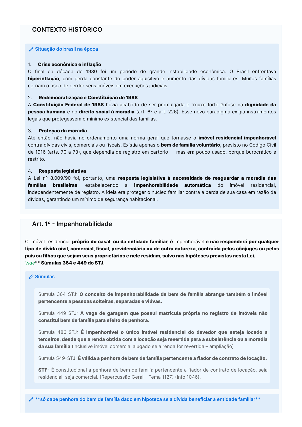 CONTEXTO HISTÓRICO Situação do brasil na época 1. Crise econômica e inflação O final da década de 1980 foi um período de grande instabilidade econômica. O Brasil enfrentava hiperinflação, com perda constante do poder aquisitivo e aumento das dívidas familiares. Muitas famílias corriam o risco de perder seus imóveis em execuções judiciais. 2. Redemocratização e Constituição de 1988 A Constituição Federal de 1988 havia acabado de ser promulgada e trouxe forte ênfase na dignidade da pessoa humana e no direito social à moradia (art. 6º e art. 226). Esse novo paradigma exigia instrumentos legais que protegessem o mínimo existencial das famílias. 3. Proteção da moradia Até então, não havia no ordenamento uma norma geral que tornasse o imóvel residencial impenhorável contra dívidas civis, comerciais ou fiscais. Existia apenas o bem de família voluntário, previsto no Código Civil de 1916 (arts. 70 a 73), que dependia de registro em cartório — mas era pouco usado, porque burocrático e restrito. 4. Resposta legislativa A Lei nº 8.009/90 foi, portanto, uma resposta legislativa à necessidade de resguardar a moradia das famílias brasileiras, estabelecendo a impenhorabilidade automática do imóvel residencial, independentemente de registro. A ideia era proteger o núcleo familiar contra a perda de sua casa em razão de dívidas, garantindo um mínimo de segurança habitacional. Art. 1º - Impenhorabilidade O imóvel residencial próprio do casal, ou da entidade familiar, é impenhorável e não responderá por qualquer tipo de dívida civil, comercial, fiscal, previdenciária ou de outra natureza, contraída pelos cônjuges ou pelos pais ou filhos que sejam seus proprietários e nele residam, salvo nas hipóteses previstas nesta Lei. Vide** Súmulas 364 e 449 do STJ. Súmulas Súmula 364-STJ: O conceito de impenhorabilidade de bem de família abrange também o imóvel pertencente a pessoas solteiras, separadas e viúvas. Súmula 449-STJ: A vaga de garagem que possui matrícula própria no registro de imóveis não constitui bem de família para efeito de penhora. Súmula 486-STJ: É impenhorável o único imóvel residencial do devedor que esteja locado a terceiros, desde que a renda obtida com a locação seja revertida para a subsistência ou a moradia da sua família (inclusive imóvel comercial alugado se a renda for revertida – ampliação) Súmula 549-STJ: É válida a penhora de bem de família pertencente a fiador de contrato de locação. STF- É constitucional a penhora de bem de família pertencente a fiador de contrato de locação, seja residencial, seja comercial. (Repercussão Geral – Tema 1127) (Info 1046). **só cabe penhora do bem de família dado em hipoteca se a dívida beneficiar a entidade familiar** I) A exceção à impenhorabilidade do bem de família nos casos de execução de hipoteca sobre o imóvel, oferecido como garantia real pelo casal ou pela entidade familiar, prevista no art. 3º, V, da Lei n. 8.009/1990, restringe-se às hipóteses em que a dívida foi constituída em benefício da entidade familiar; II) Em relação ao ônus da prova, a) se o bem for dado em garantia real por um dos sócios de pessoa jurídica, é, em regra, impenhorável, cabendo ao credor o ônus de comprovar que o débito da pessoa jurídica se reverteu em benefício da entidade familiar; e b) caso os únicos sócios da sociedade sejam os titulares do imóvel hipotecado, a regra é da penhorabilidade do bem de família, competindo aos proprietários demonstrar que o débito da pessoa jurídica não se reverteu em benefício da entidade familiar. STJ. 2ª Seção. REsp 2.093.929-MG e REsp 2.105.326-SP, Rel. Min. Antonio Carlos Ferreira, julgados em 5/6/2025 (Recurso Repetitivo - Tema 1261) (Info 855). **um veículo que seja essencial ao trabalho da pessoa executada é impenhorável; se esse veículo estiver em alienação fiduciária, a impenhorabilidade se estende para os direitos aquisitivos derivados do contrato de alienação fiduciária** Os bens móveis necessários ou úteis ao exercício da profissão do devedor são impenhoráveis, conforme o art. 833, V, do CPC, com a finalidade de proteger o direito à subsistência do executado. O veículo usado como ferramenta de trabalho é, em regra, impenhorável, salvo exceções legais. Essa proteção se estende reflexamente aos direitos aquisitivos derivados de contratos de alienação fiduciária, caso o bem em questão seja necessário à atividade profissional. A alienação fiduciária de um veículo como garantia financeira não transfere a propriedade plena ao credor fiduciário; em vez disso, vincula os direitos do devedor à aquisição do bem. Assim, tais direitos aquisitivos também são protegidos pela impenhorabilidade, enquanto subsistir a condição de necessidade ao exercício da profissão. Em suma: a impenhorabilidade de veículo automotor necessário ao exercício da profissão se estende, de maneira reflexa, aos direitos aquisitivos derivados de contrato de alienação fiduciária em garantia que tem por objeto o referido bem. STJ. 3ª Turma REsp 2.173.633-PR, Rel. Min. Nancy Andrighi, julgado em 12/11/2024 (Info 834). **os direitos do devedor fiduciante sobre imóvel objeto de contrato de alienação fiduciária em garantia possuem a proteção da impenhorabilidade do bem de família legal.** Ex: João fez um contrato de alienação fiduciária para aquisição de uma casa; ele está morando no imóvel enquanto paga as prestações; enquanto não terminar de pagar, a casa pertence ao banco; apesar disso, ou seja, a despeito de possuir apenas a posse, os direitos de João sobre o imóvel não podem ser penhorados porque incide a proteção do bem de família. STJ. 3ª Turma REsp 1677079-SP, Rel. Min. Ricardo Villas Bôas Cueva, julgado em 25/09/2018 (Info 635). A impenhorabilidade compreende o imóvel sobre o qual se assentam a construção, as plantações, as benfeitorias 