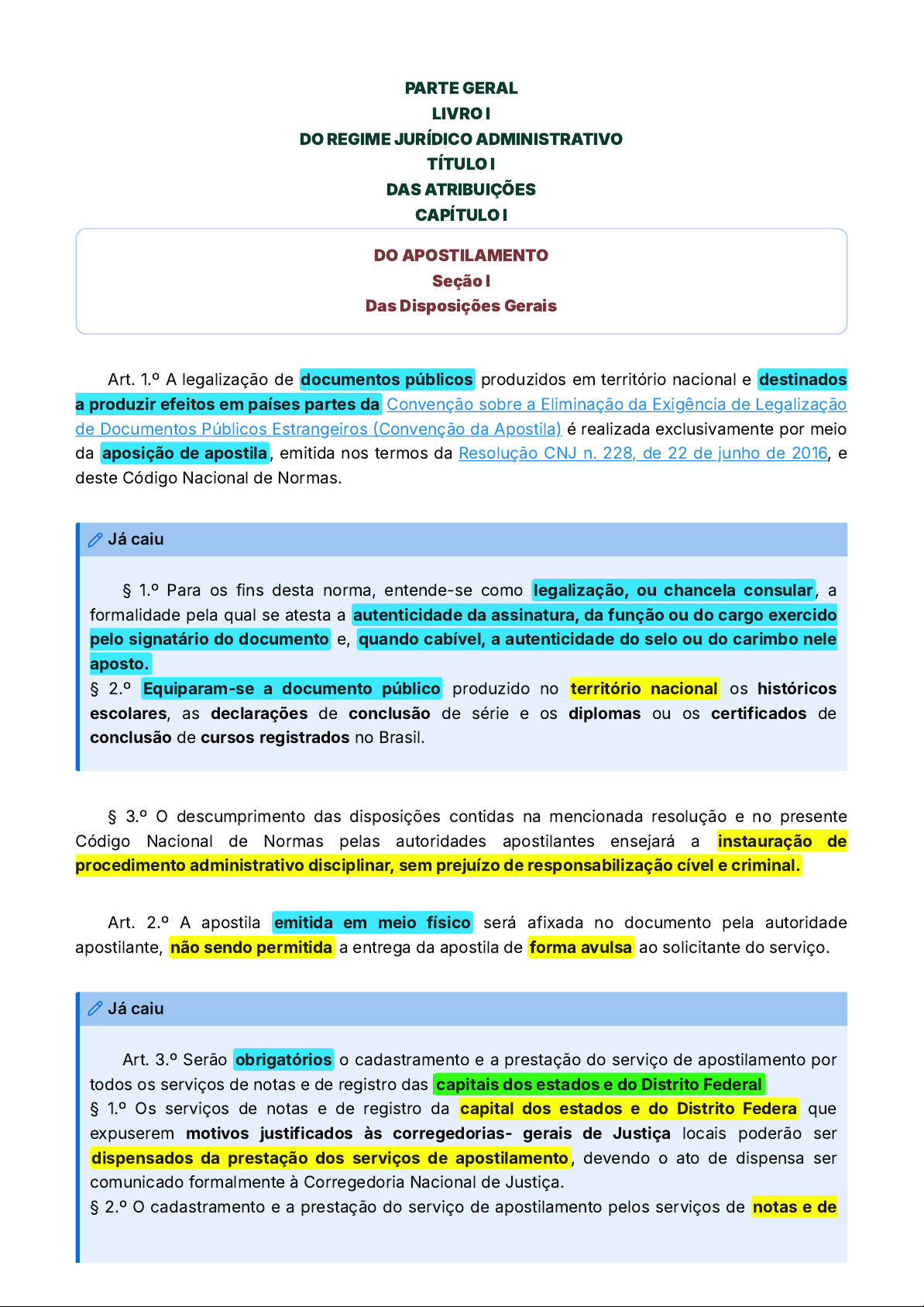 PARTE GERAL LIVRO I DO REGIME JURÍDICO ADMINISTRATIVO TÍTULO I DAS ATRIBUIÇÕES CAPÍTULO I DO APOSTILAMENTO Seção I Das Disposições Gerais Art. 1.º A legalização de documentos públicos produzidos em território nacional e destinados a produzir efeitos em países partes da Convenção sobre a Eliminação da Exigência de Legalização de Documentos Públicos Estrangeiros Convenção da Apostila) é realizada exclusivamente por meio da aposição de apostila , emitida nos termos da Resolução CNJ n. 228, de 22 de junho de 2016, e deste Código Nacional de Normas. § 3.º O descumprimento das disposições contidas na mencionada resolução e no presente Código Nacional de Normas pelas autoridades apostilantes ensejará a instauração de procedimento administrativo disciplinar, sem prejuízo de responsabilização cível e criminal. Art. 2.º A apostila emitida em meio físico será afixada no documento pela autoridade apostilante, não sendo permitida a entrega da apostila de forma avulsa ao solicitante do serviço. Já caiu § 1.º Para os fins desta norma, entende-se como legalização, ou chancela consular , a formalidade pela qual se atesta a autenticidade da assinatura, da função ou do cargo exercido pelo signatário do documento e, quando cabível, a autenticidade do selo ou do carimbo nele aposto. § 2.º Equiparam-se a documento público produzido no território nacional os históricos escolares, as declarações de conclusão de série e os diplomas ou os certificados de conclusão de cursos registrados no Brasil. Já caiu Art. 3.º Serão obrigatórios o cadastramento e a prestação do serviço de apostilamento por todos os serviços de notas e de registro das capitais dos estados e do Distrito Federal § 1.º Os serviços de notas e de registro da capital dos estados e do Distrito Federa que expuserem motivos justificados às corregedorias- gerais de Justiça locais poderão ser dispensados da prestação dos serviços de apostilamento , devendo o ato de dispensa ser comunicado formalmente à Corregedoria Nacional de Justiça. § 2.º O cadastramento e a prestação do serviço de apostilamento pelos serviços de notas e de https://www.planalto.gov.br/ccivil_03/_ato2015-2018/2016/decreto/d8660.htm https://www.planalto.gov.br/ccivil_03/_ato2015-2018/2016/decreto/d8660.htm https://atos.cnj.jus.br/atos/detalhar/2299 § 3.º O ato de credenciamento das autoridades apostilantes será realizado pelas corregedorias-gerais de Justiça dos estados e do Distrito Federal, às quais compete enviar à Corregedoria Nacional de Justiça listagem com a identificação das autoridades aptas à prestação do serviço de apostilamento, devidamente capacitadas nos termos do art. 4.°, § 1.º e § 2.º, deste Código Nacional de Normas, e com os dados necessários ao cadastro, conforme Anexo do Provimento n. 62, de 14 de novembro de 2017. Art. 4.º O serviço notarial e de registro exercerá o apostilamento por delegação do Conselho Nacional de Justiça CNJ. § 1.º O apostilamento poderá ser executado por qualquer notário ou registrador cadastrado, mediante capacitação oferecida por suas entidades de classe, sob supervisão da Corregedoria Nacional de Justiça, independentemente de especialização do serviço ou de circunscrição territorial. § 2.º O responsável pela serventia e os escreventes autorizados já cadastrados deverão participar e obter aprovação no curso de capacitação a que se refere o § 1.º deste artigo. § 3.º Ao apostilar documentos emitidos por serviço notarial ou registral, a autoridade apostilante deverá verificar a função e a autenticidade da assinatura do subscritor mediante consulta às centrais de sinais públicos das respectivas especialidades, cujo acesso deverá ser franqueado às autoridades apostilantes para este fim. § 4.º Será mantida, no sistema eletrônico de apostilamento, ferramenta relacionada a banco de dados de sinais públicos de autoridades brasileiras, para fins de coleta de seus padrões de sinais públicos, assim como identificação civil e documentação comprobatória do cargo ou função exercida, cumprindo-se as formalidades constantes do art. 3.º da Convenção sobre a Eliminação da Exigência de Legalização de Documentos Públicos Estrangeiros, firmada pela República Federativa do Brasil, em Haia, em 5 de outubro de 1961, para consulta e conferência pelas autoridades apostilantes. § 5.º No caso de vacância ou afastamento do titular do serviço notarial e de registro, o serviço será prestado pelo designado responsável do serviço extrajudicial. Art. 5.º A aposição de apostila em documento público brasileiro somente será admitida por autoridade apostilante devidamente cadastrada no sistema eletrônico de apostilamento disponibilizado gratuitamente pelo Conselho Nacional de Justiça CNJ, para a confecção, consulta e aposição de apostila. § 1.º As apostilas serão assinadas com certificado digital e registradas pelo emissor. registro do interior de cada Estado serão facultativos , mas recomendáveis para conferir melhor capilaridade ao serviço. https://atos.cnj.jus.br/atos/detalhar/2524 https://atos.cnj.jus.br/atos/detalhar/2524 https://www.planalto.gov.br/ccivil_03/_ato2015-2018/2016/decreto/d8660.htm https://www.planalto.gov.br/ccivil_03/_ato2015-2018/2016/decreto/d8660.htm § 2.º A gestão, administração e manutenção do sistema poderá ser delegada pela Corregedoria Nacional de Justiça à Associação de Notários e Registradores do Brasil Anoreg/BR) ou outra entidade de representação nacional de todas as especialidades notariais e registrais que venha a substituí-la, mediante a celebração de Termo de Cooperação Técnica com os seus institutos membros, no qual serão definidos deveres, responsabilidades, critérios de rateio dos custos, prazo para transição, condições em caso da extinção da delegação prevista neste parágrafo, entre outras disposições perti