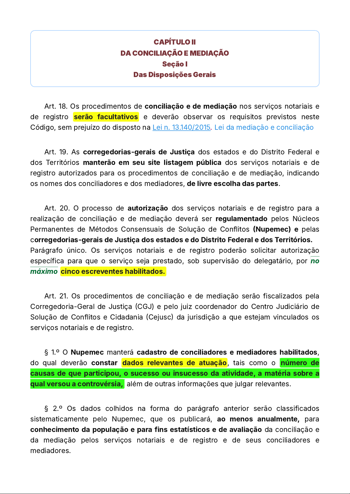 Art. 18. Os procedimentos de conciliação e de mediação nos serviços notariais e
