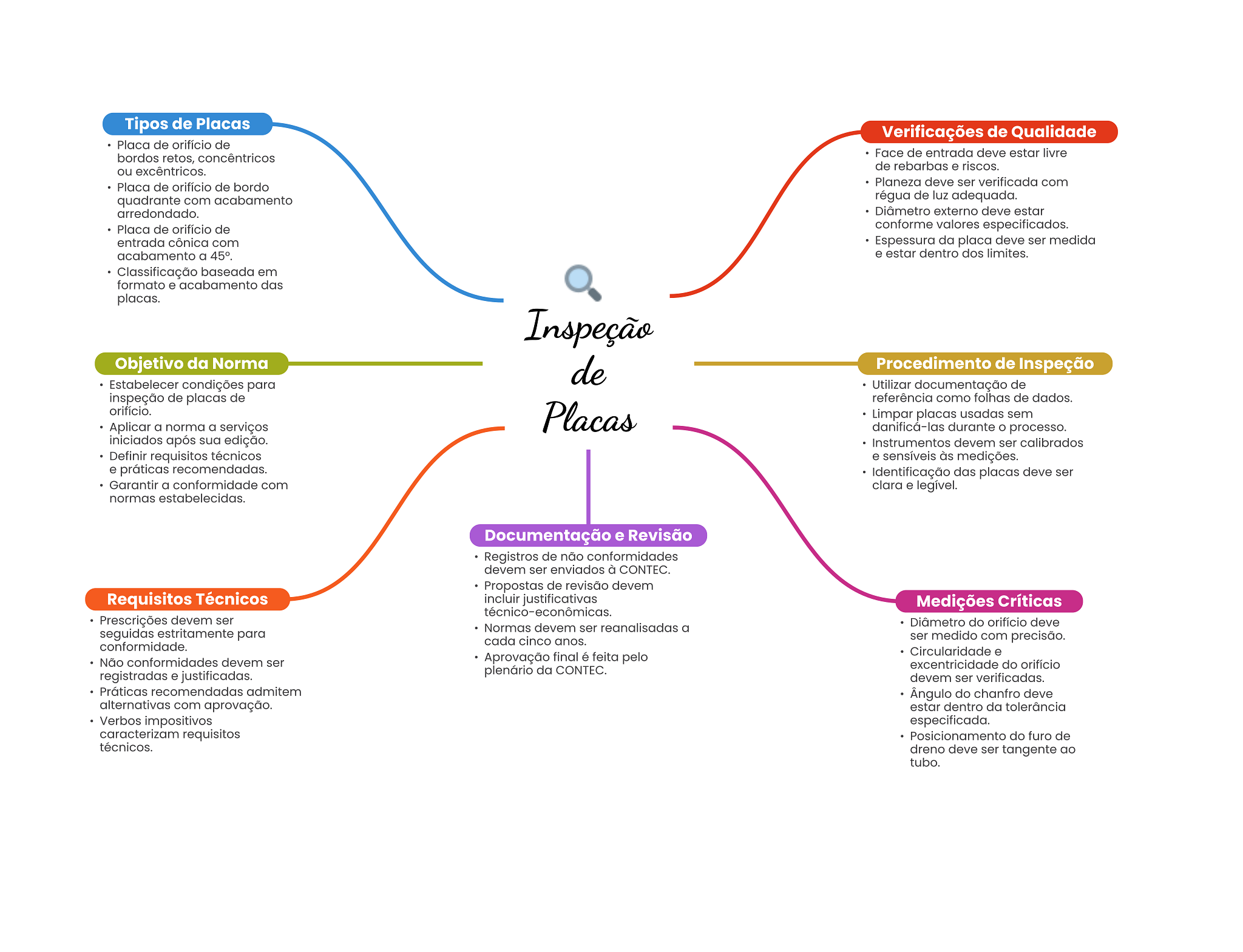 Tipos de Placas Verificações de Qualidade Placa de orifício de bordos retos, concêntricos Face de entrada deve estar livre ou excêntricos. de rebarbas e riscos. Placa de orifício de bordo Planeza deve ser verificada com quadrante com acabamento régua de luz adequada. arredondado. Diâmetro externo deve estar Placa de orifício de conforme valores especificados. entrada cônica com Espessura da placa deve ser medida acabamento a 45°. e estar dentro dos limites. Classificação baseada em formato e acabamento das placas. Inspeção Objetivo da Norma de Procedimento de Inspeção Estabelecer condições para Utilizar documentação de inspeção de placas de referência como folhas de dados. orifício. Placas Limpar placas usadas sem Aplicar a norma a serviços danificá-las durante O processo. iniciados após sua edição. Instrumentos devem ser calibrados Definir requisitos técnicos e sensíveis às medições. e práticas recomendadas. Identificação das placas deve ser Garantir a conformidade com clara e legível. normas estabelecidas. Documentação e Revisão Registros de não conformidades devem ser enviados à CONTEC. Propostas de revisão devem Requisitos Técnicos incluir justificativas Medições Críticas técnico-econômicas. Prescrições devem ser Normas devem ser reanalisadas a Diâmetro do orifício deve seguidas estritamente para conformidade. cada cinco anos. ser medido com precisão. Não conformidades devem ser Aprovação final é feita pelo Circularidade e excentricidade do orifício registradas e justificadas. plenário da CONTEC. devem ser verificadas. Práticas recomendadas admitem Ângulo do chanfro deve alternativas com aprovação. estar dentro da tolerância Verbos impositivos especificada. caracterizam requisitos Posicionamento do furo de técnicos. dreno deve ser tangente ao tubo.