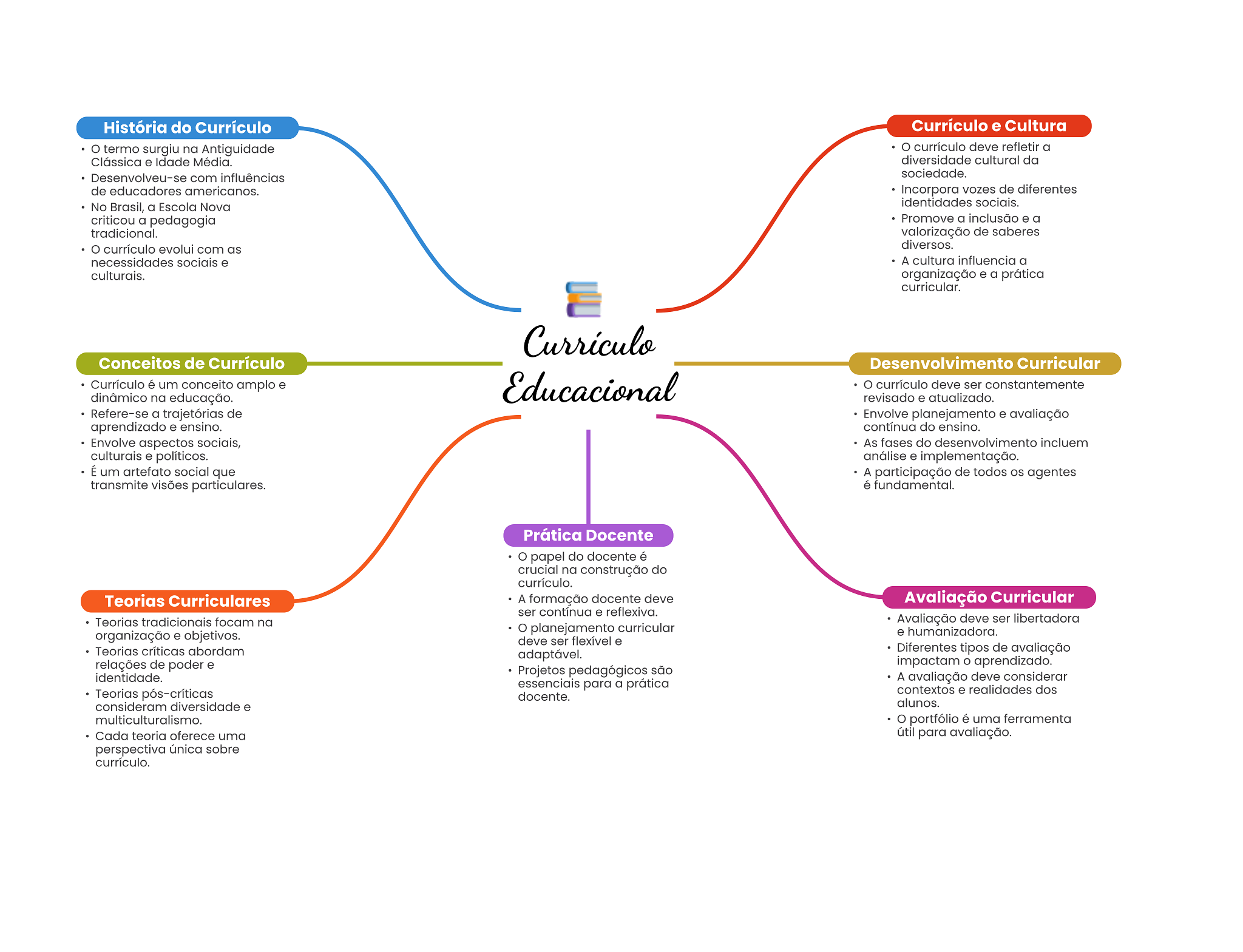 História do Currículo Currículo e Cultura termo surgiu na Antiguidade deve refletir a Clássica e Idade Média. diversidade cultural da Desenvolveu-se com influências sociedade. de educadores americanos. Incorpora vozes de diferentes No Brasil, a Escola Nova identidades sociais. criticou a pedagogia Promove a inclusão e a tradicional. valorização de saberes currículo evolui com as diversos. necessidades sociais e A cultura influencia a culturais. organização e a prática curricular. Currículo Conceitos de Currículo Desenvolvimento Curricular Currículo é um conceito amplo e Educacional currículo deve ser constantemente dinâmico na educação. revisado e atualizado. Refere-se a trajetórias de Envolve planejamento e avaliação aprendizado e ensino. contínua do ensino. Envolve aspectos sociais, As fases do desenvolvimento incluem culturais e políticos. análise e implementação. É um artefato social que A participação de todos agentes transmite visões particulares. é fundamental. Prática Docente papel do docente é crucial na construção do currículo. Teorias Curriculares A formação docente deve Avaliação Curricular ser contínua e reflexiva. Teorias tradicionais focam na Avaliação deve ser libertadora planejamento curricular organização e objetivos. e humanizadora. deve ser flexível e Teorias críticas abordam adaptável. Diferentes tipos de avaliação relações de poder e impactam aprendizado. identidade. Projetos pedagógicos são essenciais para a prática A avaliação deve considerar Teorias pós-críticas contextos e realidades dos docente. consideram diversidade e alunos. multiculturalismo. portfólio é uma ferramenta Cada teoria oferece uma útil para avaliação. perspectiva única sobre currículo.