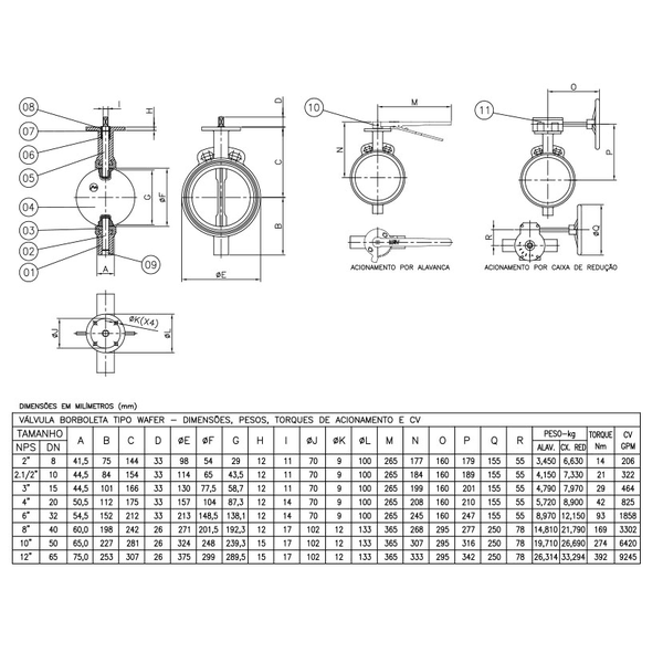 0 D 08 I 10 11 07 N 06 C 05 G OF 04 03 B R 02 A 09 POR ALAVANCA 01 CAIXA DE REDUÇÃO EM MILIMETROS (mm) VALVULA BORBOLETA TIPO WAFER - PESOS, TORQUES DE ACIONAMENTO CV TAMANHO TORQUE 2 A B C D OF G H I #L M N 0 P Q R NPS DN ALAV. RED Nm GPM 2" 8 41,5 75 144 33 98 54 29 12 11 70 9 100 265 177 160 179 155 55 3,450 6,630 14 206 2.1/2" 10 44,5 84 154 33 114 65 43,5 12 11 70 9 100 265 184 160 189 155 55 4,150 7,330 21 322 3" 15 44,5 101 166 33 130 77,5 58,7 12 11 70 9 100 265 199 160 201 155 55 4,790 7,970 29 464 4" 20 50,5 112 175 33 157 104 12 14 70 9 100 265 208 160 210 155 55 5,720 8,900 42 825 6" 32 54,5 152 212 33 213 148,5 138,1 12 14 70 9 100 265 245 160 247 155 55 8,970 12,150 93 1858 8" 40 60,0 198 242 26 271 201,5 192.3 12 17 102 12 133 365 268 295 277 250 78 14,810 21,790 169 3302 10" 50 65,0 227 281 26 324 248 15 17 102 12 133 365 307 295 316 250 78 19,710 26,690 274 6420 12" 65 75,0 253 307 26 375 299 289,5 15 17 102 12 133 365 333 295 342 250 78 26,314 33,294 392 9245