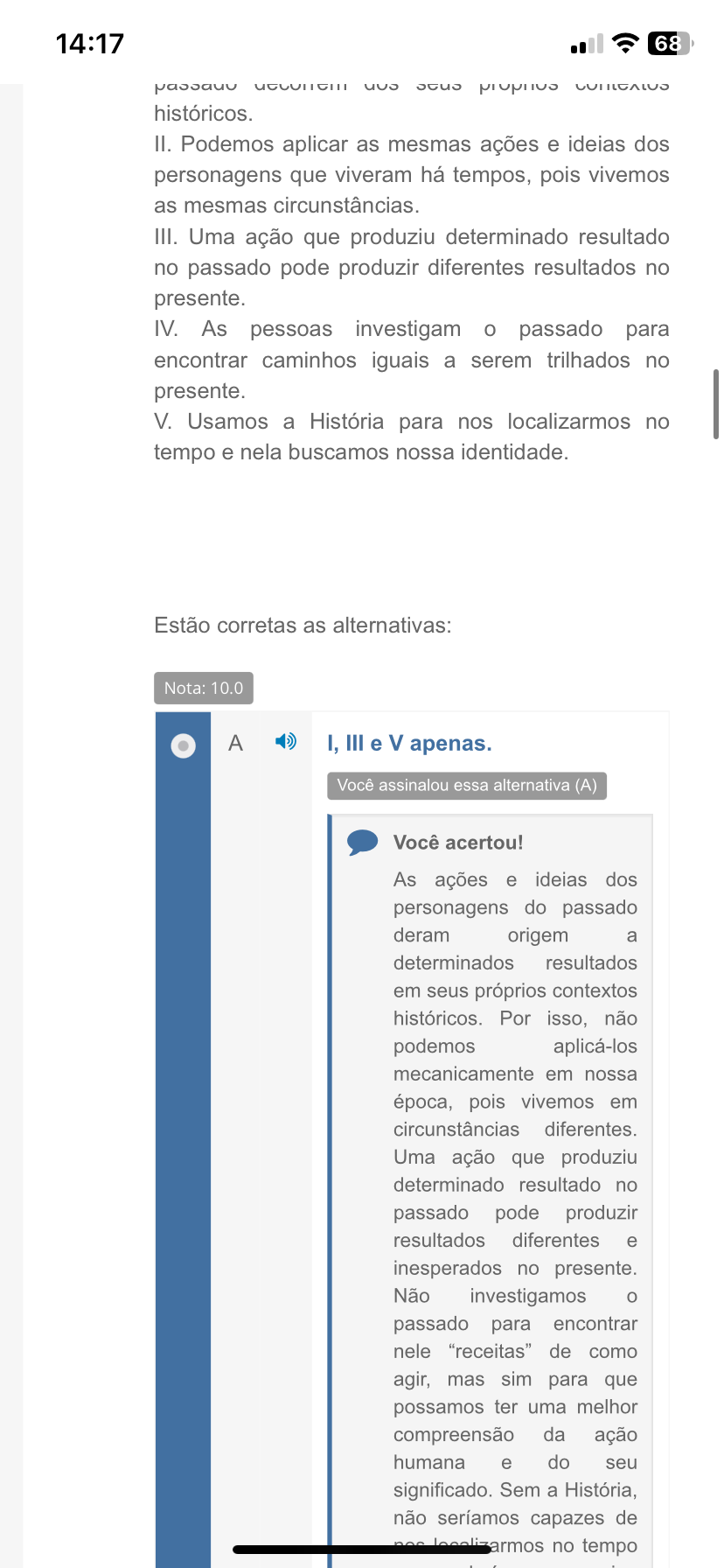 14:17 68 históricos. II. Podemos aplicar as mesmas ações e ideias dos personagens que viveram há tempos, pois vivemos as mesmas circunstâncias. III. Uma ação que produziu determinado resultado no passado pode produzir diferentes resultados no presente. IV. As pessoas investigam o passado para encontrar caminhos iguais a serem trilhados no presente. V. Usamos a História para nos localizarmos no tempo e nela buscamos nossa identidade. Estão corretas as alternativas: Nota: 10.0 A I, III e V apenas. Você assinalou essa alternativa (A) Você acertou! As ações e ideias dos personagens do passado deram origem a determinados resultados em seus próprios contextos históricos. Por isso, não podemos aplicá-los mecanicamente em nossa época, pois vivemos em circunstâncias diferentes. Uma ação que produziu determinado resultado no passado pode produzir resultados diferentes e inesperados no presente. Não investigamos passado para encontrar nele "receitas" de como agir, mas sim para que possamos ter uma melhor compreensão da ação humana e do seu significado. Sem a História, não seríamos capazes de armos no tempo