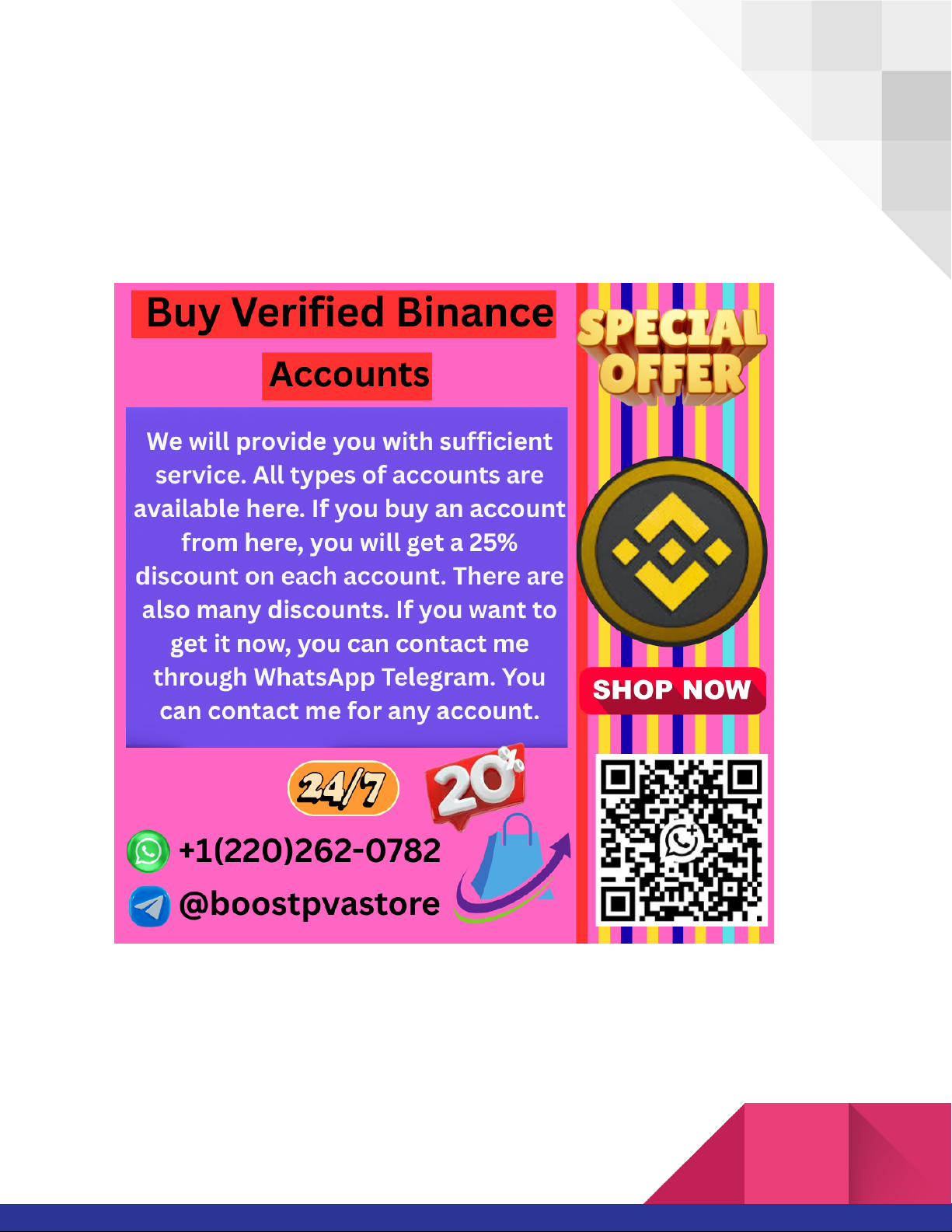 Boostpvastore: Your Ultimate Guide to Binance Accounts in the USA Cryptocurrency trading has become increasingly popular in the USA, and Binance stands as one of the most trusted platforms for both beginners and experienced traders. This guide will take you step by step through creating, managing, and optimizing your Binance account, helping you trade safely and effectively. If you are looking for a secure, efficient, and user-friendly experience, boostpvastore is your go-to reference. Step 1: Understanding Binance and Its Features ● ➤WhatsApp:+1(220)262-0782 ➤Telegram: @boostpvastore Before creating an account, it’s crucial to understand what Binance offers. Binance is a global cryptocurrency exchange that provides: ● Trading in hundreds of cryptocurrencies. ● Advanced trading tools and analytics. ● Secure wallets and payment methods. ● Mobile and desktop platforms for seamless trading. Using boostpvastore techniques, you can maximize your trading efficiency while keeping your accounts secure. Step 2: Creating a Binance Account in the USA Creating a Binance account is simple but must follow US regulations. Here’s a step-by-step guide: 1. Visit Binance’s Official Website ○ Ensure you are accessing Binance through the official portal. ○ Avoid third-party links to prevent risks. 2. Sign Up Using Your Email or Phone Number https://wa.me/12202620782 http://t.me/boostpvastore ○ Enter a valid email address or phone number. ○ Create a strong password (use numbers, symbols, and uppercase letters). 3. Verify Your Identity (KYC) 4. ➤WhatsApp:+1(220)262-0782 5. ➤Telegram: @boostpvastore ○ US users must complete identity verification. ○ Submit government-issued ID and proof of residence. ○ Identity verification is essential for security and legal compliance. 6. Set Up Two-Factor Authentication (2FA) ○ Enhance account security using Google Authenticator or SMS authentication. ○ This step reduces the risk of unauthorized access. By following these steps and incorporating boostpvastore best practices, you ensure a safe start on Binance. Step 3: Funding Your Binance Account Once your account is verified, you need to deposit funds to start trading: ● Bank Transfer (ACH or Wire Transfer) – Safe and recommended for larger deposits. ● Debit/Credit Card – Faster but may have higher fees. ● Cryptocurrency Deposit – Transfer crypto from another wallet to Binance. https://wa.me/12202620782 http://t.me/boostpvastore Pro tip from boostpvastore: Always start with small deposits to understand transaction processes before committing larger amounts. ● ➤WhatsApp:+1(220)262-0782 ➤Telegram: @boostpvastore Step 4: Navigating Binance Dashboard The Binance dashboard can look complex at first. Here’s a breakdown: 1. Spot Trading – Buy and sell cryptocurrencies instantly. 2. Futures Trading – Trade cryptocurrency contracts with leverage. 3. Staking & Savings – Earn passive income by staking coins. 4. Wallet Management – Monitor deposits, withdrawals, and balances. A well-organized approach using boostpvastore strategies makes your trading smoother and more profitable. Step 5: Trading Cryptocurrencies Safely Trading requires careful planning: ● Start Small – Trade small amounts to minimize risk. ● Set Stop-Loss Orders – Protect yourself from major losses. ● Diversify Portfolio – Don’t invest all funds in a single cryptocurrency. ● Monitor Market Trends – Use Binance’s analytics tools for informed decisions. https://wa.me/12202620782 http://t.me/boostpvastore Using boostpvastore, you can follow these trading strategies to optimize performance without taking unnecessary risks. ● ➤WhatsApp:+1(220)262-0782 ➤Telegram: @boostpvastore Step 6: Advanced Security Tips Security is crucial for Binance users. Here are advanced safety measures: ● Enable Withdrawal Whitelists – Only allow withdrawals to trusted addresses. ● Avoid public Wi-Fi when trading. ● Regularly update passwords and security apps. ● Monitor account activity for suspicious behavior. With boostpvastore guidance, these practices protect your investments effectively. Step 7: Mobile Trading on Binance Binance offers mobile apps for iOS and Android. Benefits include: ● Trading on the go. ● Price alerts and instant notifications. ● Quick deposits and withdrawals. ● User-friendly interface optimized for small screens. Boostpvastore tips: Use the mobile app to track markets in real-time and execute trades instantly. https://wa.me/12202620782 http://t.me/boostpvastore Step 8: Common Mistakes to Avoid ● ➤WhatsApp:+1(220)262-0782 ➤Telegram: @boostpvastore Even experienced traders make mistakes. Here’s what to avoid: ● Ignoring KYC verification requirements. ● Using weak passwords or skipping 2FA. ● Trading impulsively without strategy. ● Ignoring market trends or analytics. Following boostpvastore recommendations ensures safer and smarter trading habits. Step 9: Maximizing Binance Benefits Binance offers tools to help you grow your investments: ● Binance Earn – Passive income through staking and savings. ● Binance Launchpad – Early access to promising new tokens. ● Referral Programs – Invite friends to boost rewards. ● Educational Resources – Learn trading strategies through Binance Academy. Implementing boostpvastore methods maximizes the value you get from each feature.Step 10: Step-by-Step Trading Strategy for Beginners https://wa.me/12202620782 http://t.me/boostpvastore 1. Start with a small investment (e.g., $100–$200). 2. ➤WhatsApp:+1(220)262-0782 3. ➤Telegram: @boostpvastore 4. Choose 2–3 stable cryptocurrencies (e.g., BTC, ETH, USDT). 5. Set clear goals: short-term vs long-term. 6. Use Binance analytics tools to monitor market performance. 7. Gradually increase investment based on experience. 8. Always review your trades and learn from mistakes. With boostpvastore guidance, even beginners can trade efficiently and safely