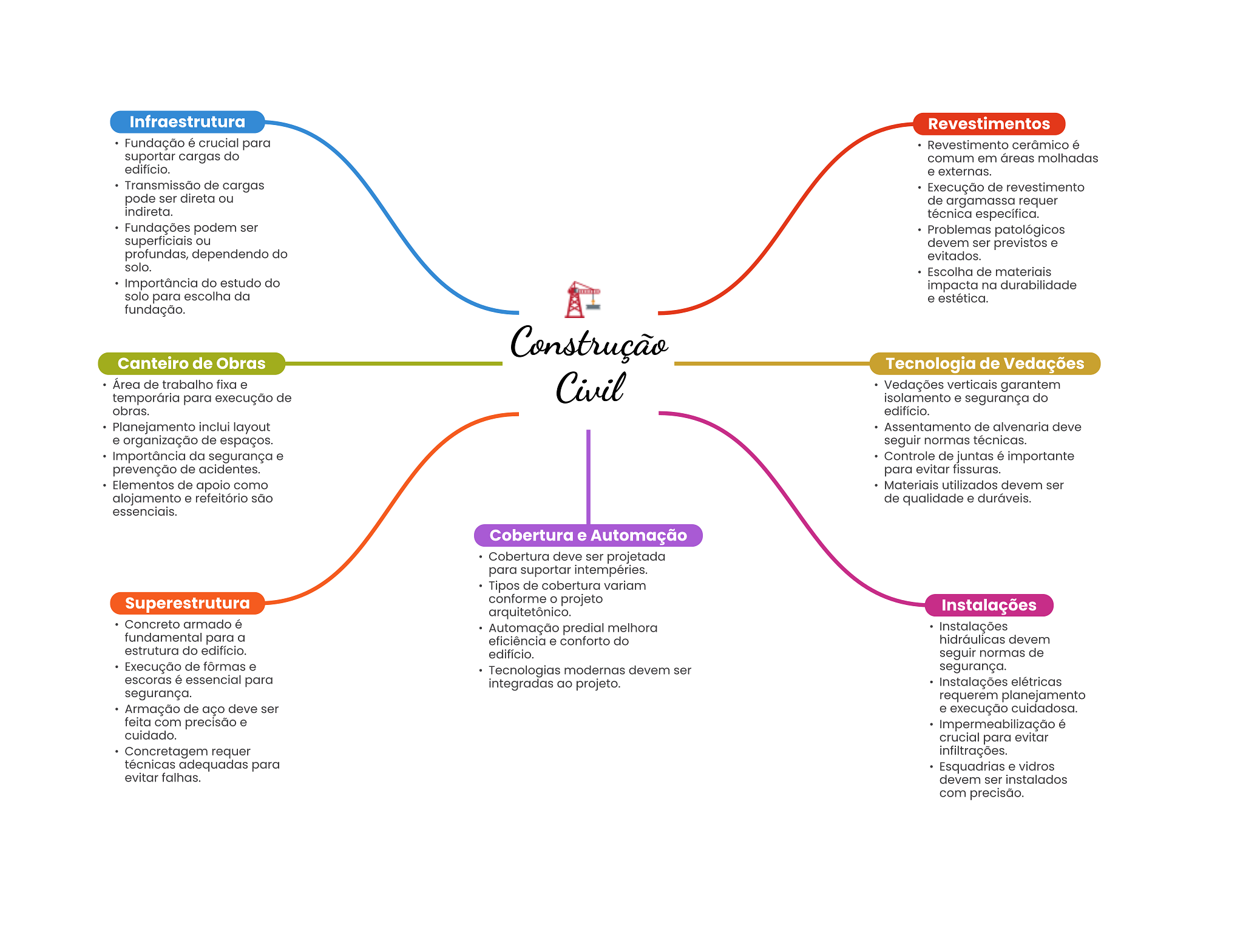 Infraestrutura Revestimentos Fundação é crucial para Revestimento cerâmico é suportar cargas do comum em áreas molhadas edifício. e externas. Transmissão de cargas Execução de revestimento pode ser direta ou de argamassa requer indireta. técnica específica. Fundações podem ser Problemas patológicos superficiais ou devem ser previstos e profundas, dependendo do evitados. solo. Escolha de materiais Importância do estudo do impacta na durabilidade solo para escolha da e estética. fundação. Construção Canteiro de Obras Tecnologia de Vedações Área de trabalho fixa e Civil Vedações verticais garantem temporária para execução de isolamento e segurança do obras. edifício. Planejamento inclui layout Assentamento de alvenaria deve e organização de espaços. seguir normas técnicas. Importância da segurança e Controle de juntas é importante prevenção de acidentes. para evitar fissuras. Elementos de apoio como Materiais utilizados devem ser alojamento e refeitório são de qualidade e duráveis. essenciais. Cobertura e Automação Cobertura deve ser projetada para suportar intempéries. Tipos de cobertura variam Superestrutura conforme projeto arquitetônico. Instalações Concreto armado é Automação predial melhora Instalações fundamental para a eficiência e conforto do hidráulicas devem estrutura do edifício. edifício. seguir normas de Execução de fôrmas e Tecnologias modernas devem ser segurança. escoras é essencial para integradas ao projeto. Instalações elétricas segurança. requerem planejamento Armação de aço deve ser e execução cuidadosa. feita com precisão e Impermeabilização é cuidado. crucial para evitar Concretagem requer infiltrações. técnicas adequadas para Esquadrias e vidros evitar falhas. devem ser instalados com precisão.