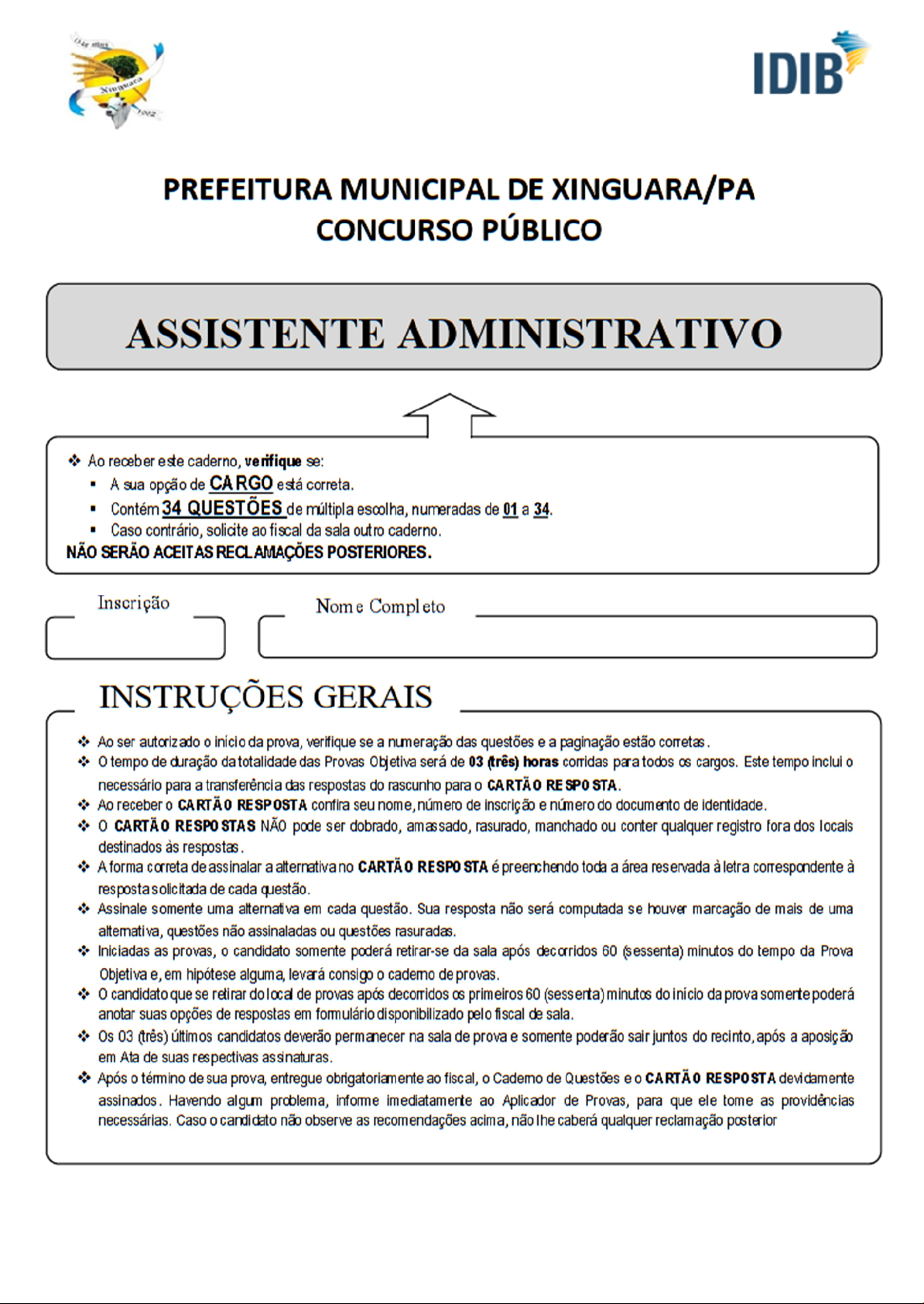 IDIB PREFEITURA MUNICIPAL DE XINGUARA/PA CONCURSO PÚBLICO ASSISTENTE Ao receber este caderno, verifique se: A sua opção de CARGO está correta. Contém 34 QUESTÕES de múltipla escolha, numeradas de 01 a 34. Caso contrário, solicite ao fiscal da sala outro caderno. NÃO SERÃO ACEITAS RECLAMAÇÕES POSTERIORES. Inscrição Nom e Completo INSTRUÇÕES GERAIS Ao ser autorizado início da prova, verifique se a numeração das questões e a paginação estão corretas. 0 tempo de duração da totalidade das Provas Objetiva será de 03 (três) horas corridas para todos cargos. Este tempo inclui necessário para a transferência das respostas do rascunho para CARTÃO RE SPO STA. Ao receber CARTÃO RESPOSTA confira seu nome, número de inscrição e número do documento de identidade. 0 CARTÃO NÃO pode ser dobrado, amassado, rasurado, manchado ou conter qualquer registro fora dos locais destinados às A forma correta de assinalar a alternativa no CARTÃO RESPO STA é preenchendo toda a área reservada à letra correspondente à resposta solicitada de cada questão. Assinale somente uma alternativa em cada questão. Sua resposta não será computada se houver marcação de mais de uma alternativa, questões não assinaladas ou questões rasuradas. Iniciadas as provas, candidato somente poderá retirar-se da sala após decorridos 60 (sessenta) minutos do tempo da Prova Objetiva e, em hipótese alguma, levará consigo cademo de provas. 0 candidato que se retirar do local de provas após decorridos primeiros 60 minutos do início da prova somente poderá anotar suas opções de respostas em formulário disponibilizado pelo fiscal de sala. Os 03 (três) últimos candidatos deverão permanecer na sala de prova e somente poderão sair juntos do recinto, após a aposição em Ata de suas respectivas assinaturas. Após de sua prova, entregue obrigatoriamente ao fiscal, Cademo de Questões eo CARTÃO RESPOSTA devidamente assinados. Havendo algum problema, informe imediatamente ao Aplicador de Provas, para que ele tome as providências necessárias. Caso candidato não observe as recomendações acima, não lhe caberá qualquer reclamação posteriorIDIB CARGO: ASSISTENTE ADMINISTRATIVO PORTUGUE TEXTO 1. Élcio Batista, em seu texto, defende a tese (ideia principal) de que Ascensão social A) sem educação e saúde a sociedade brasileira irá regredir em Batista, em 22/05/2019 suas poucas conquistas socioeconômicas. B) cada um deve lutar por seus objetivos e enfrentar as Vivemos em sociedades em que os individuos se dificuldades, pois só com esforço individual a ascensão distinguem e se tornam desiguais pela quantidade dos capitais social pode acontecer. simbólicos social, cultural e intelectual (S.C.I). acumulados ao C) a sociedade precisa ser dinâmica e oportunidades de longo da vida. mercado de trabalho é um"mercado de capitais", mobilidade para que os cidadãos possam alcançar ascensão onde se medem, se vendem e se compram determinadas social. quantidades de habilidades e capacidades. 0 capital econômico é D) nas sociedades menos desiguais, percebe-se também que há consequência deste processo de acúmulo e troca. um convivio mais harmônico entre os seus cidadãos. Numa sociedade ideal, os individuos teriam oportunidades iguais para adquirirem os capitais (S.C.I.). Na prática, há fatores "decisivos" que impedem alcançar a igualdade 2. Ao dizer que "O desencontro cria um ciclo vicioso", termo de condições entre os A familia é primeiro deles. A "desencontro" refere-se a escola, segundo. 0 território, terceiro. Dependendo da sociedade, parte-se em menor ou maior A) incompatibilidade de interesses entre 0 Governo Federal e a desvantagem. Os escandinavos se estruturaram para equilibrar a população mais carente. competição. Os brasileiros se especializaram no desequilibrio. No B) ausência de interação entre públicos de dasses e valores primeiro caso, a mobilidade social é favorecida. No segundo, ela socioculturais diferentes. é reduzida e os processos de exclusão bloqueiam acesso aos C) carência de um sistema educacional de qualidade para todos capitais simbólicos capazes de romper com os ciclos históricos os cidadãos brasileiros. que reproduzem as posições e disposições desvalorizadas. D) deficiência de inciativas governamentais em promover a Uma das principais dificuldades dos pobres está na ascensão social de seus cidadãos. aquisição de capital social. Suas redes são fracas, pequenas e homogêneas. 0 cotidiano numa rede de pessoas em situação social muito semelhante afasta a ampliação dos capitais. A 3. "Vivemos em sociedades em que os indivíduos se distinguem e se tornam desiguais pela quantidade dos capitais interação com pessoas de cidos sociais, culturais e econômicos diferentes é fundamental para conectar indivíduos e oportunidades. desencontro cria um ciclo vicioso. São palavras proparoxitonas, e assim como "simbólicos" A ascensão social é uma aspiração fundamental na vida dos individuos. Numa sociedade livre e democrática, deve precisam ser acentuadas, todas aquelas que estão presentes no item no centro de todo e qualquer projeto de desenvolvimento sustentável. 0 bom estímulo material, financeiro ou simbólico A) interim tropego inospito. é aquele que produz dinamismo. Numa sociedade estagnada, os B) recorde fosforo audacia. individuos não aspiram, sonham ou projetam. Não se cria riqueza. C) rubrica ingrime semaforo. A sociedade brasileira estagnou! Como fugir da armadilha que nos D) sonambulo academico amiude. impomos? Desenhando um modelo que enfrente os determinantes (familia, escola e território) que imobilizam a sociedade. Construir futuro investindo nas familias mais pobres, 4. "Na prática, há fatores "decisivos" que impedem alcançar a numa educação de excepcional qualidade, emciência, tecnologia, igualdade de condições entre individuos". Sobre 0 verbo inovação e na infraestrutura social, cultural e econ