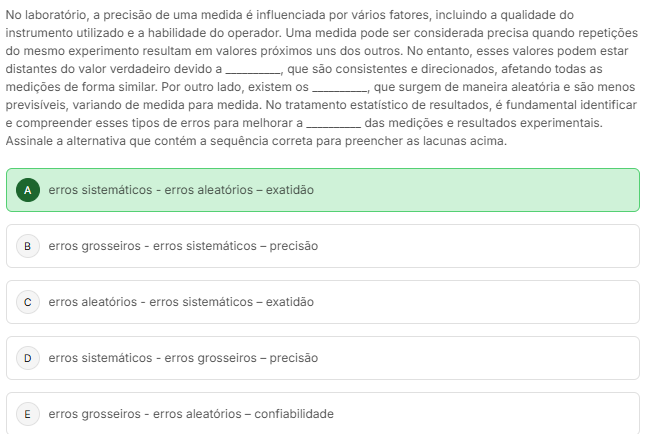 No laboratório, a precisão de uma medida é influenciada por fatores, incluindo a qualidade do instrumento utilizado e a habilidade do operador. Uma medida pode ser considerada precisa quando repetições do mesmo experimento resultam em valores proximos uns dos outros. No entanto, esses valores podem estar distantes do valor verdadeiro devido a que são consistentes e direcionados, afetando todas as medições de forma similar. Por outro lado, existem que surgem de maneira aleatoria e são menos previsiveis, variando de medida para medida. No tratamento de resultados, é fundamental identificar e compreender esses tipos de erros para melhorar a das medições e resultados experimentais. Assinale a alternativa que a sequência correta para preencher as lacunas acima. A erros sistemáticos - erros aleatórios - exatidão B erros grosseiros erros sistemáticos - precisão C erros erros sistemáticos - exatidão D erros erros grosseiros - precisão E erros grosseiros erros confiabilidade