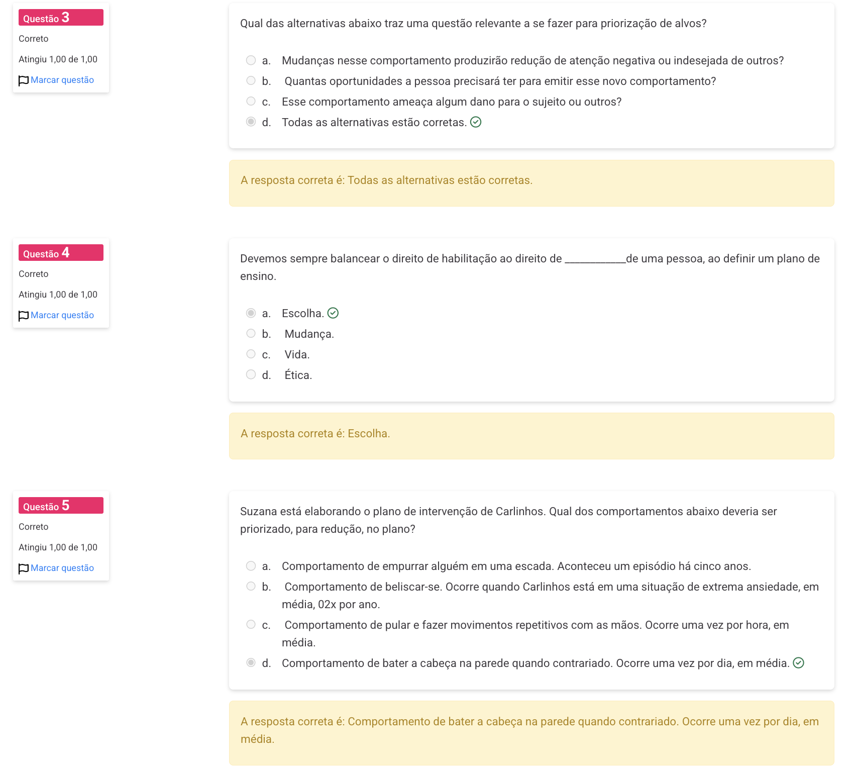 Questão 3 Qual das alternativas abaixo traz uma questão relevante a se fazer para priorização de alvos? Correto Atingiu 1,00 de 1,00 a. Mudanças nesse comportamento produzirão redução de atenção negativa ou indesejada de outros? Marcar questão b. Quantas oportunidades a pessoa precisará ter para emitir esse novo comportamento? C. Esse comportamento ameaça algum dano para sujeito ou outros? d. Todas as alternativas estão corretas. A resposta correta é: Todas as alternativas estão corretas. Questão 4 Devemos sempre balancear direito de habilitação ao direito de de uma pessoa, ao definir um plano de Correto ensino. Atingiu 1,00 de 1,00 Marcar questão a. Escolha. b. Mudança. C. Vida. d. Ética. A resposta correta é: Escolha. Questão 5 Suzana está elaborando plano de intervenção de Carlinhos. Qual dos comportamentos abaixo deveria ser Correto priorizado, para redução, no plano? Atingiu 1,00 de 1,00 Marcar questão a. Comportamento de empurrar alguém em uma escada. Aconteceu um episódio há cinco anos. b. Comportamento de beliscar-se. Ocorre quando Carlinhos está em uma situação de extrema ansiedade, em média, 02x por ano. C. Comportamento de pular e fazer movimentos repetitivos com as mãos. Ocorre uma vez por hora, em média. d. Comportamento de bater a cabeça na parede quando contrariado. Ocorre uma vez por dia, em média. A resposta correta é: Comportamento de bater a cabeça na parede quando contrariado. Ocorre uma vez por dia, em média.