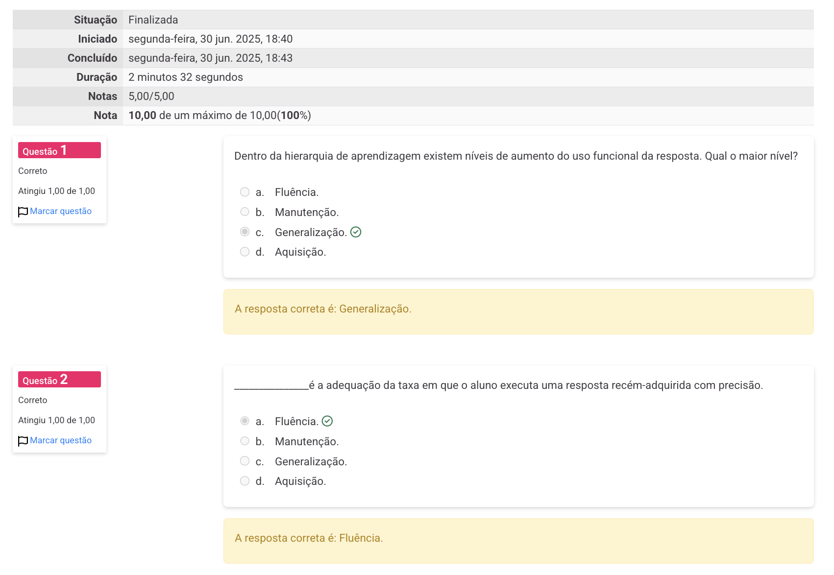 Situação Finalizada Iniciado segunda-feira, 30 jun. 2025, 18:40 Concluído segunda-feira, 30 jun. 2025, 18:43 Duração 2 minutos 32 segundos Notas 5,00/5,00 Nota 10,00 de um máximo de 10,00(100%) Questão 1 Dentro da hierarquia de aprendizagem existem níveis de aumento do uso funcional da resposta. Qual maior nível? Correto Atingiu 1,00 de 1,00 a. Fluência. Marcar questão b. Manutenção. C. Generalização. d. Aquisição. A resposta correta é: Generalização. Questão 2 é a adequação da taxa em que aluno executa uma resposta recém-adquirida com precisão. Correto Atingiu 1,00 de 1,00 a. Fluência. Marcar questão b. Manutenção. C. Generalização. d. Aquisição. A resposta correta é: Fluência.