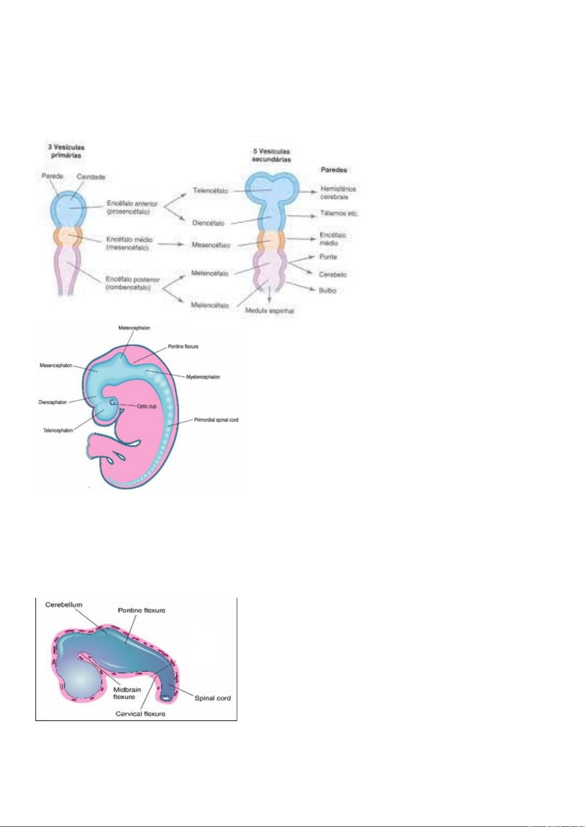 SISTEMA NERVOSO CENTRAL – ENCEFALO Relembrando A partir da parede do tubo neural teremos a formação do sistema nervoso central como o encéfalo e a medula 2/3 iniciais do tubo neural irão formar o encéfalo – a maior parte A região encefálica do tubo neural irá sofrer uma transformação, formando vesículas encefálicas (primaria e secundaria). Tudo isso tem início na 5 semana FLEXURAS ENCEFALICAS: estruturas que acabam influenciando no encéfalo O encéfalo do embrião cresce rapidamente e se dobra ventralmente: Surgindo assim: - Flexura cefálica (mesencefálica): região do mesencéfalo - Flexura cervical: entre rombencéfalo e medula Crescimento desigual do encéfalo entre as duas flexuras produz uma terceira flexura na direção oposta: - Flexura pontina: divide o encéfalo posterior e provoca afinamento do seu teto Essas flexuras têm a função: 1) Provocar uma considerável variação do contorno das secções transversais nos diferentes níveis do encéfalo 2) Interfere também na posição das substâncias cinzenta e branca DESENVOLVIMENTO DO ENCEFALO: De maneira geral, o início do desenvolvimento é dependente também da formação de placas alares e placas basais Logo o início do desenvolvimento do encéfalo irá se parecer com o desenvolvimento da medula Com um crescimento desigual da parede do tubo neural - Paredes laterais mais espessadas - Teto e assoalho mais delgados O Espessamento diferencial das placas alares e basais irá formar o sulco limitante: em que separa as partes dorsal e ventral ENCEFALO POSTERIOR: ROMBENCEFALO A flexura pontina irá ajudar na divisão do rombencéfalo em partes caudal (mielencéfalo) e rostral (metencéfalo) Da origem: PORÇÃO CAUDAL DO MIELENCEFALO: porção fechada do bulbo -Se assemelha a medula espinhal tanto no seu desenvolvimento, quanto em sua estrutura - Parede do tubo – formara a parede do bulbo - Canal neural do tubo neural forma o pequeno canal central do mielencéfalo - Substância cinzenta está localizada no centro - Neuroblastos das placas alares migram para as margens e formam áreas isoladas de substância cinzentas chamadas de núcleos gráceis (medialmente) e núcleos cuneiformes (lateralmente) O núcleo cuneiforme: está associado ao trato nervoso de mesmo nome vindo da medula espinhal - Na Área ventral teremos um par de feixes de fibras oriundas do córtex cerebral que formaram as pirâmides PORÇÃO ROSTRAL DO MIELENCEFALO: porção aberta do bulbo É ampla e bastante plana especificamente na frente da flexura pontinia Com o aparecimento da flexura pontinua, teremos: - O Deslocamento das paredes laterais do bulbo como as páginas de um livro aberto - Assim teremos a formação de uma parte de uma Cavidade – (4º ventrículo) Portanto conforme as paredes do bulbo se movem lateralmente - As Placa basais ficam distendida e adelgaçada - As Placas alares tornam-se laterais as placas basais – deslocando As placas irão sofrer diferenciação: -Placas basais: formara 3 núcleos eferentes - Placas alares: formara 4 núcleos aferentes e núcleo olivar Também teremos a formação dos plexos coroides no 4 ventrículo METENCEFALO: as paredes do metencéfalo formaram a Ponte e o Cerebelo e a cavidade formara a parte superior do 4 ventrículo - Ponte serve como uma via para as fibras nervosas entre a medula e córtex cerebral e cerebelar - Cerebelo é o centro de coordenação para a postura e movimento Na região do metencéfalo irá acontecer a mesma coisa que aconteceu na parte aberto do bulbo. Assim a flexura pontina desloca as paredes laterais da ponte - Teremos a formação das placas basais e alares (no qual as alares se deslocaram) Teremos também a transformação das placas basais e alares em outros núcleos: - Placas basais ---- formara 3 pares de núcleos eferentes - Placas alares ---- formara 3 pares de núcleos aferentes ----- Formara núcleos pontinos, cocleares, vestibulares e sensitivos do nervo trigêmeo Agora teremos a formação do CEREBELO Esse irá se formar através do espessamento das paredes dorsais das placas alares --- formando assim os intumescimentos cerebelares, essas começam a invadir os 4 ventrículos e irá sobrepor à ponte e ao bulbo Alguns neuroblastos na zona intermediaria das placas alares migram para zona marginal e se diferencia nos neurônios do córtex cerebelar. Outros neuroblastos dessa placa origina os núcleos centrais no qual o maior é os núcleos denteados As células das placas alares também originam outros núcleos como os pontinios, cocleares, vestibulares, sensorial Além disso, o cerebelo também irá sofrer giros, portanto formando o · Lobo floculonodular (arquicerebelo) – conexão com o aparelho vestibular · Lobo anterior e vérmis (paleocerebelo) – informações sensitivas vindas dos membros · Lobo posterior (neocerebelo) – controle seletivo dos movimentos dos membros image6.png image7.png image1.png image2.png image3.png image4.png image5.png