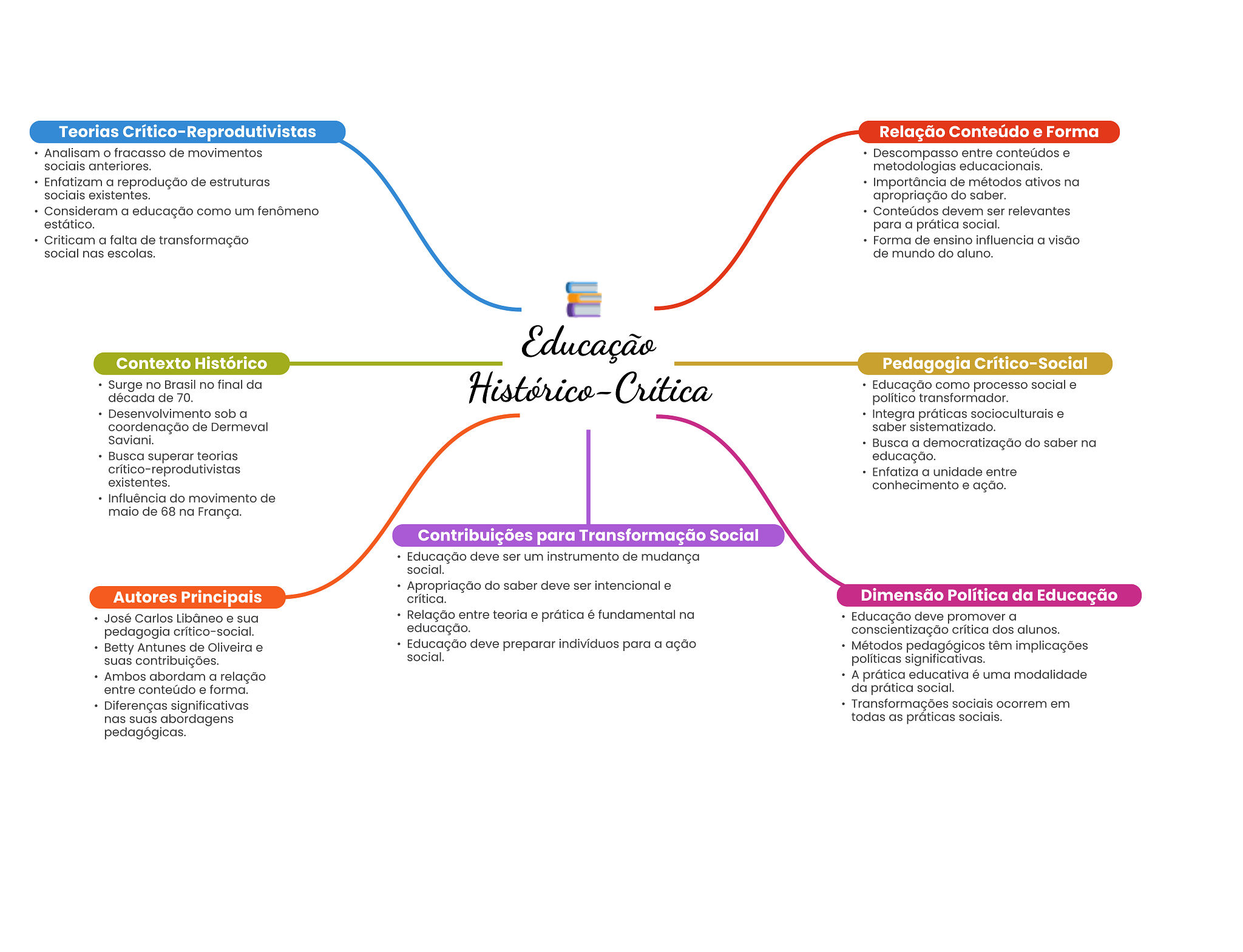 Teorias Crítico-Reprodutivistas Relação Conteúdo e Forma Analisam fracasso de movimentos Descompasso entre conteúdos e sociais anteriores. metodologias educacionais. Enfatizam a reprodução de estruturas Importância de métodos ativos na sociais existentes. apropriação do saber. Consideram a educação como um fenômeno Conteúdos devem ser relevantes estático. para a prática social. Criticam a falta de transformação Forma de ensino influencia a visão social nas escolas. de mundo do aluno. Educação Contexto Histórico Pedagogia Crítico-Social Surge no Brasil no final da década de 70. Educação como processo social e político transformador. Desenvolvimento sob a Integra práticas socioculturais e coordenação de Dermeval saber sistematizado. Saviani. Busca a democratização do saber na Busca superar teorias educação. crítico-reprodutivistas Enfatiza a unidade entre existentes. conhecimento e ação. Influência do movimento de maio de 68 na França. Contribuições para Transformação Social Educação deve ser um instrumento de mudança social. Apropriação do saber deve ser intencional e Autores Principais crítica. Dimensão Política da Educação José Carlos Libâneo e sua Relação entre teoria e prática é fundamental na Educação deve promover a pedagogia crítico-social. educação. conscientização crítica dos alunos. Betty Antunes de Oliveira e Educação deve preparar indivíduos para a ação Métodos pedagógicos têm implicações suas contribuições. social. políticas significativas. Ambos abordam a relação A prática educativa é uma modalidade entre conteúdo e forma. da prática social. Diferenças significativas Transformações sociais ocorrem em nas suas abordagens todas as práticas sociais. pedagógicas.