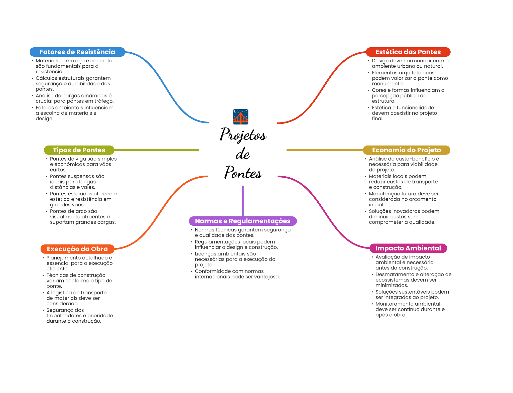 Fatores de Resistência Estética das Pontes Materiais como aço e concreto Design deve harmonizar com são fundamentais para a ambiente urbano ou natural. resistência. Elementos arquitetônicos Cálculos estruturais garantem podem valorizar a ponte como segurança e durabilidade das monumento. pontes. Cores e formas influenciam a Análise de cargas dinâmicas é percepção pública da crucial para pontes em tráfego. estrutura. Fatores ambientais influenciam Estética e funcionalidade a escolha de materiais e devem coexistir no projeto design. final. Projetos Tipos de Pontes de Economia do Projeto Pontes de viga são simples Análise de custo-benefício é e econômicas para vãos necessária para viabilidade curtos. Pontes do projeto. Pontes suspensas são Materiais locais podem ideais para longas reduzir custos de transporte distâncias e vales. e construção. Pontes estaiadas oferecem Manutenção futura deve ser estética e resistência em considerada no orçamento grandes vãos. inicial. Pontes de arco são Soluções inovadoras podem visualmente atraentes e diminuir custos sem suportam grandes cargas. Normas e Regulamentações comprometer a qualidade. Normas técnicas garantem segurança e qualidade das pontes. Regulamentações locais podem Execução da Obra influenciar design e construção. Impacto Ambiental Licenças ambientais são Planejamento detalhado é necessárias para a execução do Avaliação de impacto essencial para a execução ambiental é necessária projeto. eficiente. antes da construção. Conformidade com normas Técnicas de construção internacionais pode ser vantajosa. Desmatamento e alteração de variam conforme tipo de ecossistemas devem ser ponte. minimizados. A logística de transporte Soluções sustentáveis podem de materiais deve ser ser integradas ao projeto. considerada. Monitoramento ambiental Segurança dos deve ser contínuo durante e trabalhadores é prioridade após a obra. durante a construção.
