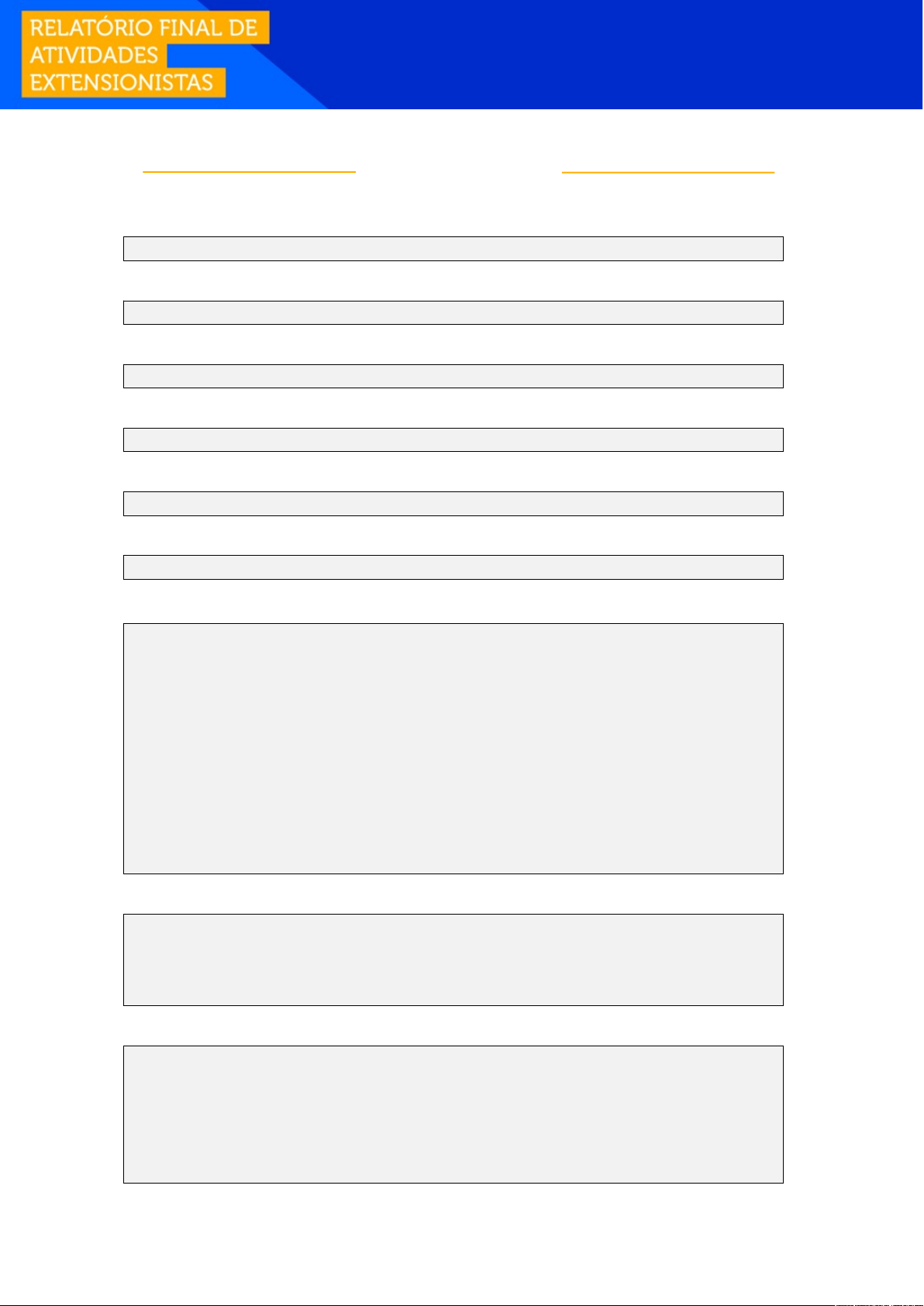 DADOS DO ALUNO: Aluno: [Nome completo] RA: [Número do RA do aluno] POLO / UNIDADE: CURSO: ENGENHARIA MECÂNICA - BACHARELADO COMPONENTE CURRICULAR: PROJETO DE EXTENSÃO IV - ENGENHARIA MECÂNICA PROGRAMA DE EXTENSÃO: PROGRAMA DE INOVAÇÃO E EMPREENDEDORISMO. FINALIDADE E MOTIVAÇÃO: A finalidade da extensão no Programa de Inovação e Empreendedorismo está na articulação de múltiplas competências desenvolvidas durante o curso, criando soluções de produtos e serviços em que que atenda as necessidades do outro, de forma empática, eficaz e sustentável, trazendo a tecnologia e o conhecimento da engenharia mecânica para a sociedade, beneficiando a comunidade local com o conhecimento adquirido, por meio da capacitação em temas específicos e transferência do conhecimento. Os locais que poderão contemplar esse projeto extensionista podem ser: parcerias com a prefeitura; associações de bairros, parcerias com empresas públicas e privadas, com foco em áreas de competência do engenheiro mecânico, como por exemplo gestão de projetos, gestão da produção, economia e gestão da manutenção COMPETÊNCIAS: I - Avaliar a viabilidade econômica de projetos; II - Gerenciar projetos de produtos, processos e serviços; III - Supervisionar, operar e promover a manutenção de sistemas; IV - Gerenciar e atuar em equipes multidisciplinares. PERFIL DO EGRESSO: O perfil do egresso idealizado pela IES para o curso de Engenharia Mecânica possibilita a formação do engenheiro mecânico crítico, reflexivo, criativo, visão holística, humanista e ético, capaz de aplicar tecnologias inerentes à sua área de atuação, sendo que pelas atividades extensionistas vinculadas ao Programa de Inovação e Empreendedorismo, esse egresso poderá desenvolver habilidades e capacidade para atuar de modo responsável e comprometido, interagindo com as novas situações e demandas da sociedade, com isenção e responsabilidade social, comprometido com legislação e atos normativos do exercício do profissional, primando pela busca do conhecimento e da aprendizagem autônoma, investigativa, empreendedora e cooperativa com o emprego de perspectivas multidisciplinares. Ainda, desenvolver a capacidade de planejamento e condução de experimentos; exercer atividades de concepção, supervisão, coordenação; analisar, interpretar e agir em situações pertinentes à engenharia mecânica, a partir de atitudes críticas, reflexivas e éticas, pois adquiriram habilidades suficientes para, eticamente, atuar em gestão de projetos, gestão da manutenção, gestão de processos e economia SOFT SKILLS (COMPETÊNCIAS SOCIOEMOCIONAIS): Tomada de Decisão Análise e resolução de problemas Aprendizado Ativo OBJETIVOS DE APRENDIZAGEM: Os objetivos da extensão no curso de Engenharia Mecânica vinculados ao Programa de Inovação e Empreendedorismo estão relacionados com a disseminação do saber técnico das áreas da engenharia mecânica para a comunidade local, prestando serviços que possam solucionar problemáticas identificadas na comunidade, trazendo conhecimento e eficiência, atendendo a sociedade nas necessidades e transferindo conhecimento acadêmico para a comunidade, preparando o egresso para uma atuação global, focado no mercado de trabalho, consciência social, ética e desenvolvimento de competências de aplicação de projetos e soluções técnicas na sua área de formação. O aluno terá oportunidade de prestar apoio para sociedade em temas como economia, gestão da produção, gestão de projetos e gestão da manutenção. CONTEÚDOS: I - Economia; II - Gestão de produção e de projetos; III - Manutenção. INDICAÇÕES BIBLIOGRÁFICAS: MAXIMINIANO, Antônio Cesar Amaru. Administração de projetos: como transformar ideias em resultados. 5.ed. São Paulo: Atlas, 2014. Blank, Leland;TARQUIN, Anthony. Engenharia econômica. 6. ed. Porto Alegre : AMGH, 2011. SOEIRO, Marcus Vinícius de Abreu; OLIVIO, Amauri; LUCATO, André Vicente Ricco. Gestão da manutenção. Londrina: Editora e Distribuidora Educacional S.A., 2017. RELATÓRIO FINAL: Aluno e Aluna, após realizar suas atividades de extensão, é necessário que você o formalize, enviando esse Relatório Final para ser avaliado junto ao seu Ambiente Virtual (AVA) e também para você poder comprovar sua atuação. Para o preenchimento, busque as anotações junto ao TEMPLATE PCDA para auxiliar na apresentação das atividades desenvolvidas. Todos os campos são de preenchimento obrigatório! DESCRIÇÃO DA AÇÃO COM RESULTADOS ALCANÇADOS Metas dos Objetivos de Desenvolvimento Sustentável (ODS) aderentes a este projeto: CAMPO OBRIGATÓRIO – busque no seu Template PDCA quais Metas você selecionou como aderentes ao seu projeto, conforme cada Objetivo de Desenvolvimento Sustentável (ODS) da Organização das Nações Unidas (ONU) que você explorou no seu planejamento. Liste as Metas selecionadas (pelo menos uma opção): Local de realização da atividade extensionista: Durante a ação: Caso necessário, houve mudança de estratégia para alcançar o resultado: Resultado da ação: Conclusão: Depoimentos (se houver): RELATE SUA PERCEPÇÃO DAS AÇÕES EXTENSIONISTAS REALIZADAS NO PROGRAMA DESENVOLVIDO: CAMPO OBRIGATÓRIO – relate em no mínimo 15 (quinze) linhas sua experiência com as ações extensionistas. O texto deve ser de sua autoria e inédito, evite plágio. Questões norteadoras: (1) Você notou que suas habilidades profissionais foram aprimoradas, com a atuação nas ações extensionistas? (2) Você identificou melhoria/resolução do problema identificado? (3) Você conseguiu articular os conhecimentos adquiridos no curso com as ações extensionistas? Ao escrever seu texto evite deixá-lo em forma de respostas as questões norteadoras, relate sua experiência em forma de texto dissertativo com justificativas. DEPOIMENTO DA INSTITUIÇÃO PARTICIPANTE CAMPO OBRIGATÓRIO - insira depoimento(s) do(s) gestor(es) da inst