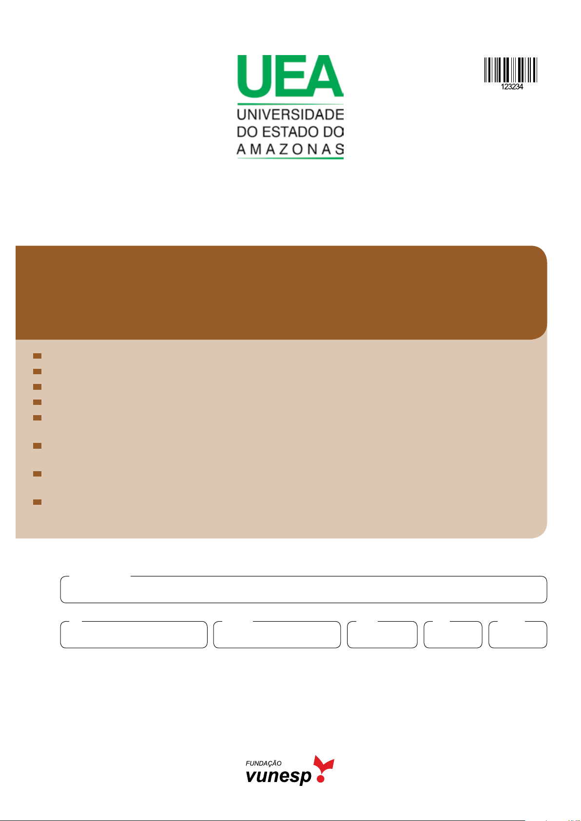 Confidencial até o momento da aplicação. Vestibular 2025 acesso 2026 004. Prova de ConheCimentos esPeCífiCos e redação Cursos: licenciatura em ciência da computação, licenciatura em Matemática, licenciatura em Física, licenciatura em computação, engenharia civil, engenharia da computação, engenharia de controle e automação, engenharia Florestal, engenharia da Produção, engenharia elétrica, engenharia Mecânica, engenharia Química, engenharia de Materiais, engenharia eletrônica, engenharia Naval, Meteorologia, sistemas de informação, ciências contábeis, ciências econômicas, tecnologia em agrimensura e inteligência artificial (ia). Verifique se sua folha de respostas pertence ao mesmo grupo de cursos que este caderno. confira seus dados impressos neste caderno. assine com caneta de tinta preta a Folha de respostas apenas no local indicado. esta prova contém 36 questões objetivas e uma proposta de redação. Quando for permitido abrir o caderno, verifique se está completo ou se apresenta imperfeições. caso haja algum problema, informe ao fiscal da sala para a devida substituição. Para cada questão, o candidato deverá assinalar apenas uma alternativa na Folha de respostas, utilizando caneta de tinta preta. esta prova terá duração total de 4h e o candidato somente poderá sair do prédio depois de transcorridas 3h, contadas a partir do início da prova. ao final da prova, antes de sair da sala, entregue ao fiscal a Folha de respostas, a Folha de redação e o caderno de Questões. Nome do candidato Prédio Sala CarteiraInscriçãoRG 2UEAM2501 | 004-CE-t3 Confidencial até o momento da aplicação. 3 UEAM2501 | 004-CE-t3Confidencial até o momento da aplicação. Questão 01 Uma jarra contém 1 750 mL de água, o que corresponde a de sua capacidade total. Se essa jarra estiver com a sua capacidade total preenchida com água, o número máximo de copos que podem ser enchidos com 350 mL de água em cada um é (A) 7. (B) 6. (C) 8. (D) 5. (E) 9. Questão 02 Uma livraria colocou 200 livros em promoção, durante 3 dias, e vendeu determinado número deles no primeiro dia. No segundo dia, vendeu 60% dos livros que restaram e, no terceiro dia, vendeu os últimos 56 livros. Em relação aos 200 livros colocados em promoção, o número de livros vendidos no primeiro dia correspondeu a (A) 40%. (B) 45%. (C) 25%. (D) 30%. (E) 35%. Questão 03 Estavam presentes em uma festa adultos e crianças, de modo que o número de adultos era 8 a mais do que o número de crianças. Após a saída de 29 adultos, e de nenhuma criança, e sabendo que ninguém mais chegou para a festa, o número de adultos passou a ser a metade do número de crianças. O número total de pessoas, adultos mais crianças, que estavam nessa festa, antes da saída dos 29 adultos, era (A) 100. (B) 92. (C) 108. (D) 104. (E) 96. Questão 04 Considere o triângulo retângulo ABC, reto em C, com BC = 9 cm e o ângulo CÂB = α . Considere também o triângulo retângulo DAE, reto em E, com os pontos D e E, respectivamente, sobre os lados AC e AB, com CD = 7 cm e BE = 11 cm, conforme mostra a figura. A E D C B9 cm fora de escala � 7 cm 11 cm Sabendo que sen α = , a área do polígono BCDE, destacado na figura, é (A) 49 cm2. (B) 48 cm2. (C) 50 cm2. (D) 46 cm2. (E) 45 cm2. Questão 05 Considere o quadrado ABCD e o triângulo EFG, de modo que os pontos F, A, G e B estejam alinhados, o ponto E sobre o lado AD e todos os lados do quadrado divididos em 3 seg- mentos congruentes, conforme mostra a figura. fora de escala AF E D C BG Sabendo que a área do triângulo EFG é 16 cm2 e que a me- dida do segmento AF é igual à medida do lado do quadrado, o perímetro do quadrado é (A) 34 cm. (B) 36 cm. (C) 30 cm. (D) 24 cm. (E) 28 cm. 4UEAM2501 | 004-CE-t3 Confidencial até o momento da aplicação. Questão 09 Uma pessoa comprou canetas, lápis e marca textos. A tabela mostra o número de unidades compradas de canetas e de marca textos e o valor unitário dos itens comprados. Item No de unidades compradas Valor unitário do item Caneta 5 R$ 4,60 Lápis ? R$ 2,00 Marca textos 2 R$ 2,50 Considerando-se o número total de itens comprados, na média, o valor de cada item saiu por R$ 3,00. O número de lápis comprados foi (A) 6. (B) 7. (C) 5. (D) 4. (E) 3. Questão 10 Considere a função . O valor de é igual a (A) –1. (B) 0. (C) 2. (D) 3. (E) 1. Questão 11 Considere a seguinte matriz quadrada de ordem 3, em que x é um número real. Sabendo que o determinante dessa matriz é igual a 1, o valor de x é (A) 1. (B) 4. (C) 5. (D) 3. (E) 2. Questão 06 Em um plano cartesiano, os pontos P(1, 0) e Q(0, 3) perten- cem ao gráfico descrito pela função f(x) = x2 + bx + c, em que b e c são números reais. As coordenadas do ponto de mínimo dessa função são (A) (2, 3). (B) (– 3, – 1). (C) (2, – 1). (D) (4, 3). (E) (– 2, 2). Questão 07 Um estudante resolveu exercícios de Química, Física e Matemática, totalizando 36 exercícios. Sabendo que o nú- mero de exercícios resolvidos de cada matéria, na ordem citada, formava uma progressão aritmética (PA) de razão 3, o número de exercícios resolvidos de Matemática foi (A) 15. (B) 10. (C) 12. (D) 16. (E) 9. Questão 08 Em uma empresa há 18 técnicos. Desse total, fala espa- nhol e, entre os que falam espanhol, também fala alemão. Entre os técnicos que não falam espanhol, fala alemão. Sorteando-se um desses 18 técnicos, a probabilidade de que ele fale alemão é (A) (B) (C) (D) (E) 5 UEAM2501 | 004-CE-t3Confidencial até o momento da aplicação. Questão 13 Na disputa final da corrida de revezamento 4 x 400 m misto nos Jogos Olímpicos de Paris, a corredora holandesa Femke Bol realizou um feito impressionante. Em dado instan- te, quando estava a 200 m da linha de chegada e ocupava a quarta posição, 20 m atrás da primeira colocada, a america- na Kaylym Brown, Femke empreendeu uma arrancada que a levou a cruzar a linha de chegada em primeiro lugar. 