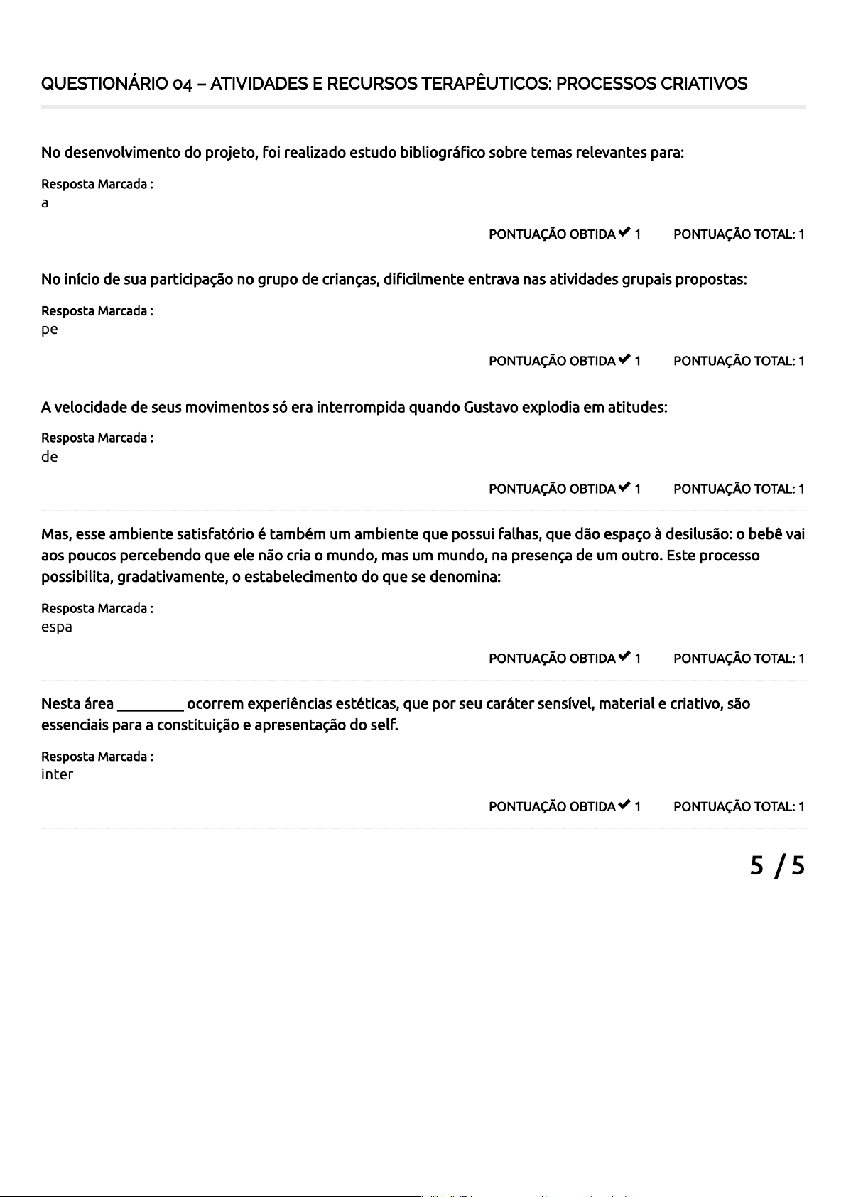 18/08/2024 22:36 Course Status – AVA Saúde Unifaveni https://ava.saude.unifaveni.com.br/course-status/ 1/1 5 / 5 QUESTIONÁRIO 04 – ATIVIDADES E RECURSOS TERAPÊUTICOS: PROCESSOS CRIATIVOS PONTUAÇÃO TOTAL: 1PONTUAÇÃO OBTIDA 1 No desenvolvimento do projeto, foi realizado estudo bibliográ�co sobre temas relevantes para: Resposta Marcada : a pesquisa. PONTUAÇÃO TOTAL: 1PONTUAÇÃO OBTIDA 1 No início de sua participação no grupo de crianças, di�cilmente entrava nas atividades grupais propostas: Resposta Marcada : pela equipe. PONTUAÇÃO TOTAL: 1PONTUAÇÃO OBTIDA 1 A velocidade de seus movimentos só era interrompida quando Gustavo explodia em atitudes: Resposta Marcada : de intenso desespero, raiva e agressividade. PONTUAÇÃO TOTAL: 1PONTUAÇÃO OBTIDA 1 Mas, esse ambiente satisfatório é também um ambiente que possui falhas, que dão espaço à desilusão: o bebê vai aos poucos percebendo que ele não cria o mundo, mas um mundo, na presença de um outro. Este processo possibilita, gradativamente, o estabelecimento do que se denomina: Resposta Marcada : espaço potencial. PONTUAÇÃO TOTAL: 1PONTUAÇÃO OBTIDA 1 Nesta área _________ ocorrem experiências estéticas, que por seu caráter sensível, material e criativo, são essenciais para a constituição e apresentação do self. Resposta Marcada : intermediária. Total de Pontos