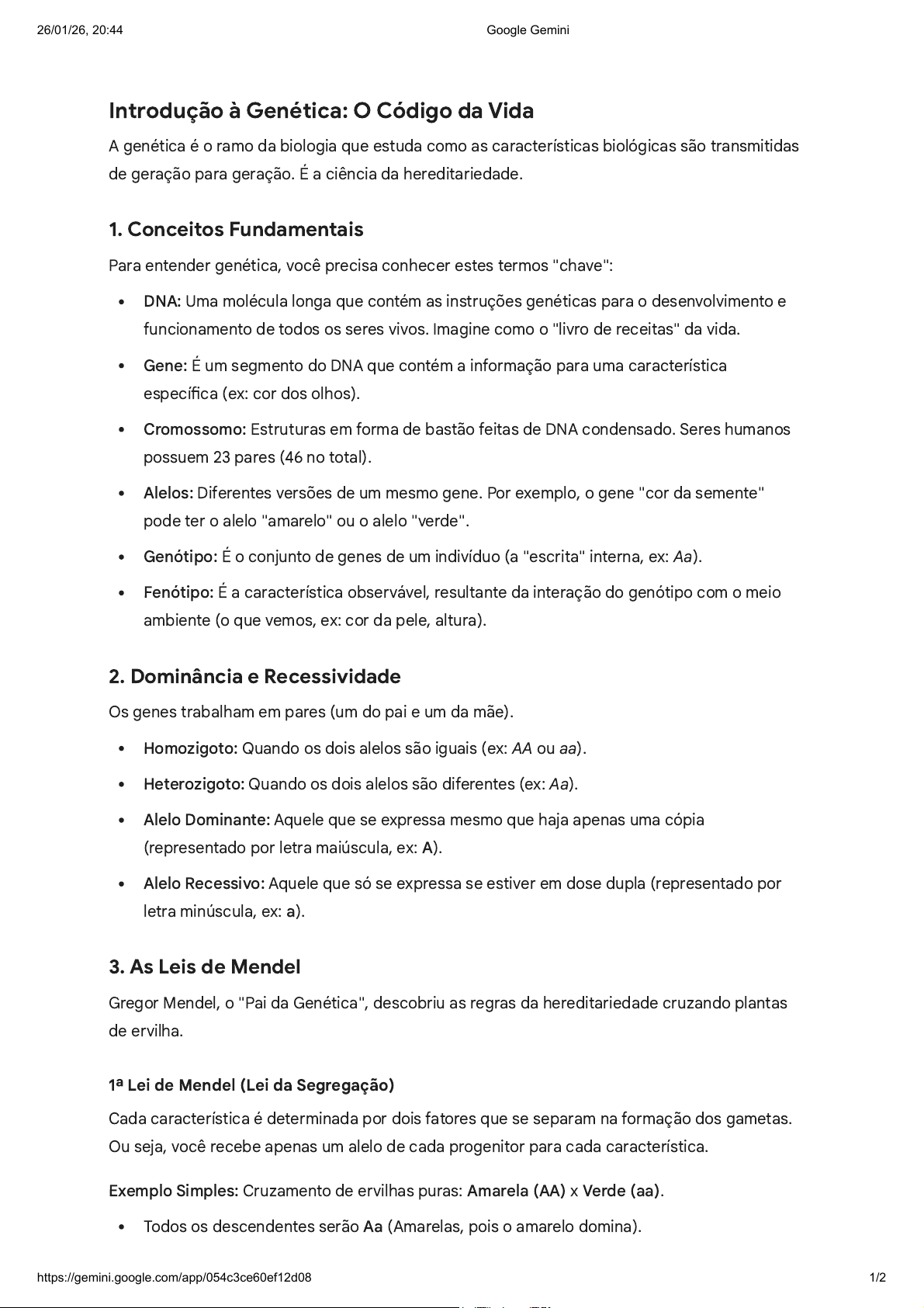 Introdução à Genética: O Código da Vida A genética é o ramo da biologia que estuda como as características biológicas são transmitidas de geração para geração. É a ciência da hereditariedade. 1. Conceitos Fundamentais Para entender genética, você precisa conhecer estes termos "chave": DNA: Uma molécula longa que contém as instruções genéticas para o desenvolvimento e funcionamento de todos os seres vivos. Imagine como o "livro de receitas" da vida. Gene: É um segmento do DNA que contém a informação para uma característica específica (ex: cor dos olhos). Cromossomo: Estruturas em forma de bastão feitas de DNA condensado. Seres humanos possuem 23 pares (46 no total). Alelos: Diferentes versões de um mesmo gene. Por exemplo, o gene "cor da semente" pode ter o alelo "amarelo" ou o alelo "verde". Genótipo: É o conjunto de genes de um indivíduo (a "escrita" interna, ex: Aa). Fenótipo: É a característica observável, resultante da interação do genótipo com o meio ambiente (o que vemos, ex: cor da pele, altura). 2. Dominância e Recessividade Os genes trabalham em pares (um do pai e um da mãe). Homozigoto: Quando os dois alelos são iguais (ex: AA ou aa). Heterozigoto: Quando os dois alelos são diferentes (ex: Aa). Alelo Dominante: Aquele que se expressa mesmo que haja apenas uma cópia (representado por letra maiúscula, ex: A). Alelo Recessivo: Aquele que só se expressa se estiver em dose dupla (representado por letra minúscula, ex: a). 3. As Leis de Mendel Gregor Mendel, o "Pai da Genética", descobriu as regras da hereditariedade cruzando plantas de ervilha. 1ª Lei de Mendel (Lei da Segregação) Cada característica é determinada por dois fatores que se separam na formação dos gametas. Ou seja, você recebe apenas um alelo de cada progenitor para cada característica. Exemplo Simples: Cruzamento de ervilhas puras: Amarela (AA) x Verde (aa). Todos os descendentes serão Aa (Amarelas, pois o amarelo domina). 26/01/26, 20:44 Google Gemini https://gemini.google.com/app/054c3ce60ef12d08 1/2 Se cruzarmos Aa com Aa, teremos 75% de chances de amarelas e 25% de chances de verdes. 2ª Lei de Mendel (Lei da Segregação Independente) Os genes para diferentes características (como cor da semente e forma da semente) são transmitidos aos gametas de forma independente uns dos outros. 4. Exemplo Prático: Cor dos Olhos (Simplificado) Embora a cor dos olhos envolva vários genes, vamos usar o modelo clássico didático: B (Castanho): Dominante b (Azul): Recessivo Cruzamento Genótipo dos Filhos Fenótipo dos Filhos Pai (BB) x Mãe (bb) 100% Bb 100% Olhos Castanhos Pai (Bb) x Mãe (Bb) 25% BB, 50% Bb, 25% bb 75% Castanhos, 25% Azuis 5. Resumo Final 1. O DNA é o manual, os genes são as páginas. 2. Alelos são as variações dessas páginas. 3. Você é Dominante se tiver pelo menos uma letra maiúscula no seu código para aquela característica. 4. Você é Recessivo apenas se tiver as duas letras minúsculas. 5. Mendel provou que a herança não é uma "mistura" (como tinta), mas sim a combinação de unidades discretas que se separam e se combinam matematicamente. 26/01/26, 20:44 Google Gemini https://gemini.google.com/app/054c3ce60ef12d08 2/2