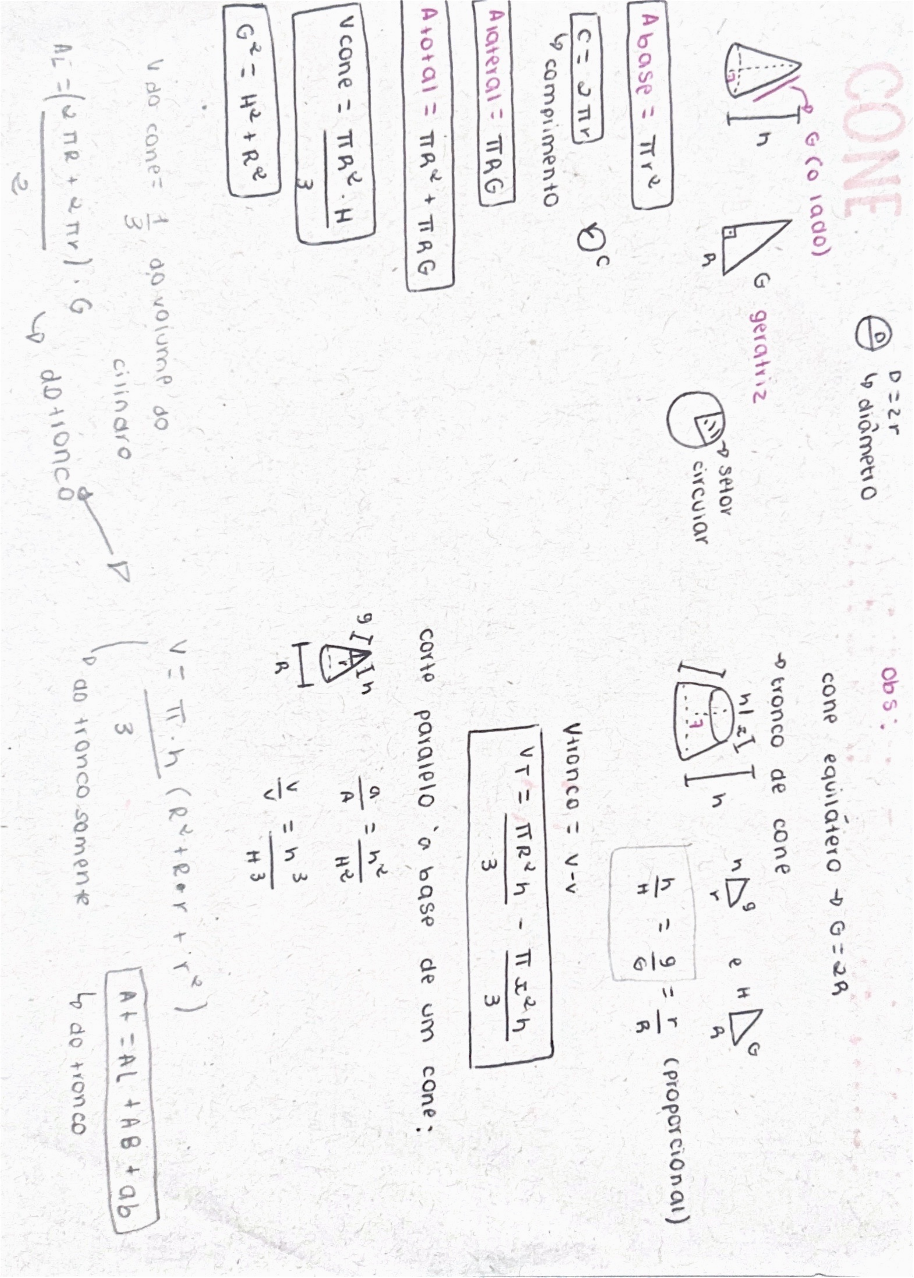 CONE D=2r D obs diametro G lado) cone equilatero G=2R = b tronco de cone n G geratriz 9 0 R I n setor e H h r circular 7 h = 9 = r (proporcional) Abase = 2 H R C Vtronco = comprimento VT = - TTRG 3 3 Atotal = + corte paralelo a base de um cone: 9 a = = H A 3 I R = h 3 = + H3 h ( 2 + r ) cone= 1 do volume do 3 cilindro 3 A+=AL +AB + ab AL - = + G D tronco somente do tronco 2