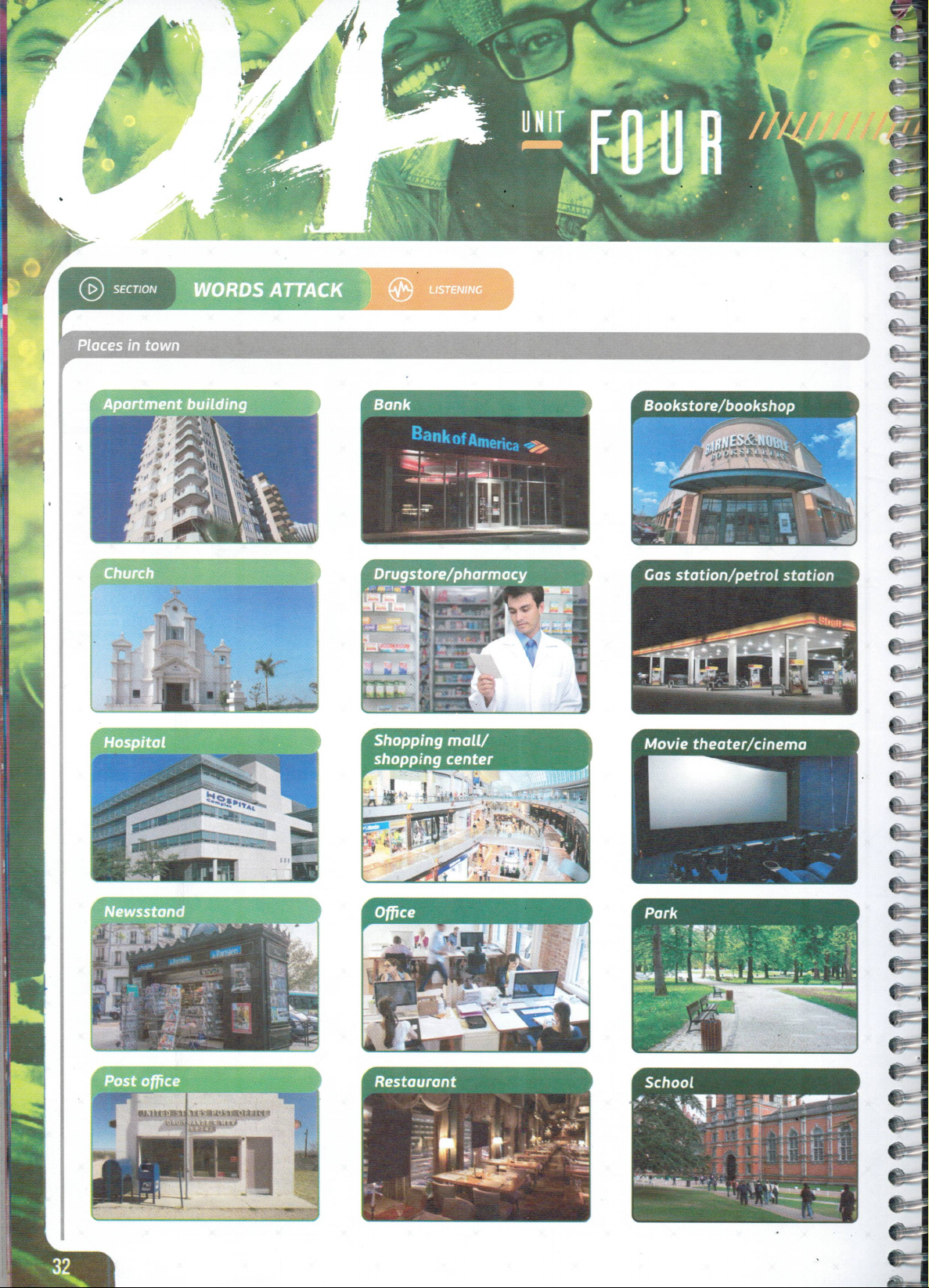 FOUR D SECTION WORDS ATTACK LISTENING Places in town Apartment building Bank Bookstore/bookshop Bank of America Church Drugstore/pharmacy Gas station/petrol station Hospital Shopping mall/ Movie theater/cinema shopping center HOSPITAL Newsstand Office Park Post office Restaurant SchoolSquare Store/shop Supermarket D SECTION ALL EARS LISTENING MY CITY/NEIGHBORHOOD Walker Park N.Y.C Fire Museum N. Houston St Little Italy Chinatown SOHO Canal St Foley TRIBECA Square City Hall North Park Church Broadway I LIVE IN TRIBECA. IT IS VERY CLOSE TO SOHO. WHERE DO YOU LIVE? NICKY, WHERE DO YOU LIVE? I LIVE IN SOHO. AND YOU? I LIVE ON SPRING STREET. AND YOU, WHAT STREET DO YOU LIVE ON? I LIVE ON GREENWICH STREET. IT IS ON THE CORNER IS IT CLOSE TO SAINT JOHN'S PARK? OF GREENWICH STREET AND BEACH STREET. YES, IT IS. AND TRIBECA PARK IS NOT FAR.Nicole's Building fuel Spring Street POST OFFICE WHERE IS THIS RESTAURANT IN RELATION TO YOUR APARTMENT BUILDING? WHAT IS THERE IN YOUR NEIGHBORHOOD? IT IS BESIDE MY BUILDING. SOHO IS A GREAT THERE IS AN EXCELLENT RESTAURANT THERE. ARE THERE STORES IN SOHO? TRIBECA IS VERY GOOD TOO. THERE IS A LIBRARY AND A BOOKSTORE NEAR MY BUILDING. THERE IS A NEWSSTAND YES, THERE ARE MANY STORES IN FRONT OF IT AND A HOSPITAL ON MY STREET. THERE IS A BANK, A POST ON THE STREET BEHIND. OFFICE AND A SCHOOL NEAR THERE. IS THERE A SHOPPING MALL? NO, THERE ISN'T. WHAT IS THERE NEXT TO YOUR BUILDING? YES, IT IS. LET'S GO. I WILL WALK YOU HOME. THERE IS A DRUGSTORE. THANKS. HEY, IT'S TIME TO GO.D SECTION TELL ME ABOUT IT Talk to Jason about your neighborhood. (Personal information) Jason: I live in Tribeca. Where do you live? Jason: Is there a school on your street? You: live in You: Jason: I live on Greenwich Street. What street do you Jason: Are there stores in your neighborhood? live on? You: You: live on Jason: Is there a hospital in your neighborhood? Jason: What is there in your neighborhood? You: You: There is... Jason: What is there next to your house/building? You: There is... . D SECTION ANOTHER BRICK IN THE WALL TOPIC THERE TO BE Read the dialogues: IS THERE A NOTEBOOK ARE THERE PENS ON THE TABLE? ON THE TABLE? NO, THERE ISN'T A NOTEBOOK ON NO, THERE AREN'T THE TABLE. THERE IS A BOOK ON PENS ON THE TABLE. THE TABLE. THERE ARE PENCILS ON THE TABLE. There is and There are are used to indicate existence. Pay attention to the difference: There is a book on the table. singular: only one book. There are pencils on the table. plural: more than one pencil.Let's learn how to use it: Singular form AFFIRMATIVE 3 There is a clock on the wall. Contracted form: There's a clock on the wall. Singular form NEGATIVE There is not a tree next to the house. Contracted form: There isn't a tree next to the house. Singular form INTERROGATIVE Is there a car in front of the house? Yes, there is a car in front of the house. It is possible to use a Wh- word: What is there in front of the house? There is a car in front of the house. Plural form AFFIRMATIVE There are books on the table. Plural form NEGATIVE There are not students in the classroom. Contracted: There aren't students in the classroom. Plural form INTERROGATIVE Are there cars on the street? Yes, there are cars on the street. It is possible to use a Wh- word: Where are there cars? There are cars on the street. 36IMPORTANT: ! I have a car. This is my car. There is a car on the road. I have a = possession There is a car on the road. = existence It is not correct to use have to indicate existence, it expresses possession. Pay attention to the difference: Correct There is a car on the road. Incorrect Have a car on the road. ... TOPIC PREPOSITIONS I In E.g.: The flowers are in the vase. ALES E.g.: London is in England. b . names of states. In is used for: E.g.: Richmond is in Virginia. a names of cities. c . names of countries. Channel E.g.: I live in London. E.g.: New York is in the USA. Out Shop SALE SALE E.g.: Antony is not in the shop. He is out of the shop. 37E.g.: The book is on the table. On indicates physical contact. E.g.: The board is on the wall. On indicates physical contact. E.g.: I live on Spring Street. SPRING STREET On is used with names of streets, avenues, etc. E.g.: The school is on Oxford Avenue. E.g.: The dog is beside the cat. Beside is used to indicate that the objects, people are in the same line, side by side. E.g.: The dog is behind the tree. E.g.: The dog is in front of the tree. E.g.: The dog is next to the tree.Near/close to E.g.: The dog is near/close to the tree. E.g.: The dog is far from the tree. Far (from) is used to indicate that one place, person, object is distant. D SECTION SAY IT RIGHT LISTENING The sounds of final /m/ and /n/. /m/ /n/ In context: Pam is in front of In context: The book is on the bank now. the table. D SECTION IT'S TIME! 1. Complete the sentences below using THERE IS, THERE ISN'T, THERE ARE or THERE AREN'T according to the map. Oxford Street Charnwood Avenuea . a hotel on Oxford Street. b . a hotel on Charnwood Avenue. apartment buildings close to the hospital. d . cars on Oxford Street. e . a car in front of the hotel. 2 . Make questions for the answers. E.g.: Jason: Is there a post office in your neighborhood? Nicole: Yes, there is a post office in my neighborhood. a Jason: ? Nicole: Yes, there are schools close to my house. b Jason: ? Nicole: Yes, there is a shopping mall near my house. c Jason: ? Nicole: Yes, there are newsstands in my neighborhood. 3 Use the prepositions in, out, on, in front of, behind, near, beside, close to, next to, to complete the sentences according to the pictures. a E.g.: The cat is in the box. The pictures are b The girl is the wall. the door. continuation 40AVE TRANS The bus is d The boy is e The chair is the school. the girl. the table. g The vase is the h f The woman is The dog is the car. table. the trees. i The apple is j . Australia is k He is the orange. from the USA. of the car. YORK ADELPHIA Baltimore Dover Washington D.C. Richmond New York is m There