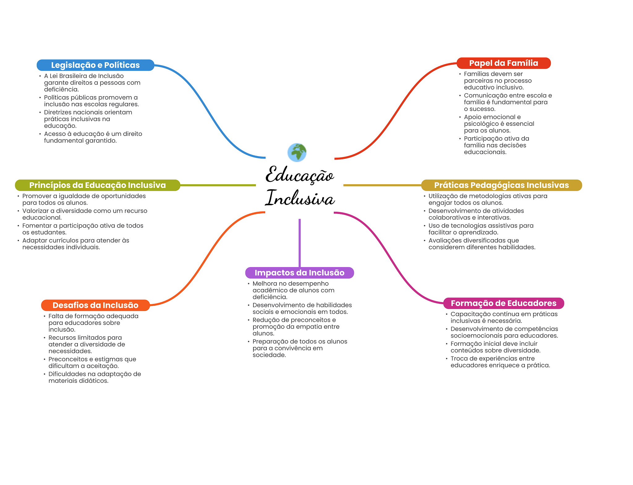 Legislação e Políticas Papel da Família A Lei Brasileira de Inclusão Famílias devem ser garante direitos a pessoas com parceiras no processo deficiência. educativo inclusivo. Políticas públicas promovem a Comunicação entre escola e inclusão nas escolas regulares. família é fundamental para sucesso. Diretrizes nacionais orientam práticas inclusivas na Apoio emocional e educação. psicológico é essencial Acesso à educação é um direito para OS alunos. fundamental garantido. Participação ativa da família nas decisões educacionais. Educação Princípios da Educação Inclusiva Práticas Pedagógicas Inclusivas Promover a igualdade de oportunidades Inclusiva Utilização de metodologias ativas para para todos alunos. engajar todos alunos. Valorizar a diversidade como um recurso Desenvolvimento de atividades educacional. colaborativas e interativas. Fomentar a participação ativa de todos Uso de tecnologias assistivas para estudantes. facilitar aprendizado. Adaptar currículos para atender às Avaliações diversificadas que necessidades individuais. considerem diferentes habilidades. Impactos da Inclusão Melhora no desempenho acadêmico de alunos com deficiência. Desafios da Inclusão Desenvolvimento de habilidades Formação de Educadores sociais e emocionais em todos. Falta de formação adequada Capacitação contínua em práticas para educadores sobre Redução de preconceitos e inclusivas é necessária. inclusão. promoção da empatia entre Desenvolvimento de competências alunos. Recursos limitados para socioemocionais para educadores. atender a diversidade de Preparação de todos alunos Formação inicial deve incluir necessidades. para a convivência em conteúdos sobre diversidade. sociedade. Preconceitos e estigmas que Troca de experiências entre dificultam a aceitação. educadores enriquece a prática. Dificuldades na adaptação de materiais didáticos.