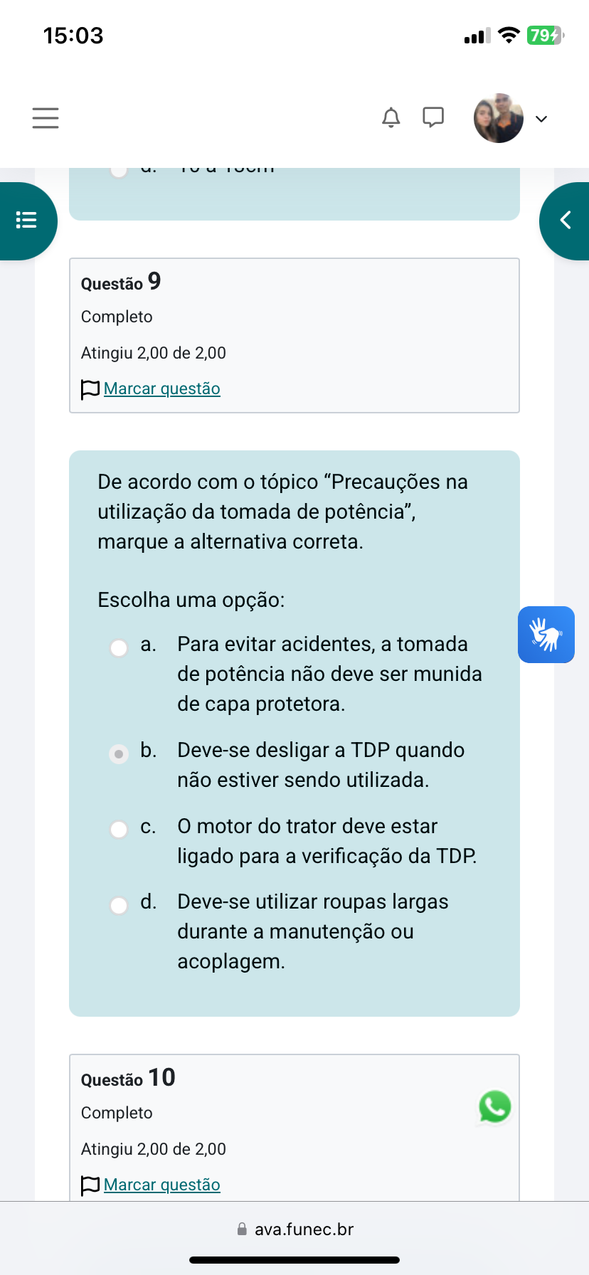 15:03 794 Questão 9 Completo Atingiu 2,00 de 2,00 Marcar questão De acordo com o tópico "Precauções na utilização da tomada de potência", marque a alternativa correta. Escolha uma opção: a. Para evitar acidentes, a tomada de potência não deve ser munida de capa protetora. b. Deve-se desligar a TDP quando não estiver sendo utilizada. motor do trator deve estar ligado para a verificação da TDP. d. Deve-se utilizar roupas largas durante a manutenção ou acoplagem. Questão 10 Completo Atingiu 2,00 de 2,00 Marcar questão ava.funec.br