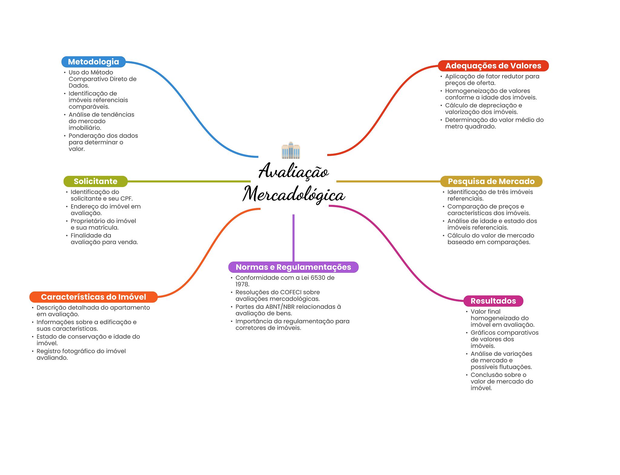 Metodologia Adequações de Valores Uso do Método Comparativo Direto de Aplicação de fator redutor para Dados. preços de oferta. Identificação de Homogeneização de valores imóveis referenciais conforme a idade dos imóveis. comparáveis. Cálculo de depreciação e Análise de tendências valorização dos imóveis. do mercado Determinação do valor médio do imobiliário. metro quadrado. Ponderação dos dados para determinar valor. Avaliação Solicitante Pesquisa de Mercado Identificação do solicitante e seu CPF. Mercadológica Identificação de três imóveis referenciais. Endereço do imóvel em Comparação de preços e avaliação. características dos imóveis. Proprietário do imóvel Análise de idade e estado dos e sua matrícula. imóveis referenciais. Finalidade da Cálculo do valor de mercado avaliação para venda. baseado em comparações. Normas e Regulamentações Conformidade com a Lei 6530 de 1978. Resoluções do COFECI sobre Características do Imóvel avaliações mercadológicas. Resultados Descrição detalhada do apartamento Partes da ABNT/NBR relacionadas à em avaliação. avaliação de bens. Valor final Informações sobre a edificação e Importância da regulamentação para homogeneizado do suas características. corretores de imóveis. imóvel em avaliação. Gráficos comparativos Estado de conservação e idade do de valores dos imóvel. imóveis. Registro fotográfico do imóvel Análise de variações avaliando. de mercado e possíveis flutuações. Conclusão sobre valor de mercado do imóvel.