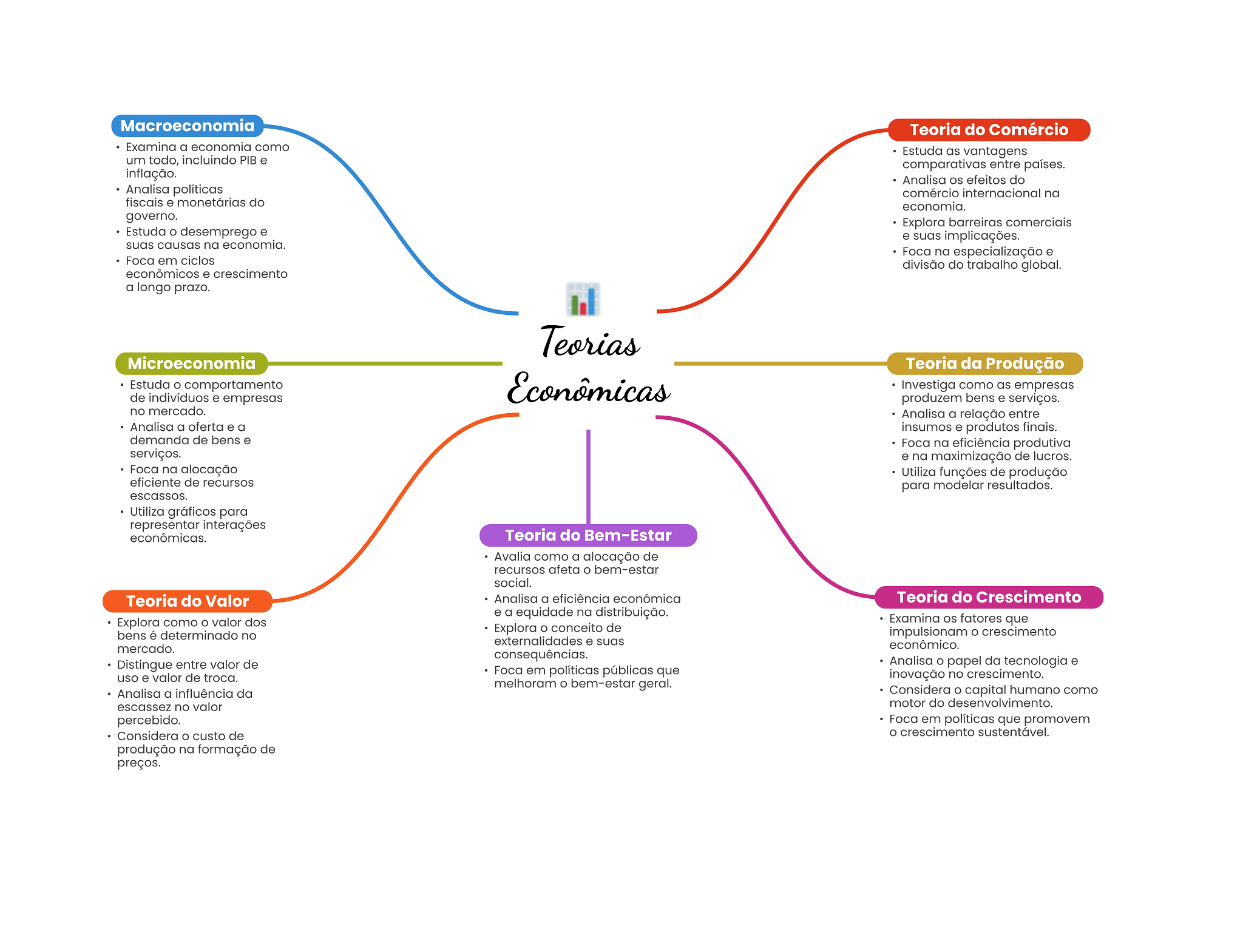 Macroeconomia Teoria do Comércio Examina a economia como Estuda as vantagens um todo, incluindo PIB e comparativas entre países. inflação. Analisa os efeitos do Analisa políticas comércio internacional na fiscais e monetárias do economia. governo. Explora barreiras comerciais Estuda desemprego e e suas implicações. suas causas na economia. Foca na especialização e Foca em ciclos divisão do trabalho global. econômicos e crescimento a longo prazo. Teorias Microeconomia Teoria da Produção Estuda comportamento Econômicas Investiga como as empresas de indivíduos e empresas produzem bens e serviços. no mercado. Analisa a relação entre Analisa a oferta e a insumos e produtos finais. demanda de bens e Foca na eficiência produtiva serviços. e na maximização de lucros. Foca na alocação Utiliza funções de produção eficiente de recursos para modelar resultados. escassos. Utiliza gráficos para representar interações econômicas. Teoria do Bem-Estar Avalia como a alocação de recursos afeta bem-estar social. Teoria do Valor Analisa a eficiência econômica Teoria do Crescimento e a equidade na distribuição. Explora como valor dos Examina fatores que Explora conceito de bens é determinado no impulsionam O crescimento externalidades e suas mercado. econômico. consequências. Distingue entre valor de Analisa papel da tecnologia e Foca em políticas públicas que uso e valor de troca. inovação no crescimento. melhoram bem-estar geral. Analisa a influência da Considera capital humano como escassez no valor motor do desenvolvimento percebido. Foca em políticas que promovem Considera custo de O crescimento sustentável. produção na formação de preços.