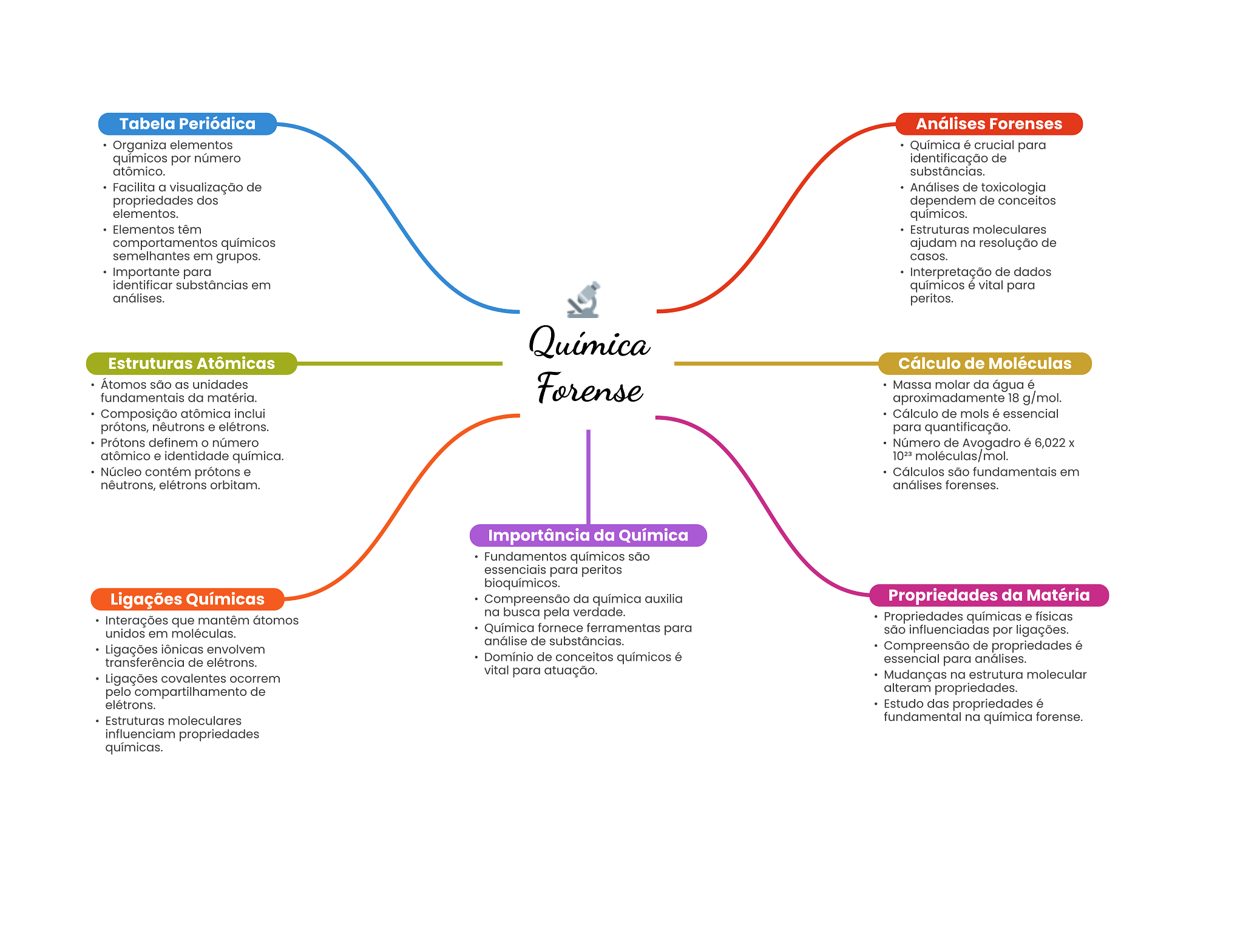 Tabela Periódica Análises Forenses Organiza elementos Química é crucial para químicos por número identificação de atômico. substâncias. Facilita a visualização de Análises de toxicologia propriedades dos dependem de conceitos elementos. químicos. Elementos têm Estruturas moleculares comportamentos químicos ajudam na resolução de semelhantes em grupos. casos. Importante para Interpretação de dados identificar substâncias em químicos é vital para análises. peritos. Química Estruturas Atômicas Cálculo de Moléculas Átomos são as unidades Forense Massa molar da água é fundamentais da matéria. aproximadamente 18 g/mol. Composição atômica inclui Cálculo de mols é essencial prótons, e elétrons. para quantificação. Prótons definem número Número de Avogadro é 6,022 atômico e identidade química. moléculas/mol. Núcleo contém prótons e Cálculos são fundamentais em nêutrons, elétrons orbitam. análises forenses. Importância da Química Fundamentos químicos são essenciais para peritos bioquímicos. Ligações Químicas Compreensão da química auxilia Propriedades da Matéria na busca pela verdade. Interações que mantêm átomos Propriedades químicas e físicas unidos em moléculas. Química fornece ferramentas para são influenciadas por ligações. análise de substâncias. Ligações iônicas envolvem Compreensão de propriedades é transferência de elétrons. Domínio de conceitos químicos é essencial para análises. vital para atuação. Ligações covalentes ocorrem Mudanças na estrutura molecular pelo compartilhamento de alteram propriedades. elétrons. Estudo das propriedades é Estruturas moleculares fundamental na química forense. influenciam propriedades químicas.