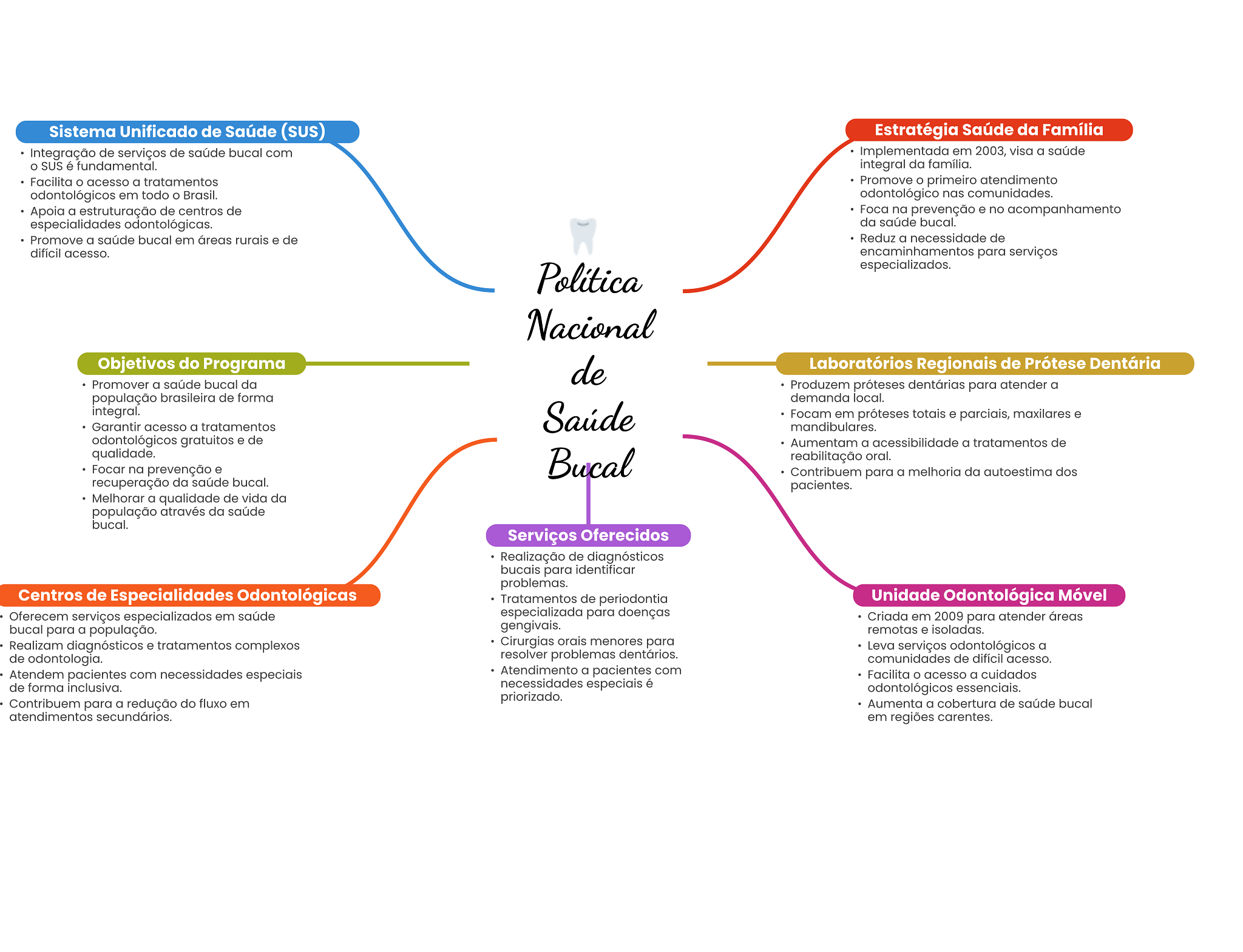 Sistema Unificado de Saúde (sus) Estratégia Saúde da Família Integração de serviços de saúde bucal com Implementada em 2003, visa a saúde SUS é fundamental. integral da família. Facilita acesso a tratamentos Promove primeiro atendimento odontológicos em todo Brasil. odontológico nas comunidades. Apoia a estruturação de centros de Foca na prevenção e no acompanhamento especialidades odontológicas. da saúde bucal. Promove a saúde bucal em áreas rurais e de Reduz a necessidade de difícil acesso. encaminhamentos para serviços Política especializados. Nacional Objetivos do Programa de Laboratórios Regionais de Prótese Dentária Promover a saúde bucal da Produzem próteses dentárias para atender a população brasileira de forma demanda local. integral. Garantir acesso a tratamentos Saúde Focam em próteses totais e parciais, maxilares e mandibulares. odontológicos gratuitos e de Aumentam a acessibilidade a tratamentos de qualidade. Bucal reabilitação oral. Focar na prevenção e Contribuem para a melhoria da autoestima dos recuperação da saúde bucal. pacientes. Melhorar a qualidade de vida da população através da saúde bucal. Serviços Oferecidos Realização de diagnósticos bucais para identificar problemas. Centros de Especialidades Odontológicas Tratamentos de periodontia Unidade Odontológica Móvel Oferecem serviços especializados em saúde especializada para doenças Criada em 2009 para atender áreas bucal para a população. gengivais. remotas e isoladas. Realizam diagnósticos e tratamentos complexos Cirurgias orais menores para Leva serviços odontológicos a de odontologia. resolver problemas dentários. comunidades de difícil acesso. Atendem pacientes com necessidades especiais Atendimento a pacientes com Facilita O acesso a cuidados de forma inclusiva. necessidades especiais é odontológicos essenciais. Contribuem para a redução do fluxo em priorizado. Aumenta a cobertura de saúde bucal atendimentos secundários. em regiões carentes.