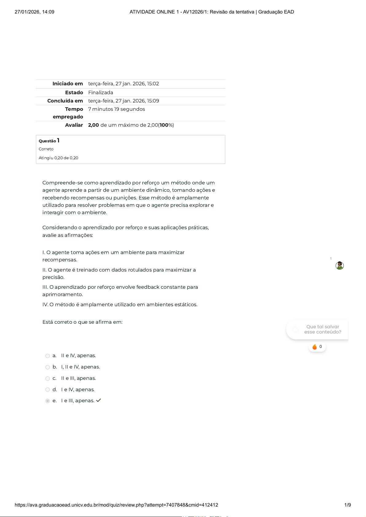 Iniciado em terça-feira, 27 jan. 2026, 15:02 Estado Finalizada Concluída em terça-feira, 27 jan. 2026, 15:09 Tempo empregado 7 minutos 19 segundos Avaliar 2,00 de um máximo de 2,00(100%) Questão 1 Correto Atingiu 0,20 de 0,20 Compreende-se como aprendizado por reforço um método onde um agente aprende a partir de um ambiente dinâmico, tomando ações e recebendo recompensas ou punições. Esse método é amplamente utilizado para resolver problemas em que o agente precisa explorar e interagir com o ambiente. Considerando o aprendizado por reforço e suas aplicações práticas, avalie as afirmações: I. O agente toma ações em um ambiente para maximizar recompensas. II. O agente é treinado com dados rotulados para maximizar a precisão. III. O aprendizado por reforço envolve feedback constante para aprimoramento. IV. O método é amplamente utilizado em ambientes estáticos. Está correto o que se afirma em: a. II e IV, apenas. b. I, II e IV, apenas. c. II e III, apenas. d. I e IV, apenas. e. I e III, apenas. ✓ 1 Que tal salvar esse conteúdo? 0 27/01/2026, 14:09 ATIVIDADE ONLINE 1 - AV12026/1: Revisão da tentativa | Graduação EAD https://ava.graduacaoead.unicv.edu.br/mod/quiz/review.php?attempt=7407848&cmid=412412 1/9 Questão 2 Correto Atingiu 0,20 de 0,20 O aprendizado de máquina, ou Machine Learning, é um componente essencial da IA que permite que as máquinas aprendam com dados e aprimorem suas respostas ao longo do tempo. Considere as afirmações a seguir sobre tipos de aprendizado de máquina: I. Aprendizado supervisionado utiliza dados rotulados para aprendizado. II. Aprendizado não supervisionado organiza os dados sem rótulos. III. Aprendizado por reforço baseia-se em recompensas e punições. IV. Redes neurais profundas só são aplicáveis no aprendizado supervisionado. Está correto o que se afirma em: a. II e III, apenas. b. I e IV, apenas. c. I e II, apenas. d. I, II e III, apenas. ✓ e. I, II, III e IV. 1 Que tal salvar esse conteúdo? 27/01/2026, 14:09 ATIVIDADE ONLINE 1 - AV12026/1: Revisão da tentativa | Graduação EAD https://ava.graduacaoead.unicv.edu.br/mod/quiz/review.php?attempt=7407848&cmid=412412 2/9 Questão 3 Correto Atingiu 0,20 de 0,20 Questão 4 Correto Atingiu 0,20 de 0,20 No aprendizado supervisionado, os modelos são treinados utilizando dados que já possuem uma resposta conhecida, permitindo que o modelo aprenda associações entre entradas e saídas. Assinale a alternativa que apresente o principal objetivo do aprendizado supervisionado. a. A organização autônoma dos dados em clusters. b. Identificar dados fora de um conjunto predeterminado. c. Usar redes neurais profundas para processar informações sem supervisão. d. Predizer ou classificar dados futuros baseando-se em exemplos rotulados. ✓ e. Reduzir o tempo de resposta de algoritmos. IA explicável é uma área de pesquisa que busca melhorar a transparência e a compreensão das decisões tomadas por modelos de IA. Esta abordagem visa tornar as operações internas dos algoritmos mais acessíveis e compreensíveis para os humanos, permitindo uma melhor interpretação dos resultados. Qual é o objetivo principal da IA explicável? a. Reduzir o tempo de processamento em grandes volumes de dados. b. Garantir que as decisões da IA sejam compreensíveis para os usuários. ✓ c. Aumentar a complexidade dos modelos de IA para melhorar a precisão. d. Tornar os modelos de IA independentes da supervisão humana. e. Focar exclusivamente em problemas de reconhecimento de imagem. 1 Que tal salvar esse conteúdo? 27/01/2026, 14:09 ATIVIDADE ONLINE 1 - AV12026/1: Revisão da tentativa | Graduação EAD https://ava.graduacaoead.unicv.edu.br/mod/quiz/review.php?attempt=7407848&cmid=412412 3/9 Questão 5 Correto Atingiu 0,20 de 0,20 Um dos marcos históricos da Inteligência Artificial foi o desenvolvimento do conceito de redes neurais, inspirado no funcionamento do cérebro humano. Redes neurais artificiais são compostas por camadas de neurônios artificiais que processam dados e permitem o aprendizado de representações complexas. As redes neurais são utilizadas principalmente em qual tipo de aplicação? Assinale a alternativa correta. a. Apenas na manutenção de sistemas informáticos. b. Para substituir qualquer tipo de processamento humano. c. Exclusivamente em atividades de vigilância de dados. d. Somente em cálculos financeiros. e. Em aplicações que demandam reconhecimento de padrões complexos. ✓ 1 Que tal salvar esse conteúdo? 27/01/2026, 14:09 ATIVIDADE ONLINE 1 - AV12026/1: Revisão da tentativa | Graduação EAD https://ava.graduacaoead.unicv.edu.br/mod/quiz/review.php?attempt=7407848&cmid=412412 4/9 Questão 6 Correto Atingiu 0,20 de 0,20 A IA tem sido aplicada em análises financeiras e de investimentos para otimizar decisões com base em grandes volumes de dados. Essa aplicação tem revolucionado a forma como as informações são processadas e interpretadas no setor financeiro. Com o uso da IA, as análises se tornaram mais precisas e eficazes, proporcionando resultados superiores. Considere as asserções a seguir: I. IA auxilia na previsão de tendências de mercado. POIS II. IA analisa grandes volumes de dados em tempo real, identificando padrões complexos. A seguir, assinale a alternativa correta. a. As asserções I e II são falsas. b. As asserções I e II são proposições verdadeiras, e a II é uma justificativa correta da I. ✓ c. As asserções I e II são proposições verdadeiras, mas a II não é uma justificativa da I. d. A asserção I é uma proposição falsa e a II é uma proposição verdadeira. e. A asserção I é uma proposição verdadeira e a II é uma proposição falsa. 1 Que tal salvar esse conteúdo? 27/01/2026, 14:09 ATIVIDADE ONLINE 1 - AV12026/1: Revisão da tentativa | Graduação EAD https://ava.graduacaoead.unicv.edu.br/mod/quiz/review.php?attempt=7407848&cmid=412412 5/9 Questão 7 Correto Atingiu 0,20 de 0,20 A IA