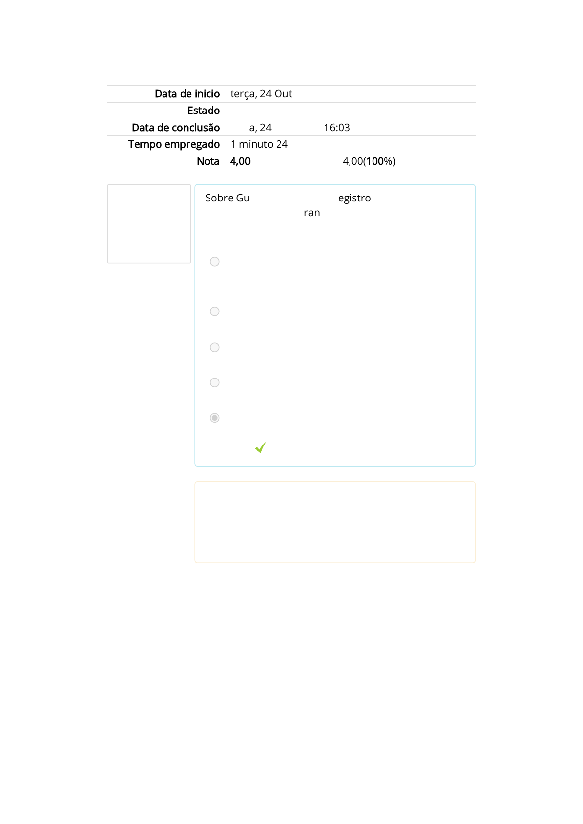 Questão 1 Correto Atingiu 1,00 de 1,00 O Ambiente e as Doenças do Trabalho C.A ► Ação ► ATIVIDADE DO ESTUDO DE CASO Data de inicio terça, 24 Out 2023, 16:02 Estado Finalizada Data de conclusão terça, 24 Out 2023, 16:03 Tempo empregado 1 minuto 24 segundos Nota 4,00 de um máximo de 4,00(100%) Sobre Gustavo ir fazer seu registro como Engenheiro em Segurança do Trabalho, é correto: Escolha uma: a. Por ser administrador de empresas, Gustavo pode ser Técnico em Segurança do Trabalho. b. A lei não define quem pode ser Engenheiro em Segurança do Trabalho. c. Ter nível superior é o único requisito para o registro. d. Não existe a profissão de Engenheiro em Segurança do Trabalho. e. Por não ser engenheiro e/ou arquiteto Gustavo não pode ter o registro, nos termos da lei. Sua resposta está correta. A resposta correta é: Por não ser engenheiro e/ou arquiteto Gustavo não pode ter o registro, nos termos da lei.. https://moodle.unicesumarpulse.com.br/course/view.php?id=1026 https://moodle.unicesumarpulse.com.br/mod/quiz/view.php?id=23142 Questão 2 Correto Atingiu 1,00 de 1,00 Questão 3 Correto Atingiu 1,00 de 1,00 No que se refere aos funcionários do setor de engarrafamento de bebidas, é correto que: Escolha uma: a. As suas condições de trabalho podem gerar doenças ocupacionais. b. Eram pessoas muito baixas e, por isso, achavam que as máquinas estavam altas. c. A empresa deveria contratar funcionários mais altos. d. Não causa dano algum à saúde trabalhar o tempo todo em pé. e. Não têm direito, em hipótese alguma, a mover ação judicial. Sua resposta está correta. A resposta correta é: As suas condições de trabalho podem gerar doenças ocupacionais.. Sobre o que Marisa respondeu ao Gustavo sobre segurança do trabalho e PPRA, é correto que: Escolha uma: a. As empresas não têm obrigação de se preocupar com segurança do trabalho. b. Marisa está errada, pois o PPRA é um documento obrigatório e segurança do trabalho são atividades que devem existir em todas as empresas. c. Como empresária, Marisa está certa. d. Marisa errou sobre o PPRA, mas está certa sobre o setor de segurança do trabalho. e. Marisa errou sobre o setor de segurança do trabalho, mas está certa sobre o PPRA, pois esse não é um documento obrigatório. Sua resposta está correta. A resposta correta é: Marisa está errada, pois o PPRA é um documento obrigatório e segurança do trabalho são atividades que devem existir em todas as empresas.. Questão 4 Correto Atingiu 1,00 de 1,00 Pode-se depreender do caso que: Escolha uma: a. Gustavo, por ser muito jovem, não entendeu as razões de Marisa. b. Os funcionários da empresa eram preguiçosos. c. A empresa de bebidas não respeitava as normas de segurança e higiene do trabalho. d. Marisa é uma empresária modelo quanto à segurança no trabalho. e. Sônia era a chefe de Marisa e Gustavo. Sua resposta está correta. A resposta correta é: A empresa de bebidas não respeitava as normas de segurança e higiene do trabalho..