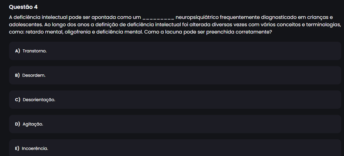 Questão 4 A deficiência intelectual pode ser apontada como um neuropsiquiátrico frequentemente diagnosticado em crianças e adolescentes. Ao longo dos anos a definição de deficiência intelectual foi alterada diversas vezes com vários conceitos e terminologias, como: retardo mental, oligofrenia e deficiência mental. Como a lacuna pode ser preenchida corretamente? A) Transtorno. B) Desordem. c) Desorientação. D) Agitação. E) Incoerência.